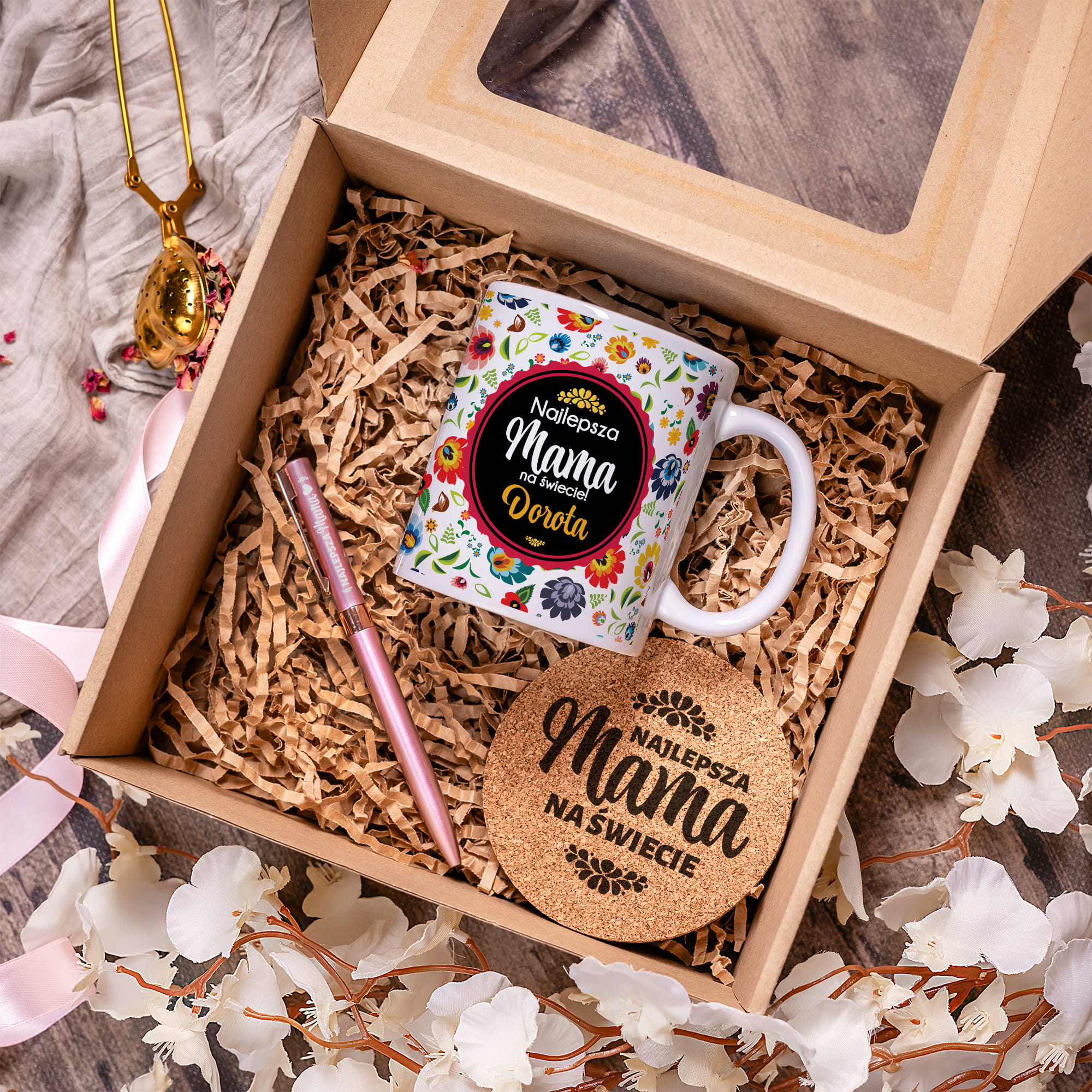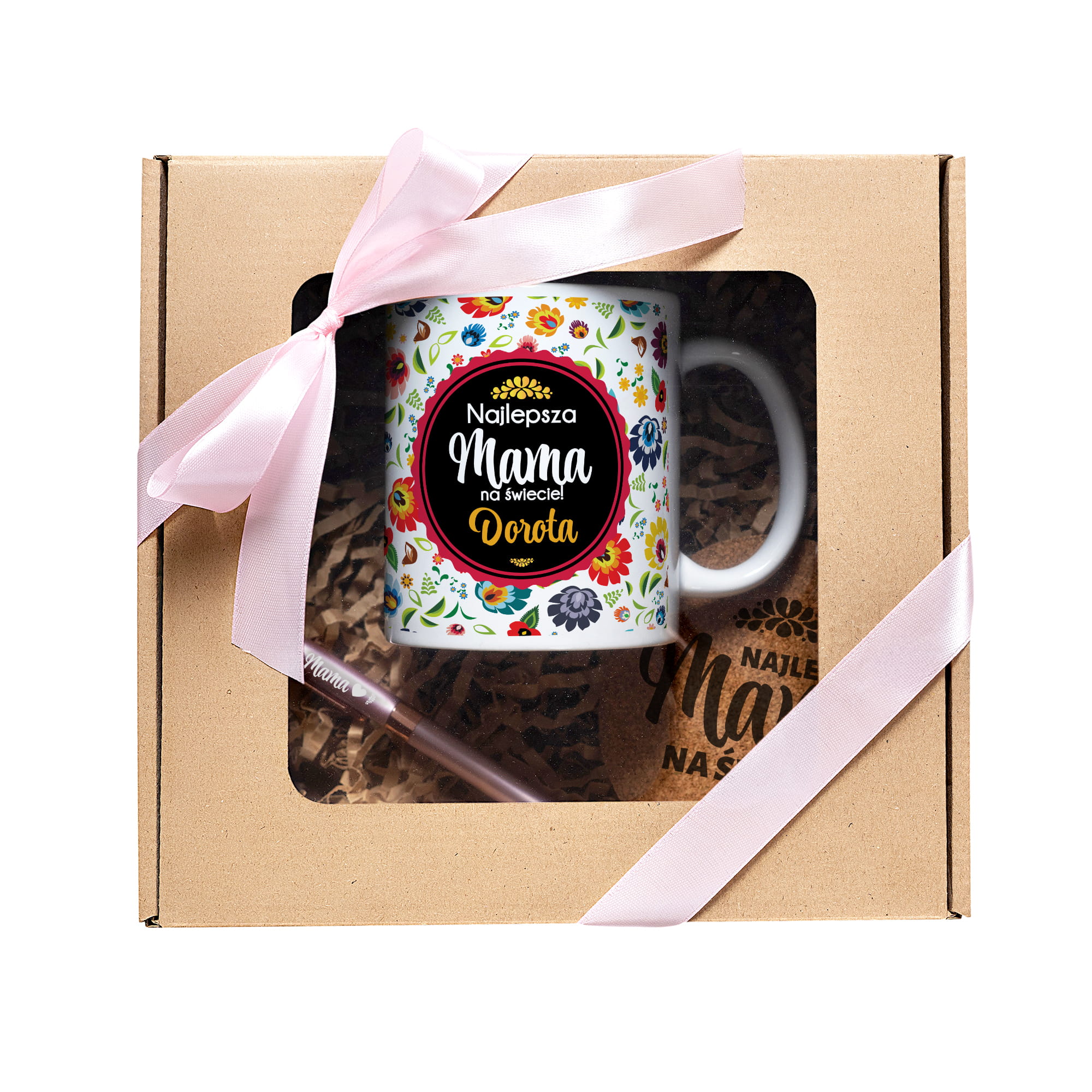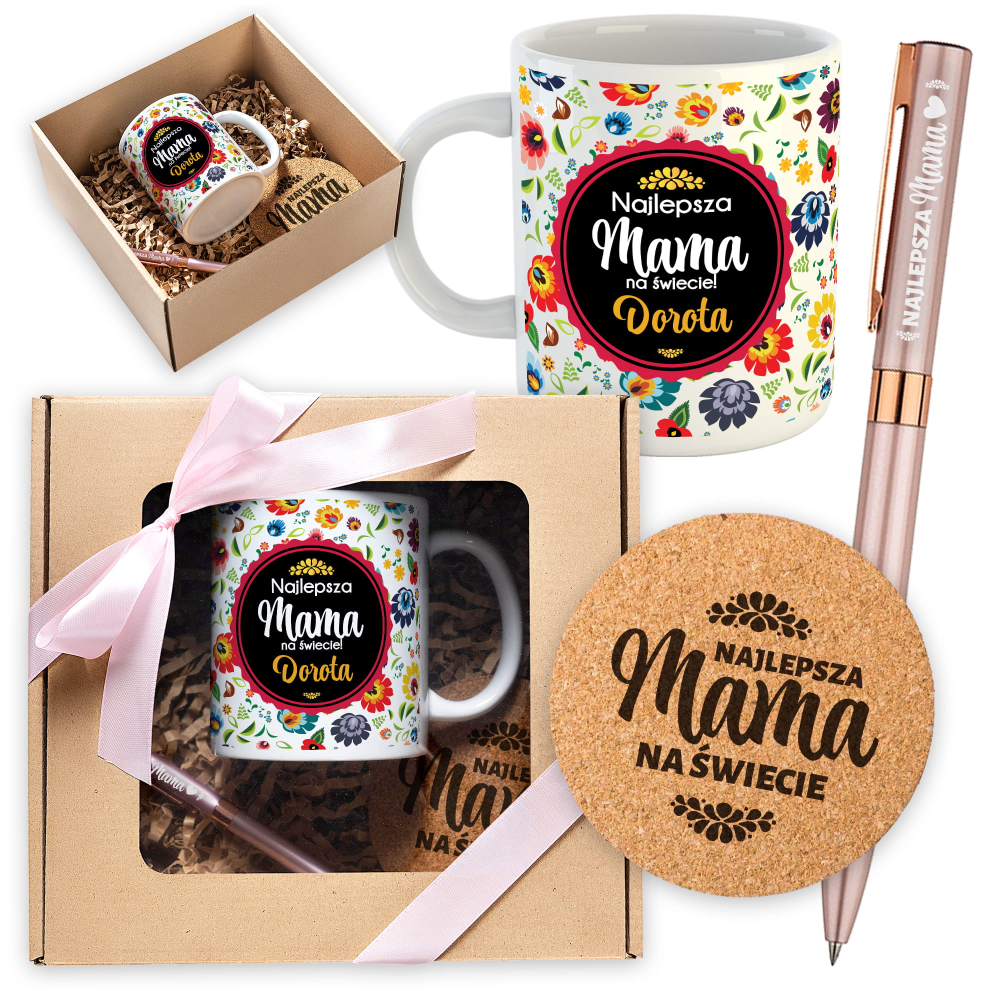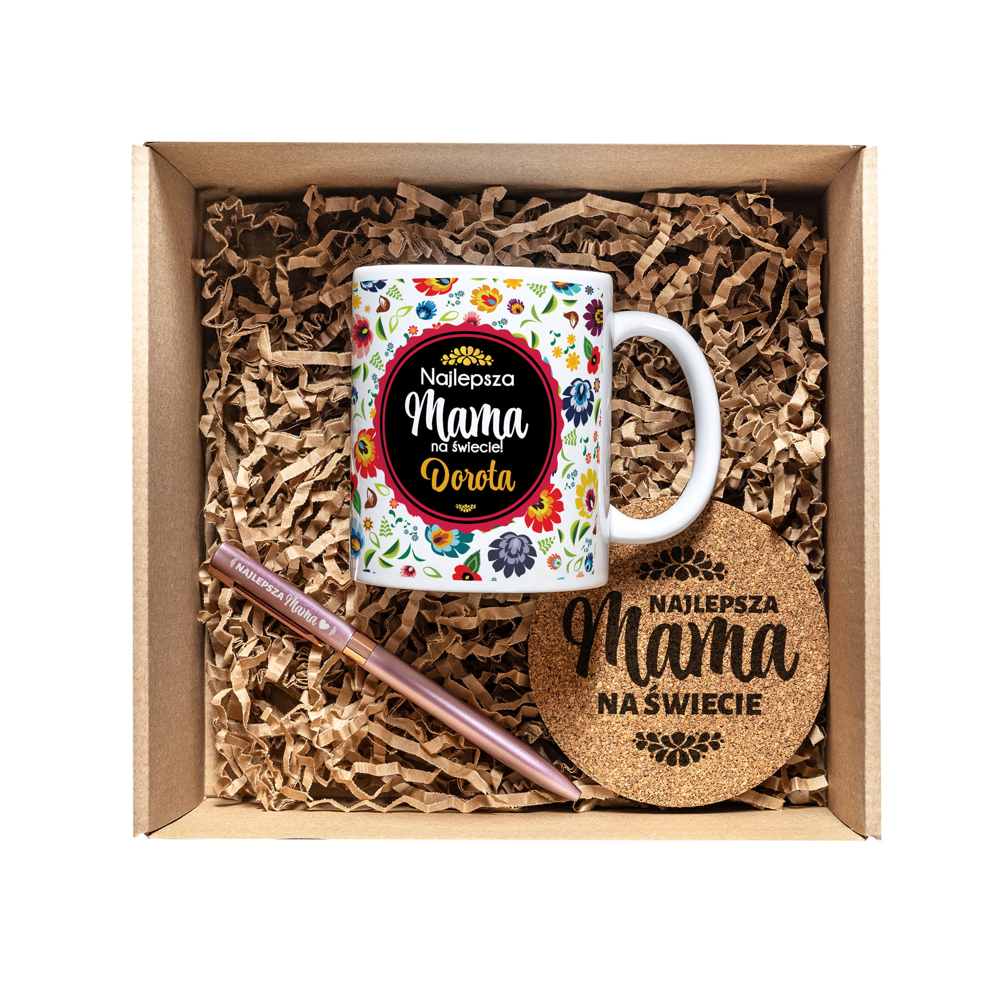 Kubek i Długopis z Grawerem dla Mamy - Prezent na Dzień Matki - Zestaw Prezentowy Kubek + Długopis + Podkładka - Folk