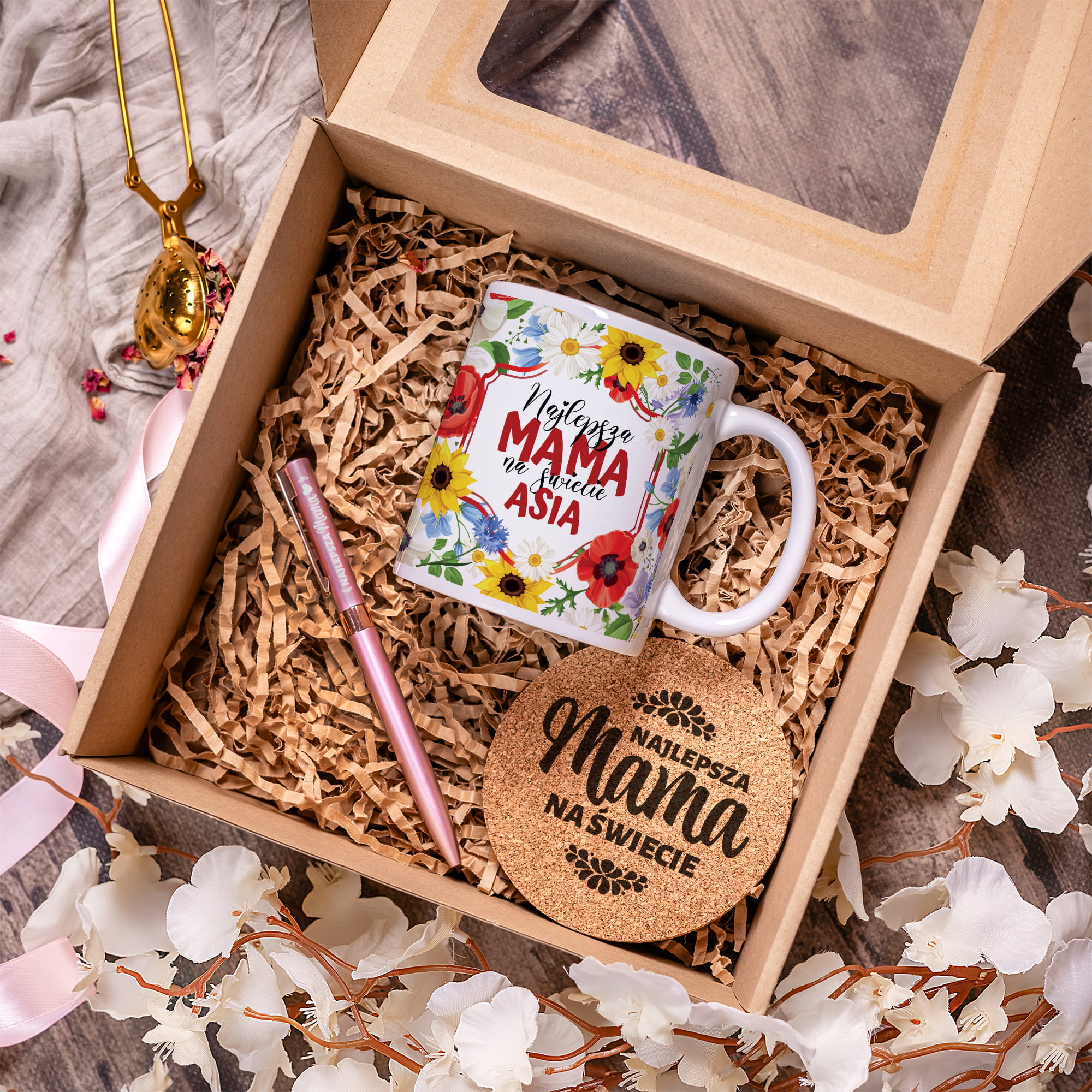Kubek i Długopis z Grawerem dla Mamy - Prezent na Dzień Matki - Zestaw Prezentowy Kubek + Długopis + Podkładka - Wildflowers