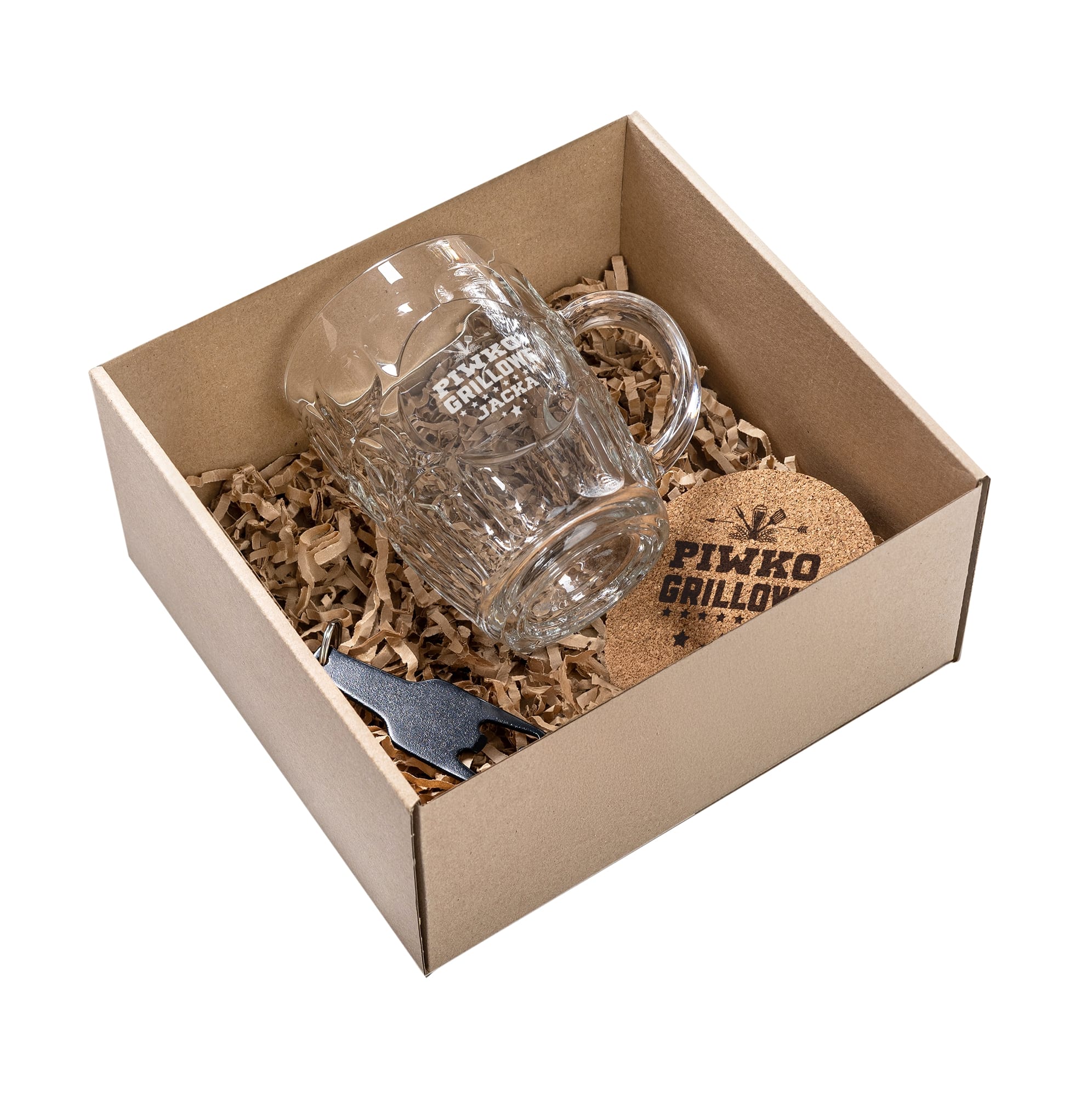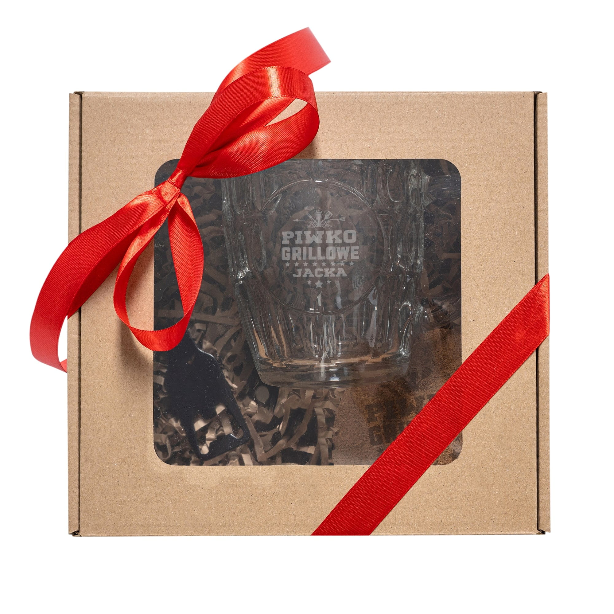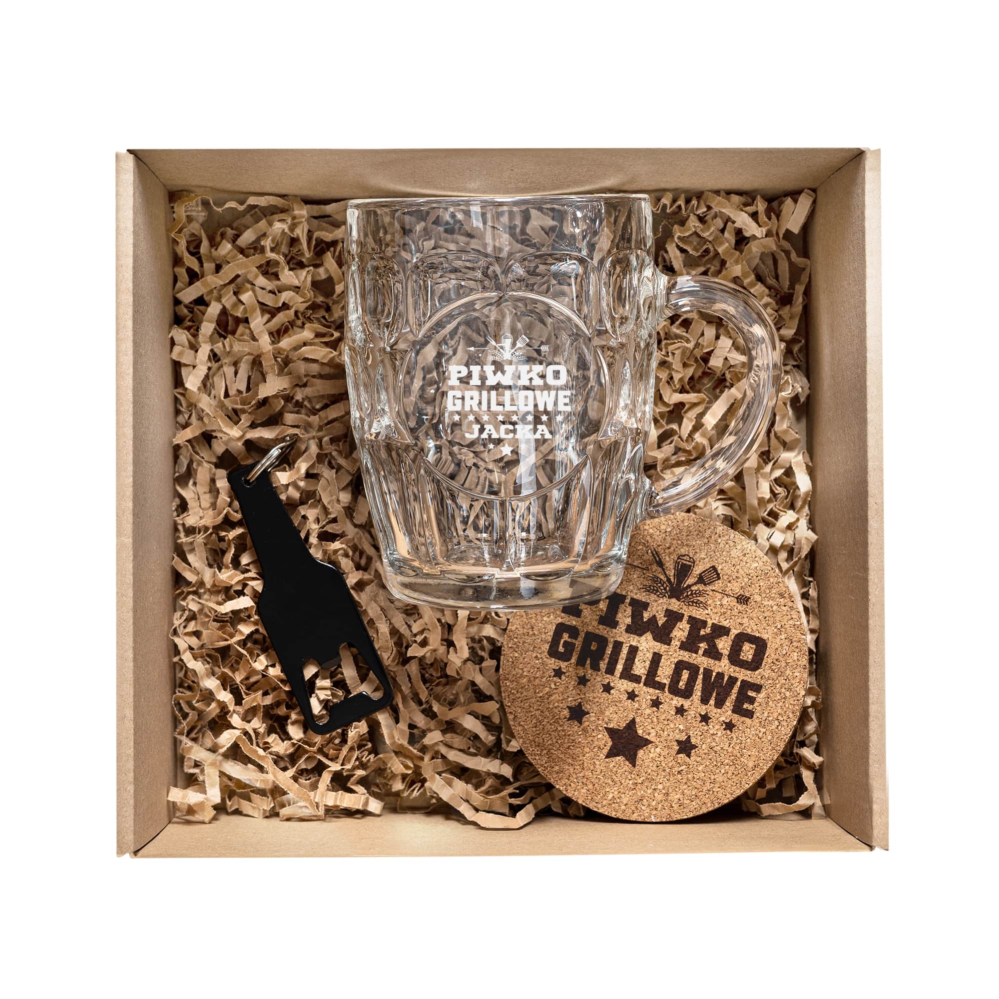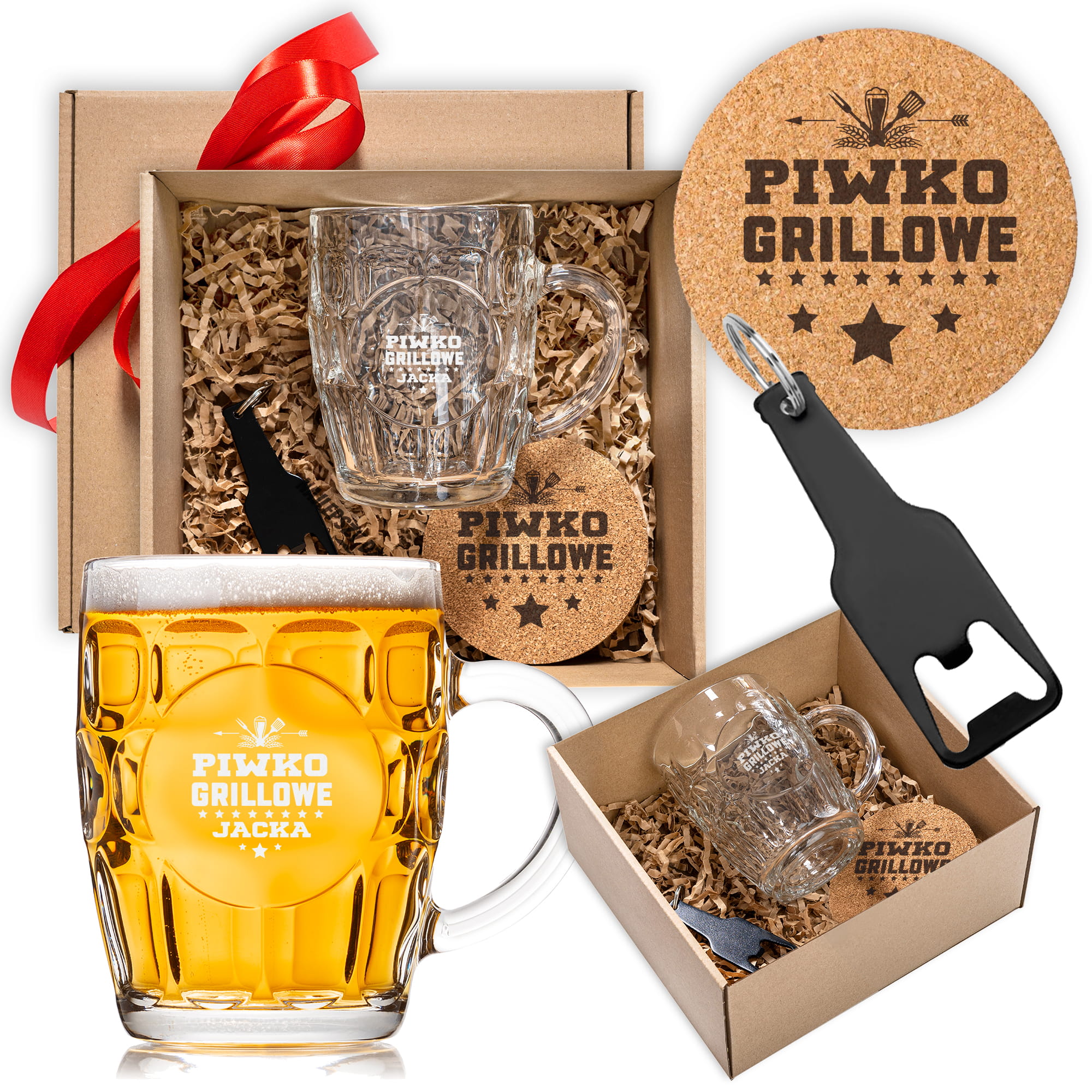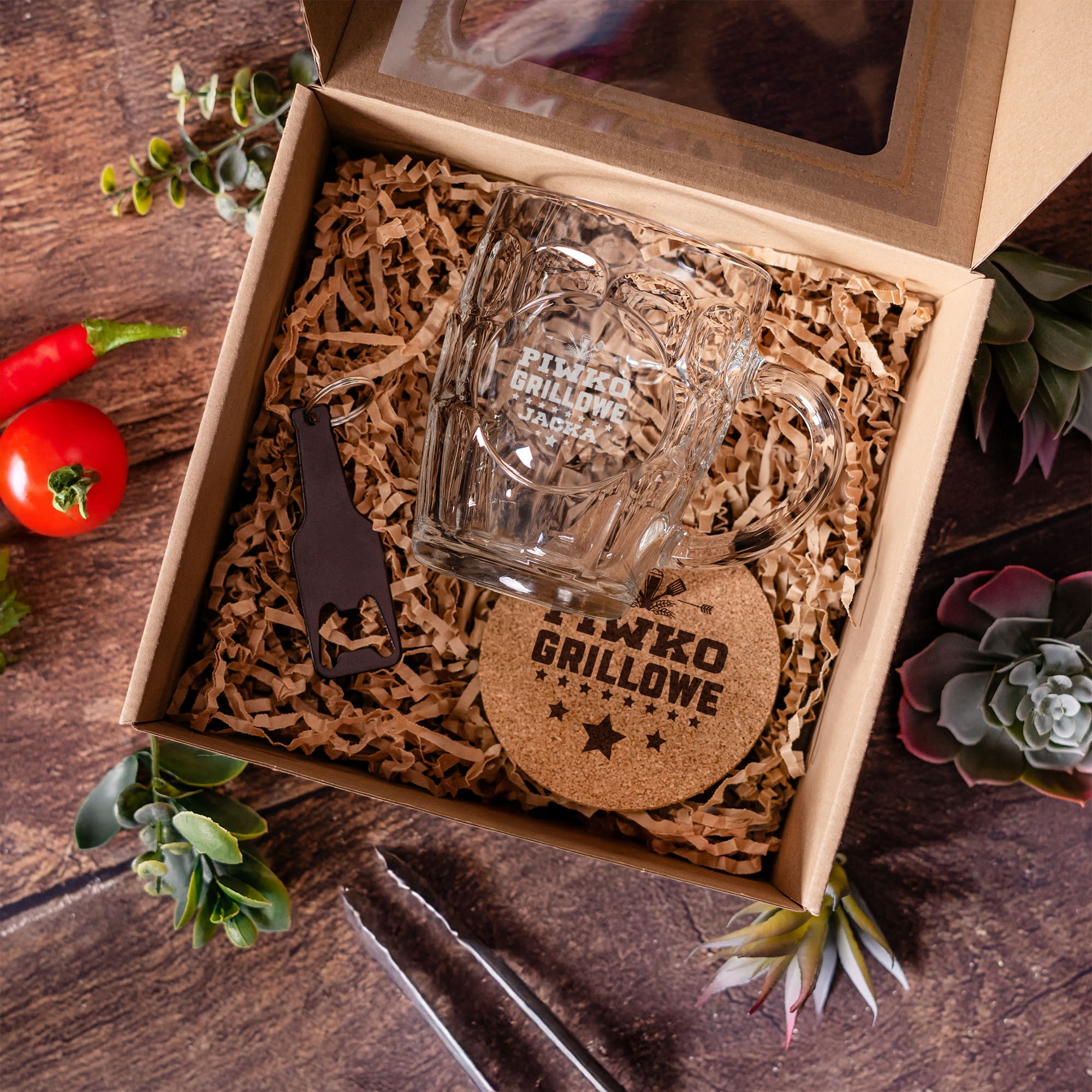 Kufel z Grawerem Do Piwa - Zestaw Grillowy na Prezent - Zestaw Prezentowy - Kufel + Podkładka + Otwieracz Butelka - Piwko Grillowe