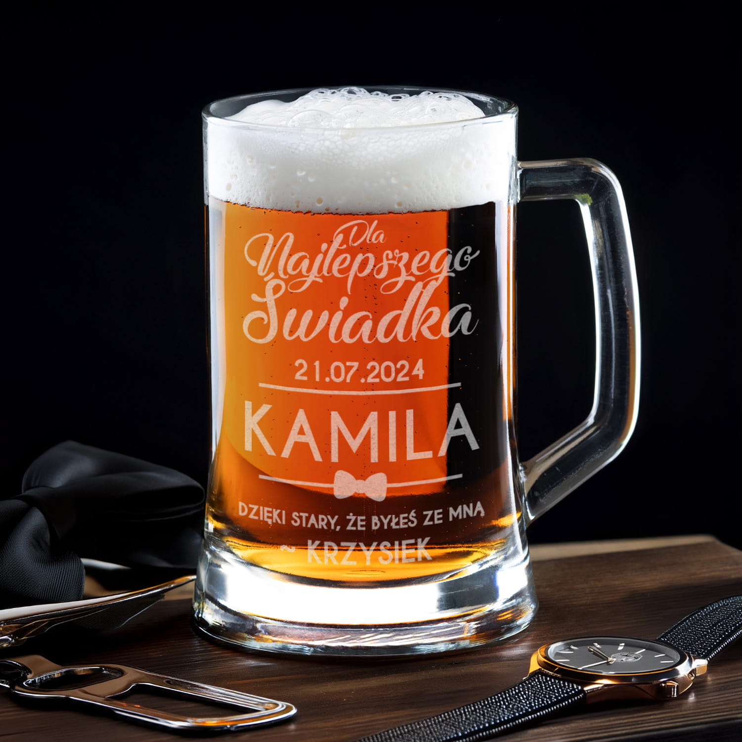 ⭐ Kufel do piwa z grawerem będzie idealnym pomysłem, aby podziękować Twojemu świadkowi za jego wsparcie w nietuzinkowy i zabawny sposób.