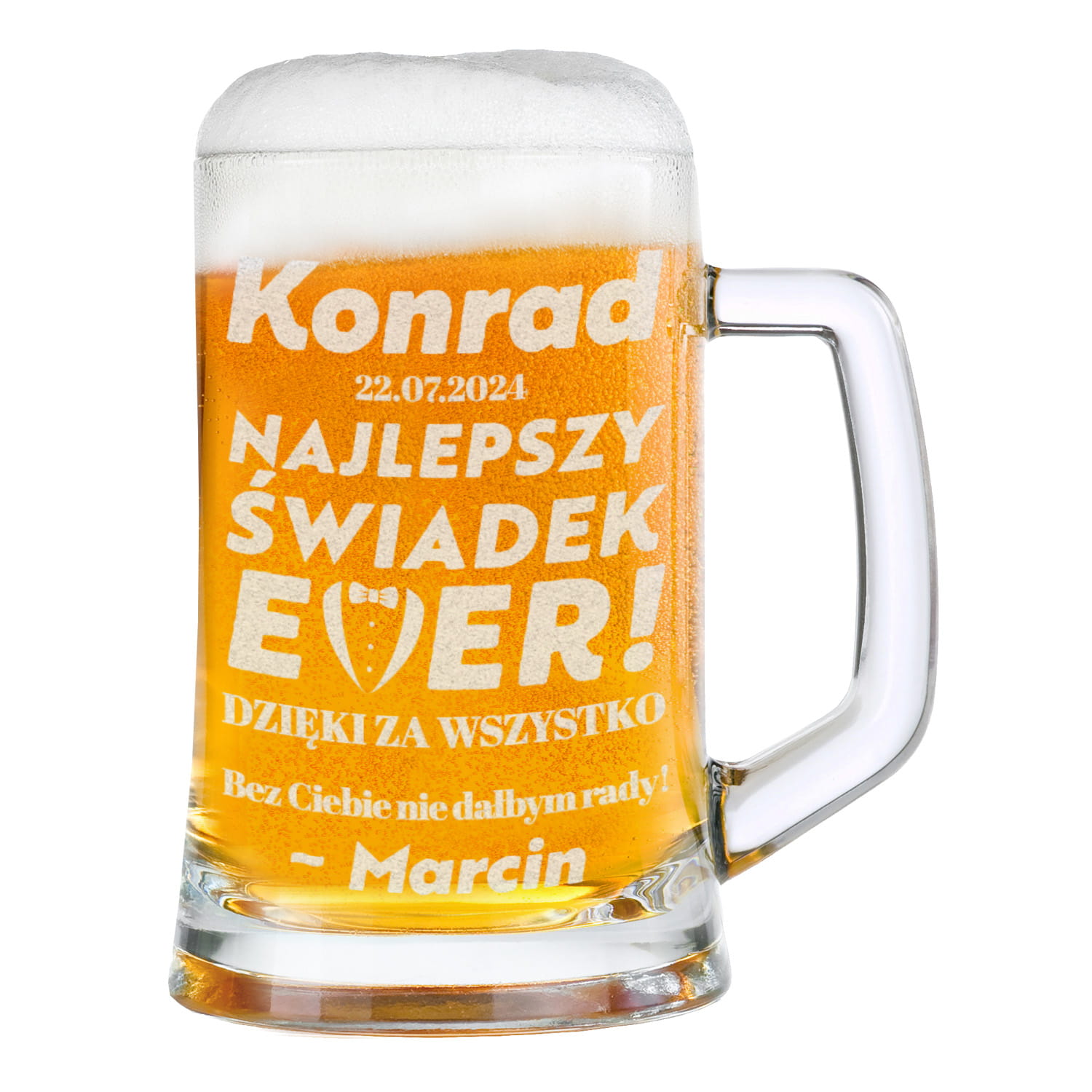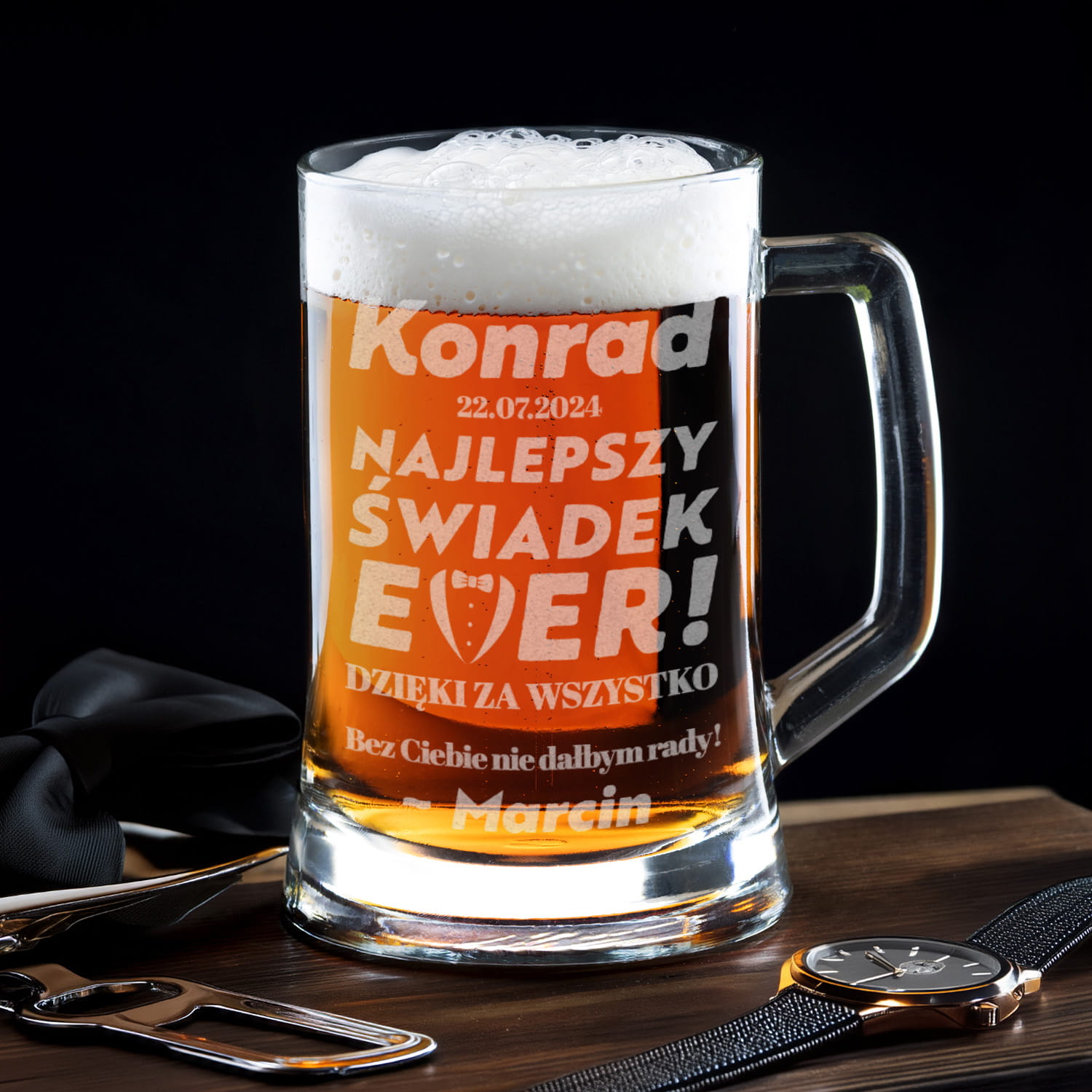 ⭐ Kufel do piwa z grawerem będzie idealnym pomysłem, aby podziękować Twojemu świadkowi za jego wsparcie w nietuzinkowy i zabawny sposób.