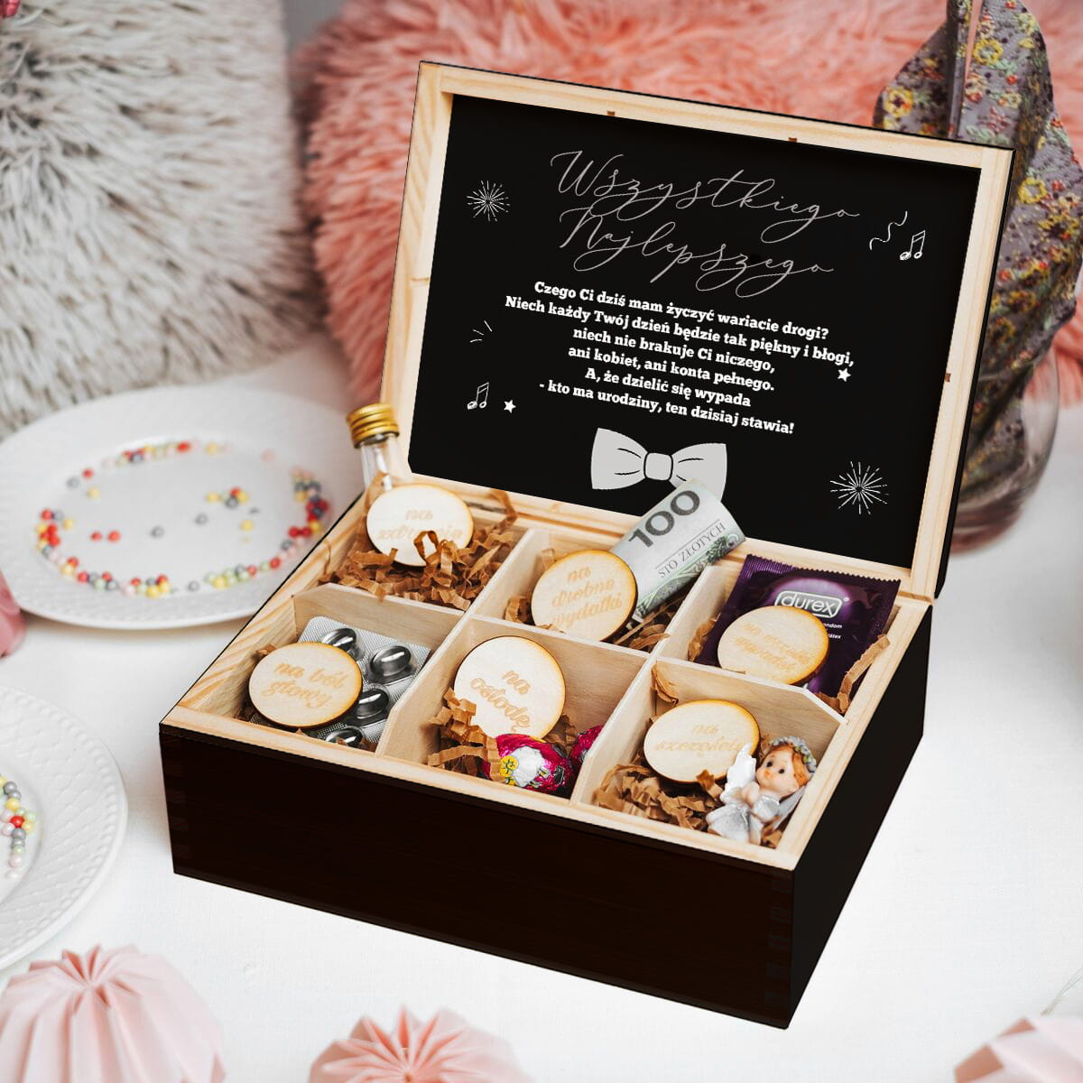 Pudełko wykonane jest z drewna oraz sklejki wysokiej jakości. Zamiast decydować się na standardowe podarunki, wybierz efektowny personalizowany prezent.