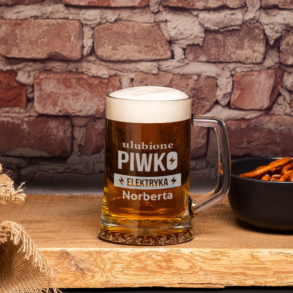 Kufel wykonany jest z grubego szkła, dzięki czemu jest wytrzymały i posłuży na długie lata. Prezent dla elektryka z personalizacją to zawsze strzał w dziesiątkę! Wygodny i stabilny kufel zmieści całą standardową butelkę piwa razem z pianką.