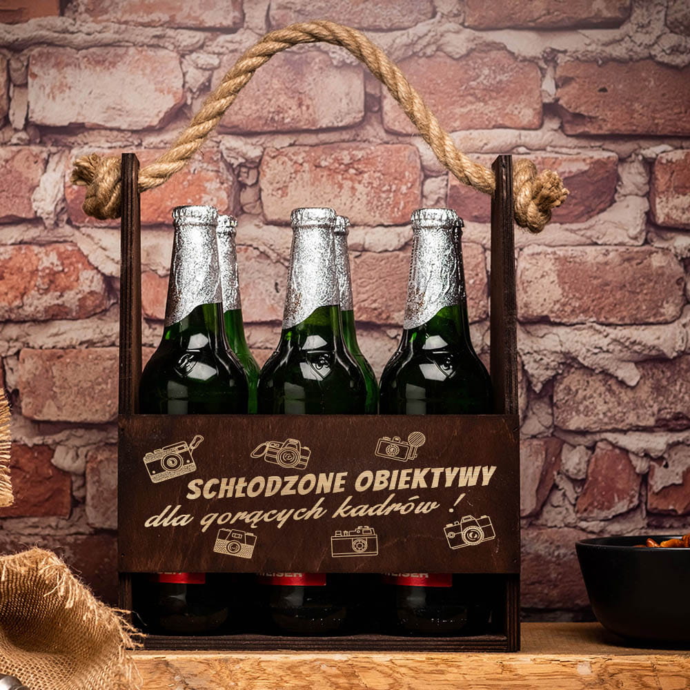 Drewniane nosidło na piwo to bardzo praktyczny pojemnik na alkohol, dzięki któremu każda impreza będzie udana. Obdarowany fotograf będzie mógł wziąć ze sobą piwo i delektować się nim w każdym miejscu. Nosidło na piwo to doskonały prezent dla niego, który może zabrać ze sobą na spotkanie z kolegami, na grilla, na działkę albo na wyjazd ze znajomymi.