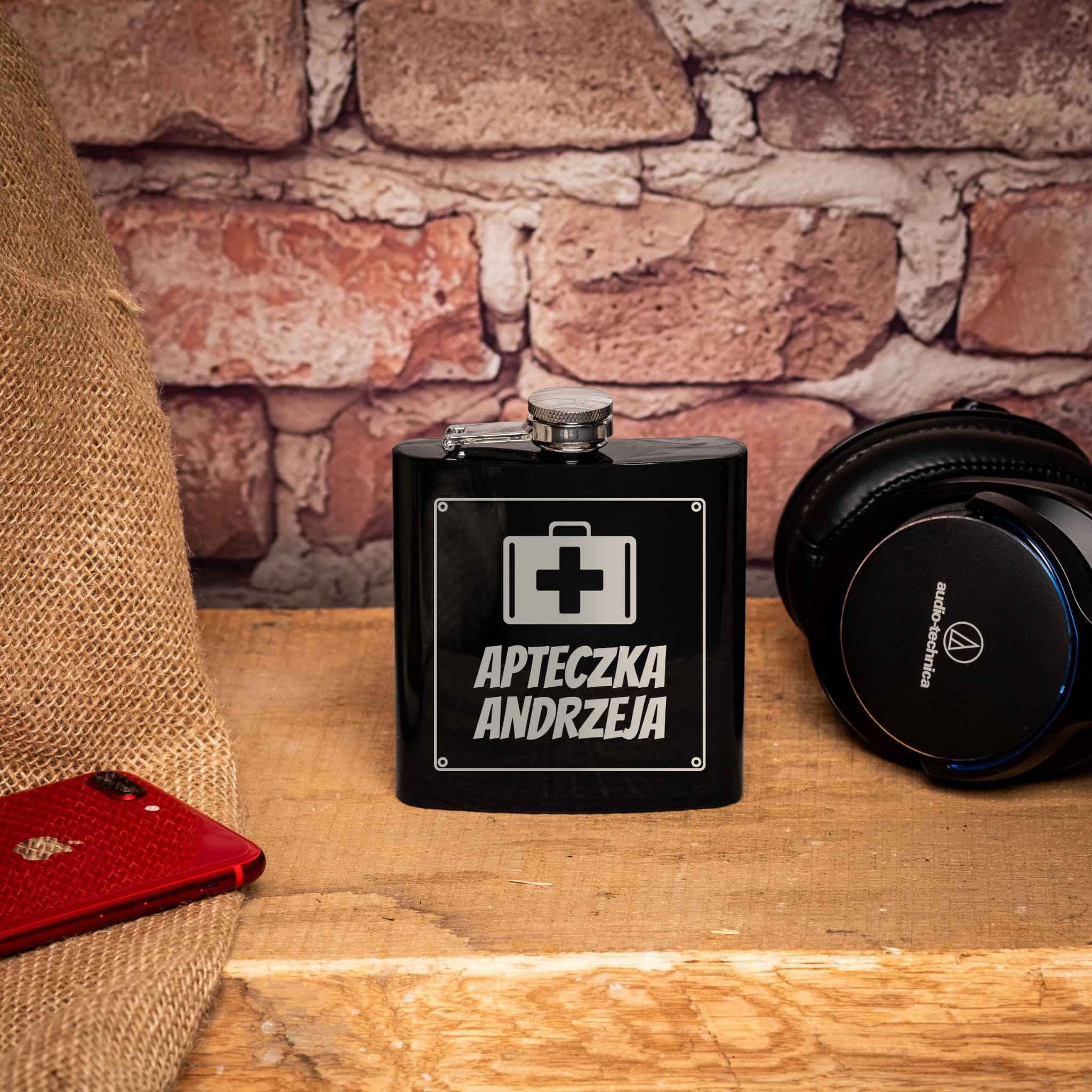 Wybierz prezent dla niego, który będzie jedyny w swoim rodzaju – czarną piersiówkę z grawerem Apteczka z imieniem.