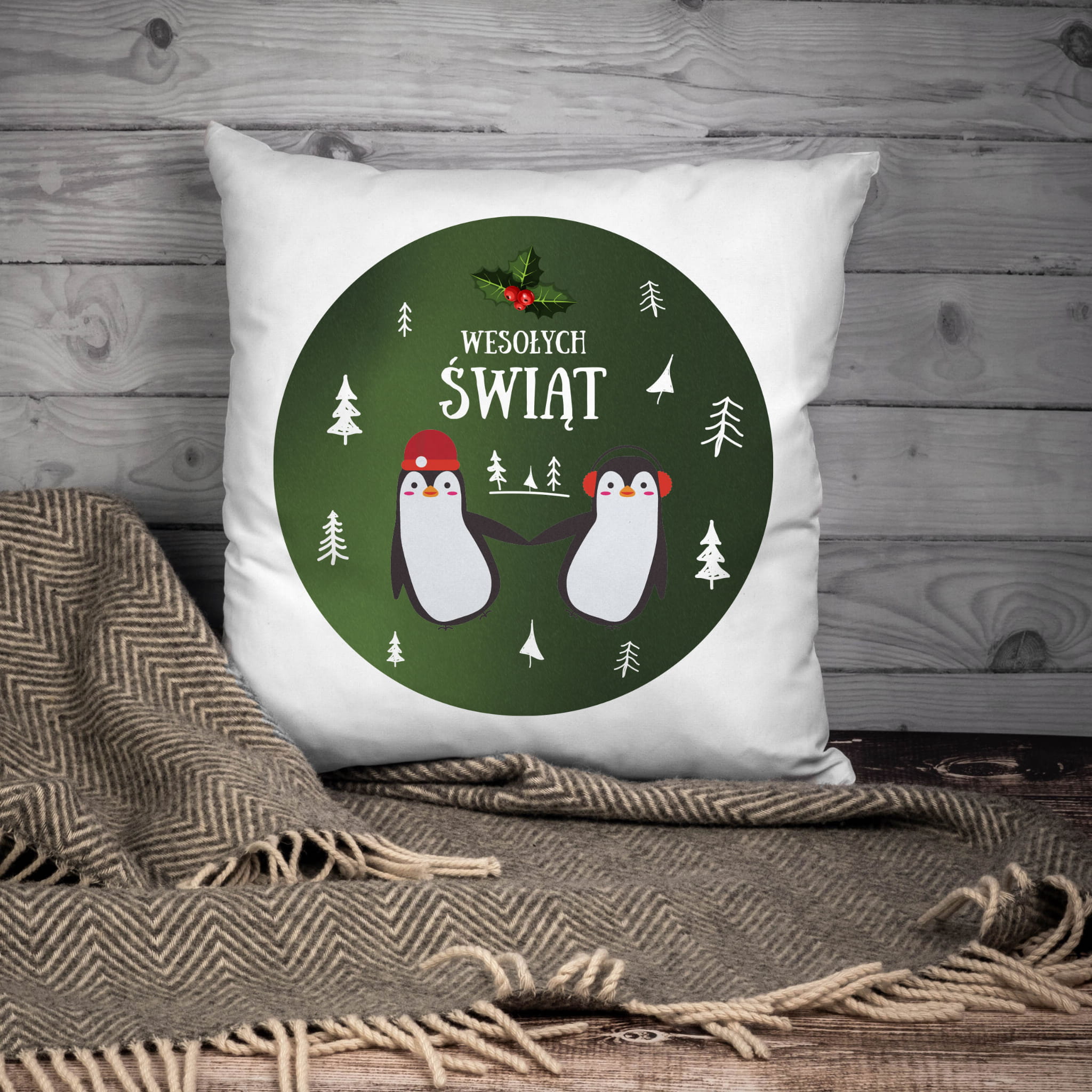 Poduszka Świąteczna z Nadrukiem - Prezent na Święta - Wesołych Świąt Pingwinki