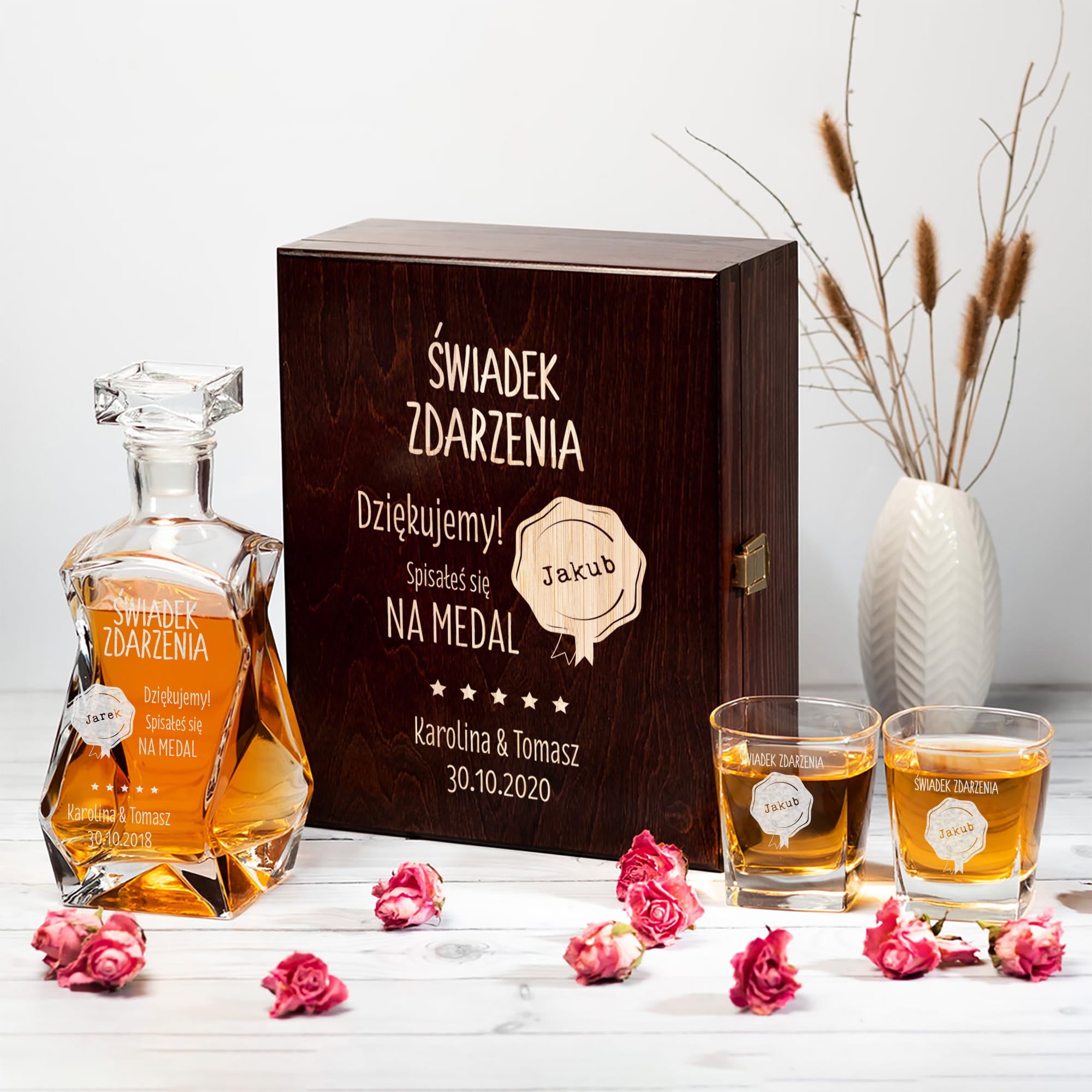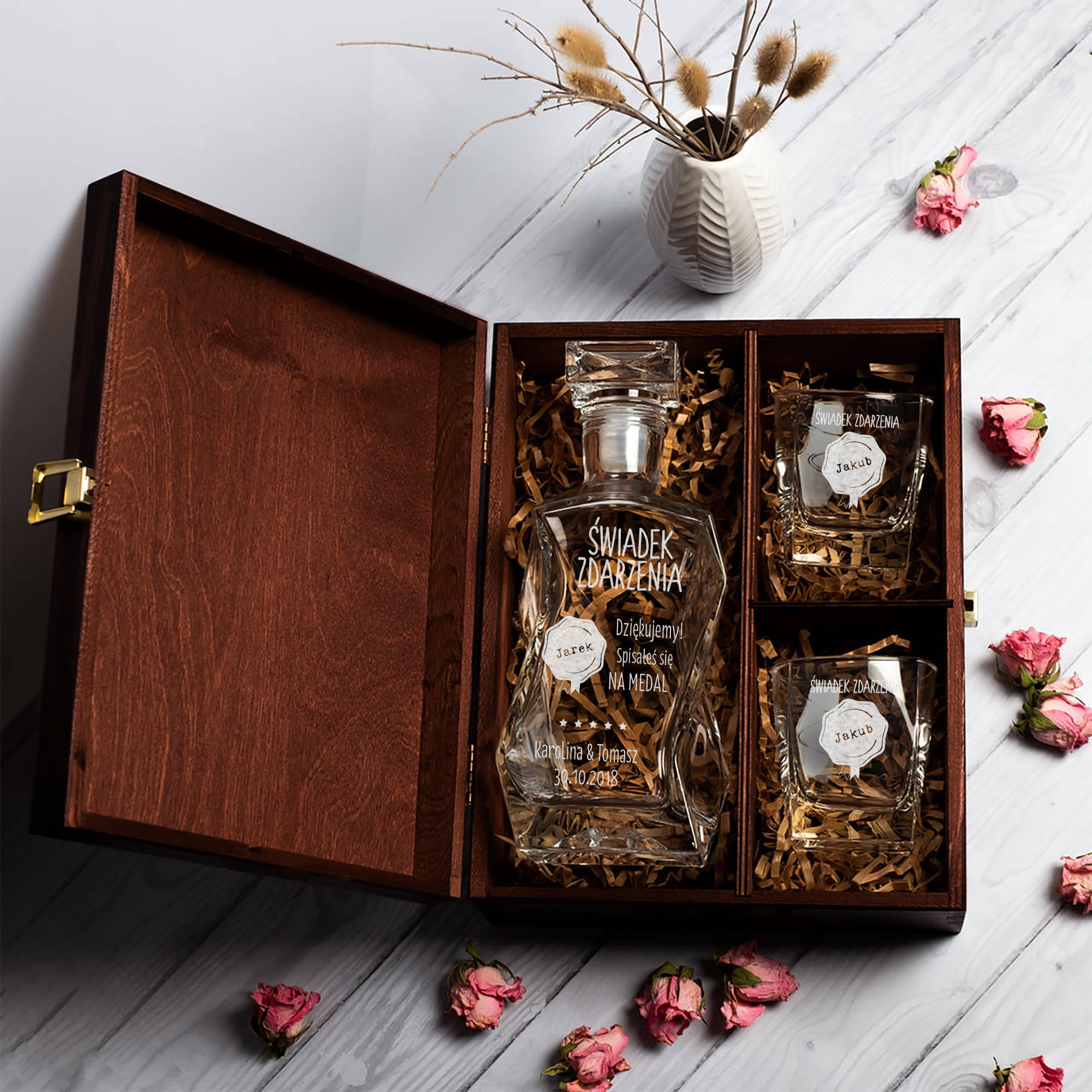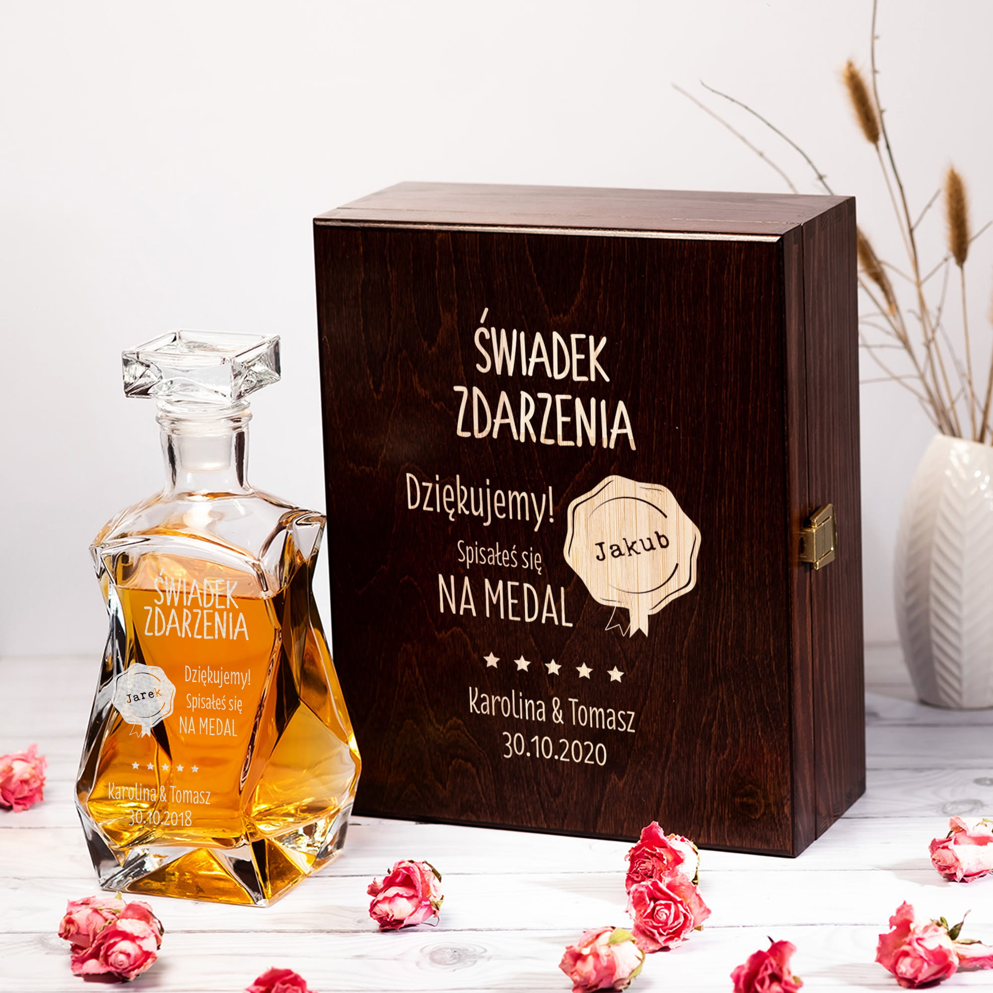 Chcesz, aby Twoje podziękowanie dla świadka było jedyne w swoim rodzaju? Podaruj mu personalizowaną karafkę do whisky i szklanki w skrzynce z grawerem Świadek Zdarzenia Dziękujemy.