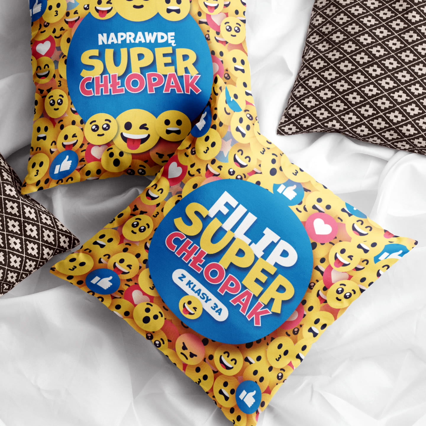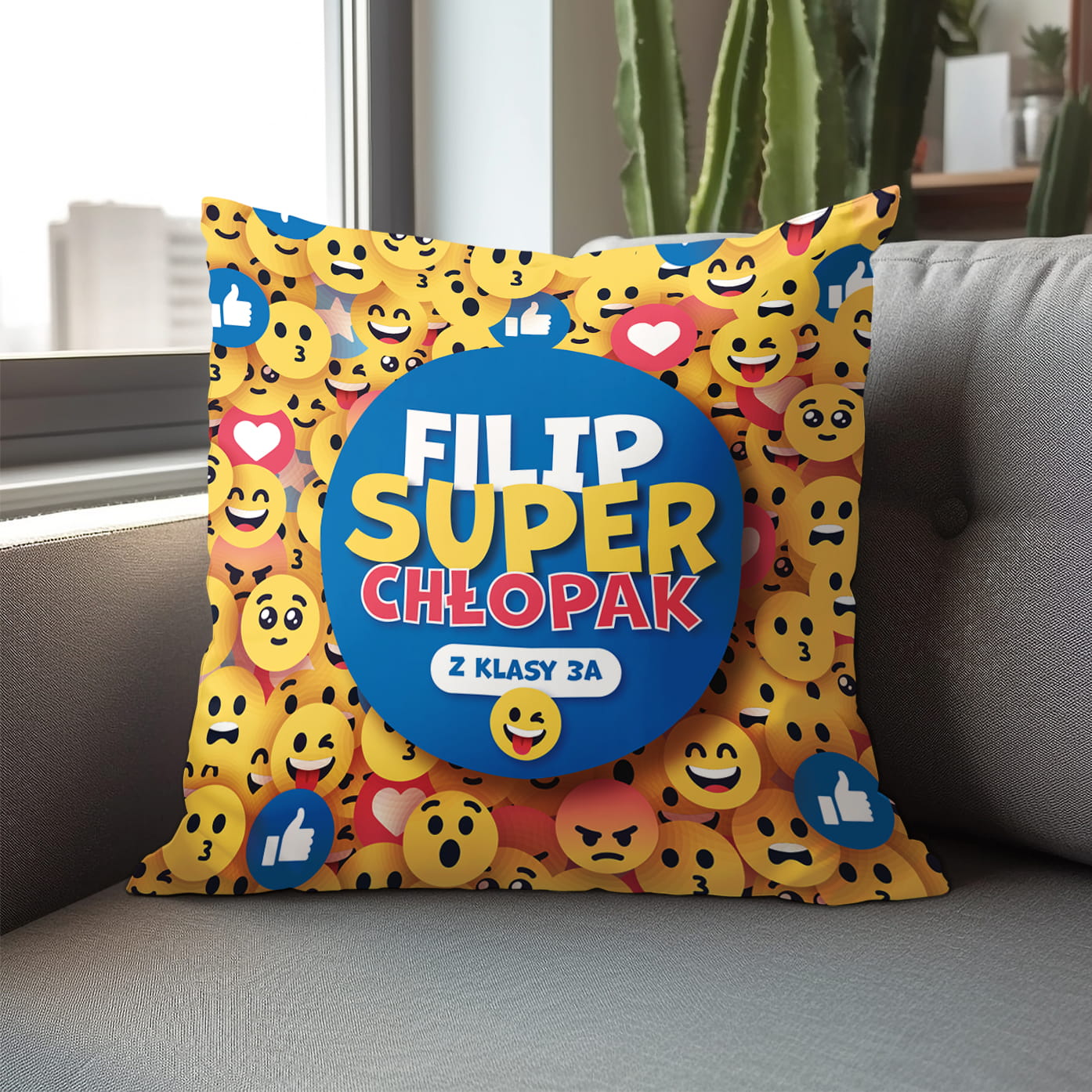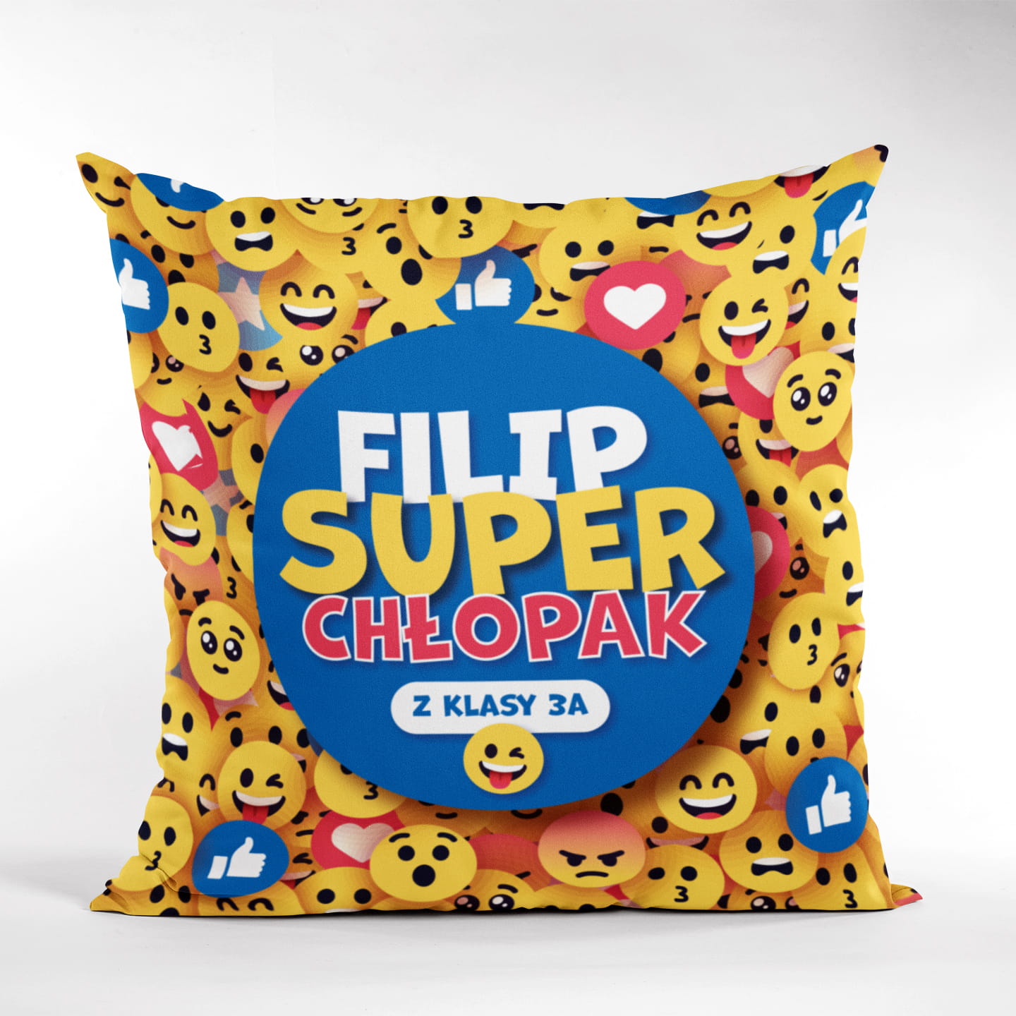 Prezent na Dzień Chłopaka w Klasie - Kolorowa Poduszka z Imieniem dla Chłopaka - Super Chłopak Emoji