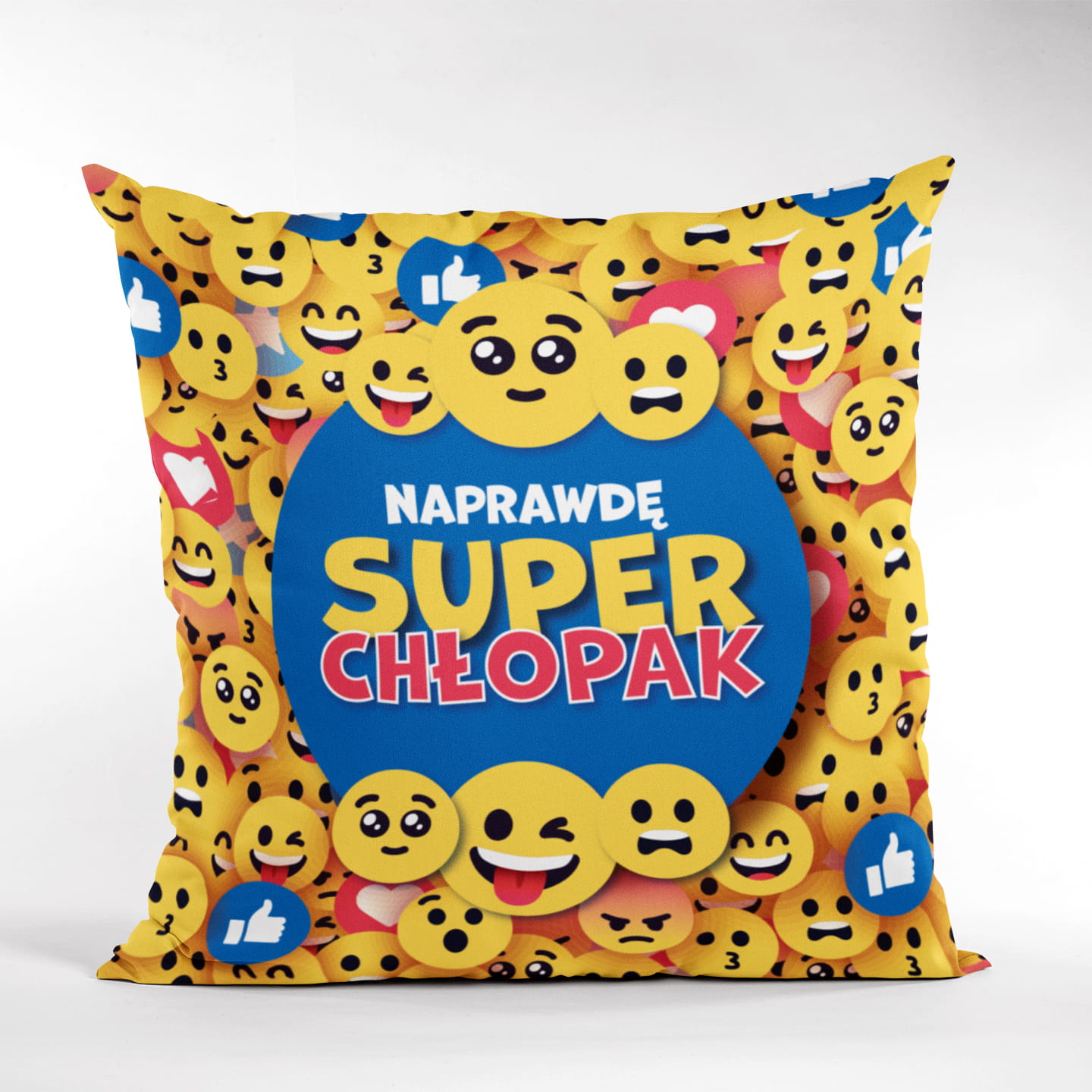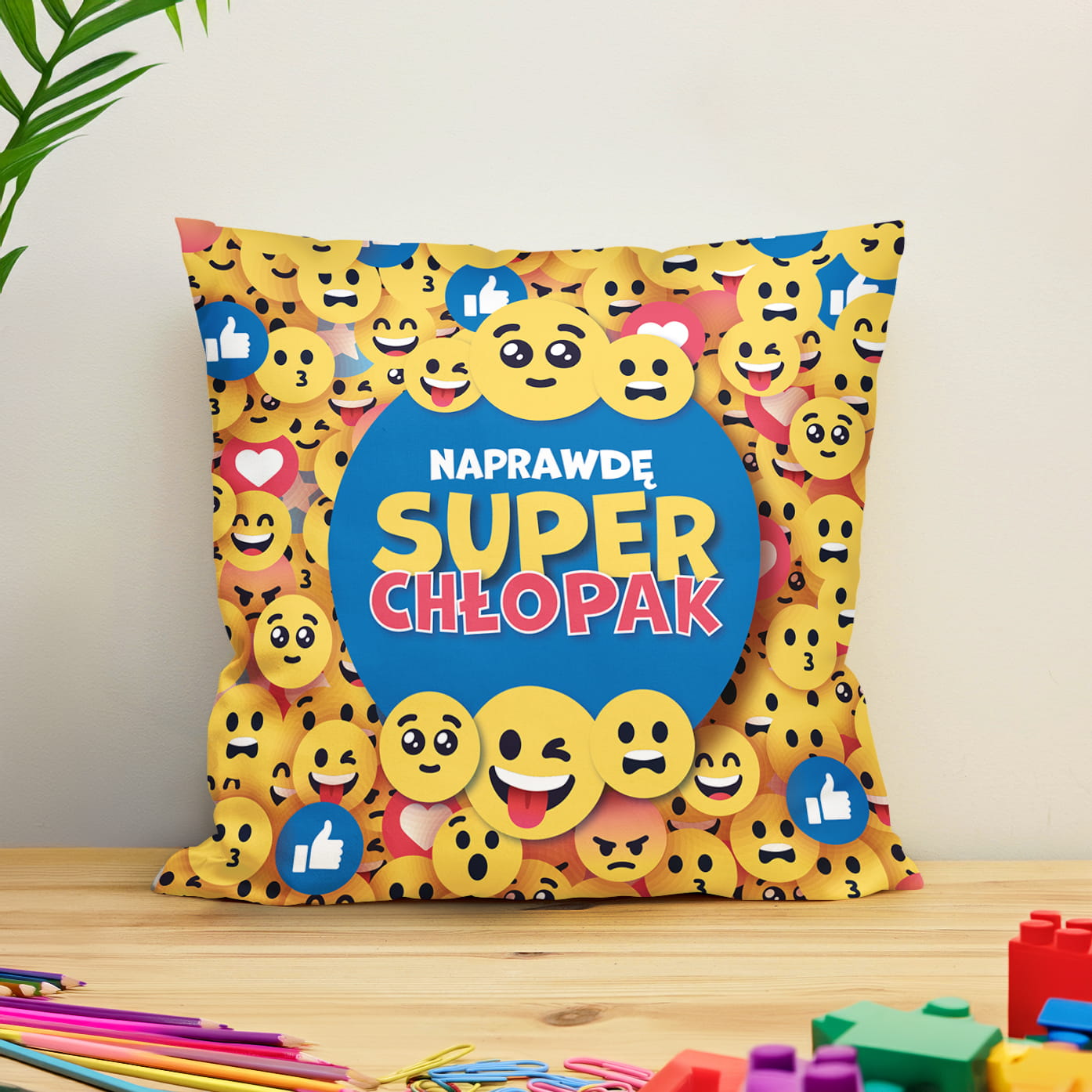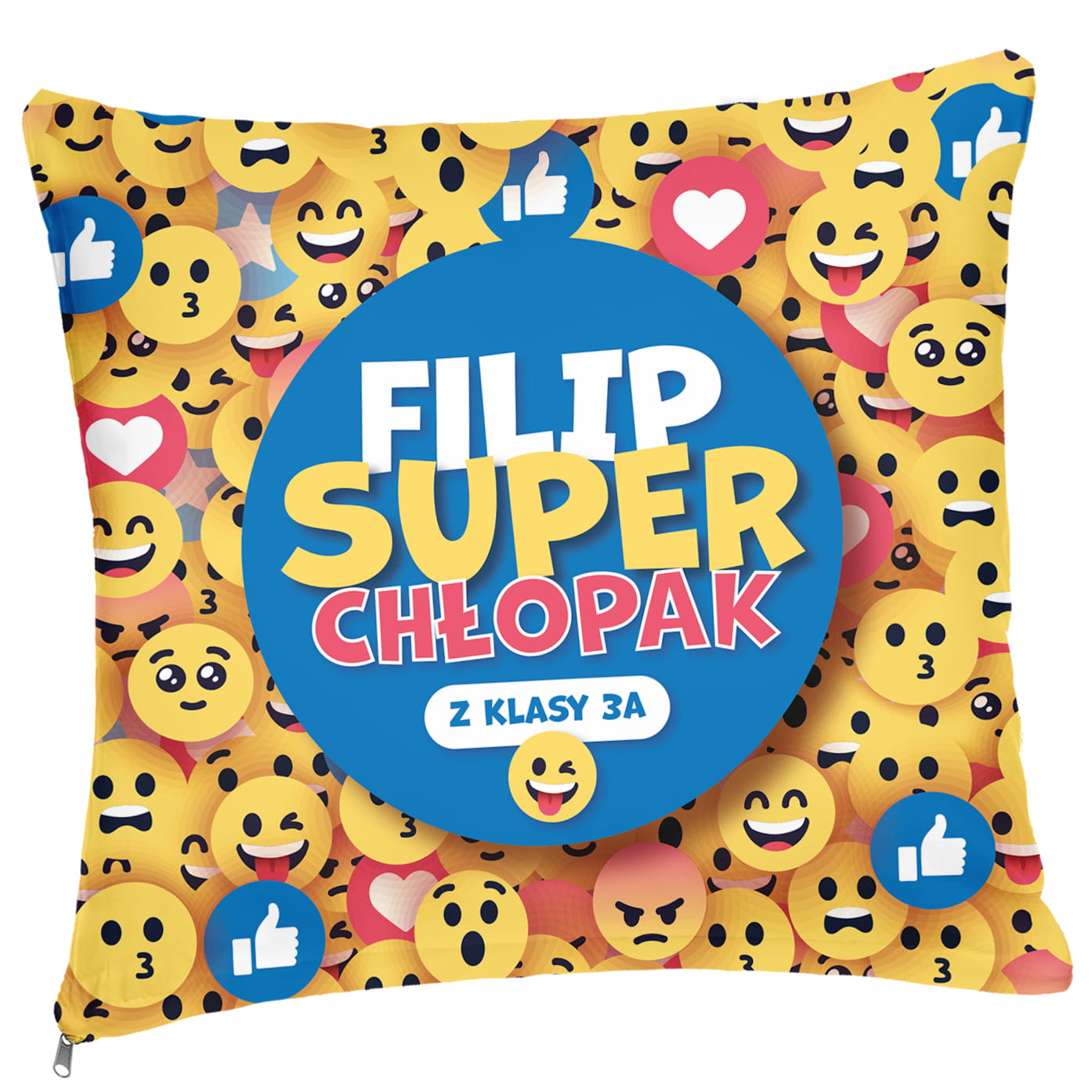 Prezent na Dzień Chłopaka w Klasie - Kolorowa Poduszka z Imieniem dla Chłopaka - Super Chłopak Emoji