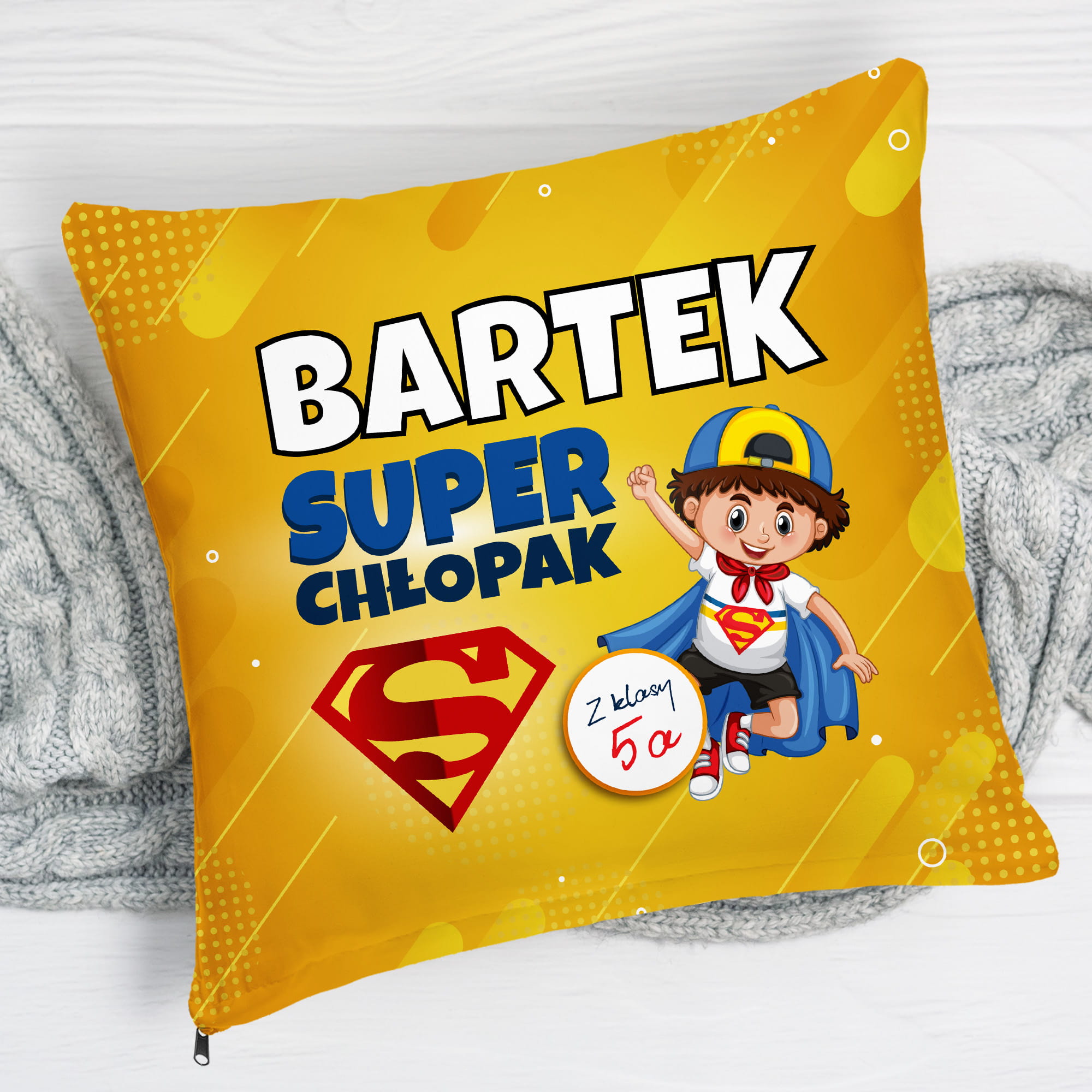 Prezent na Dzień Chłopaka w Klasie - Poduszka Kolorowa z Imieniem dla Chłopaka - Super Chłopak
