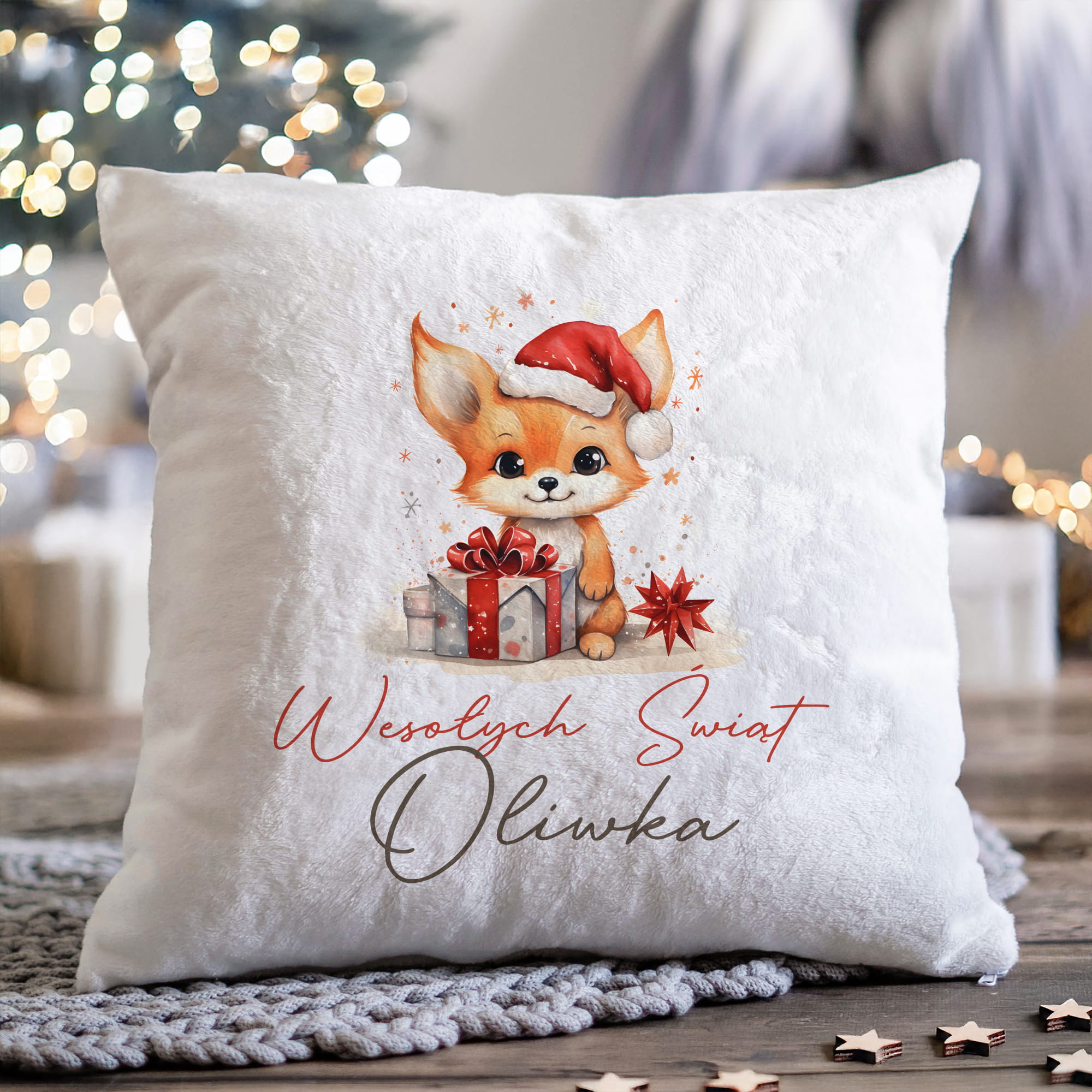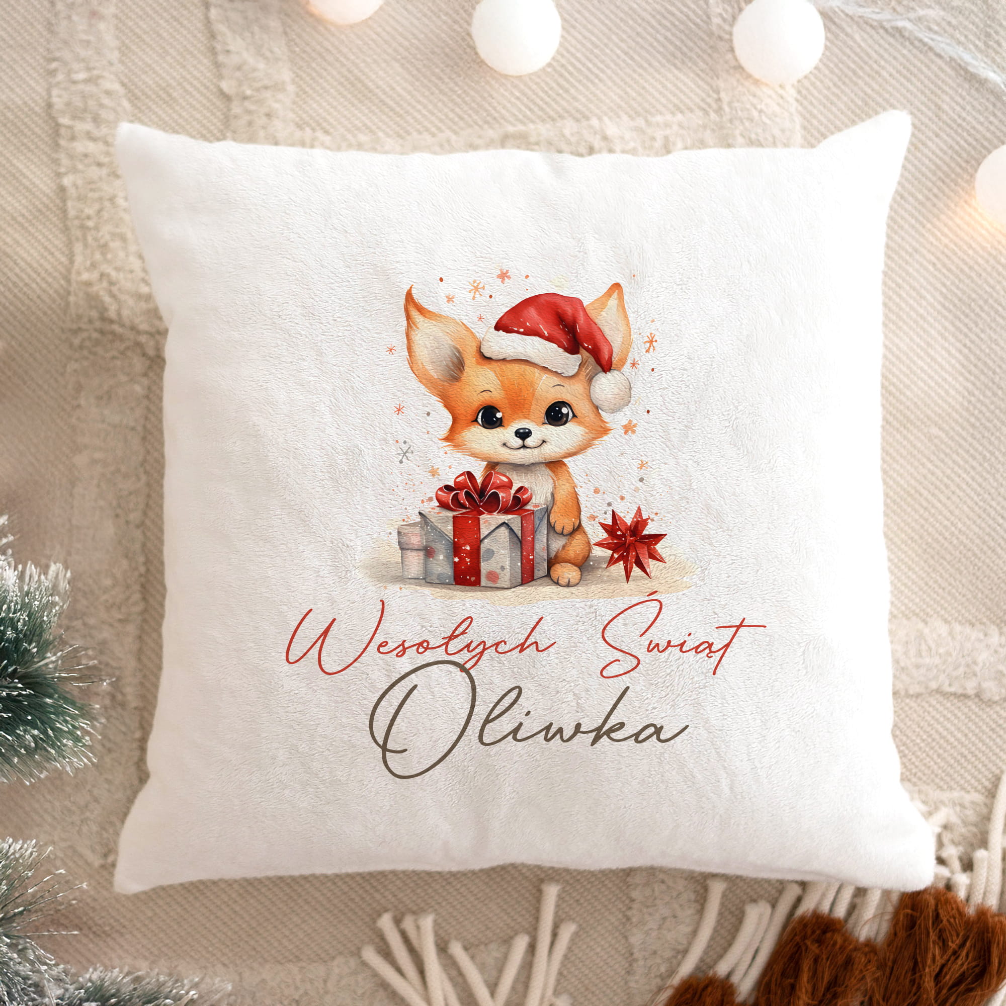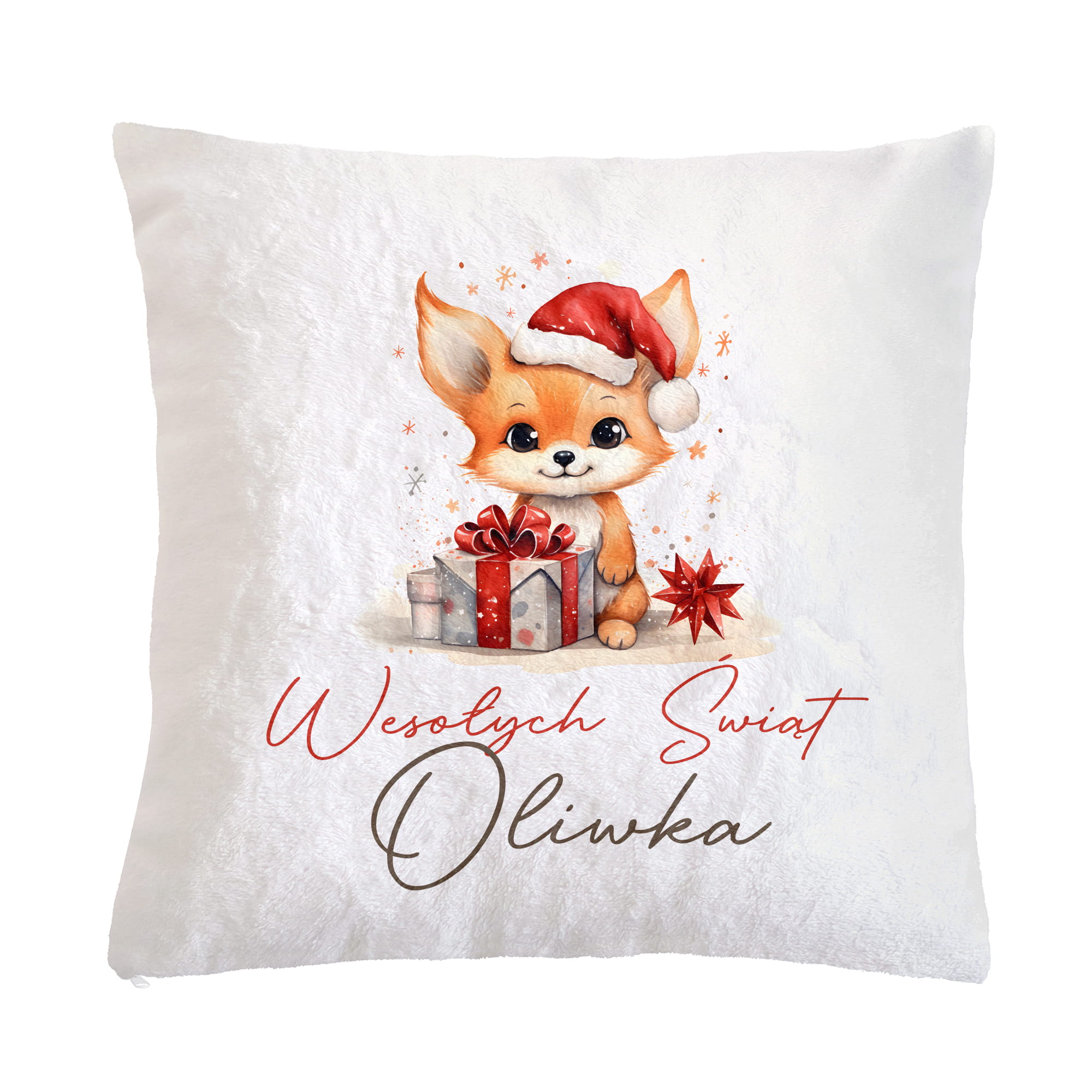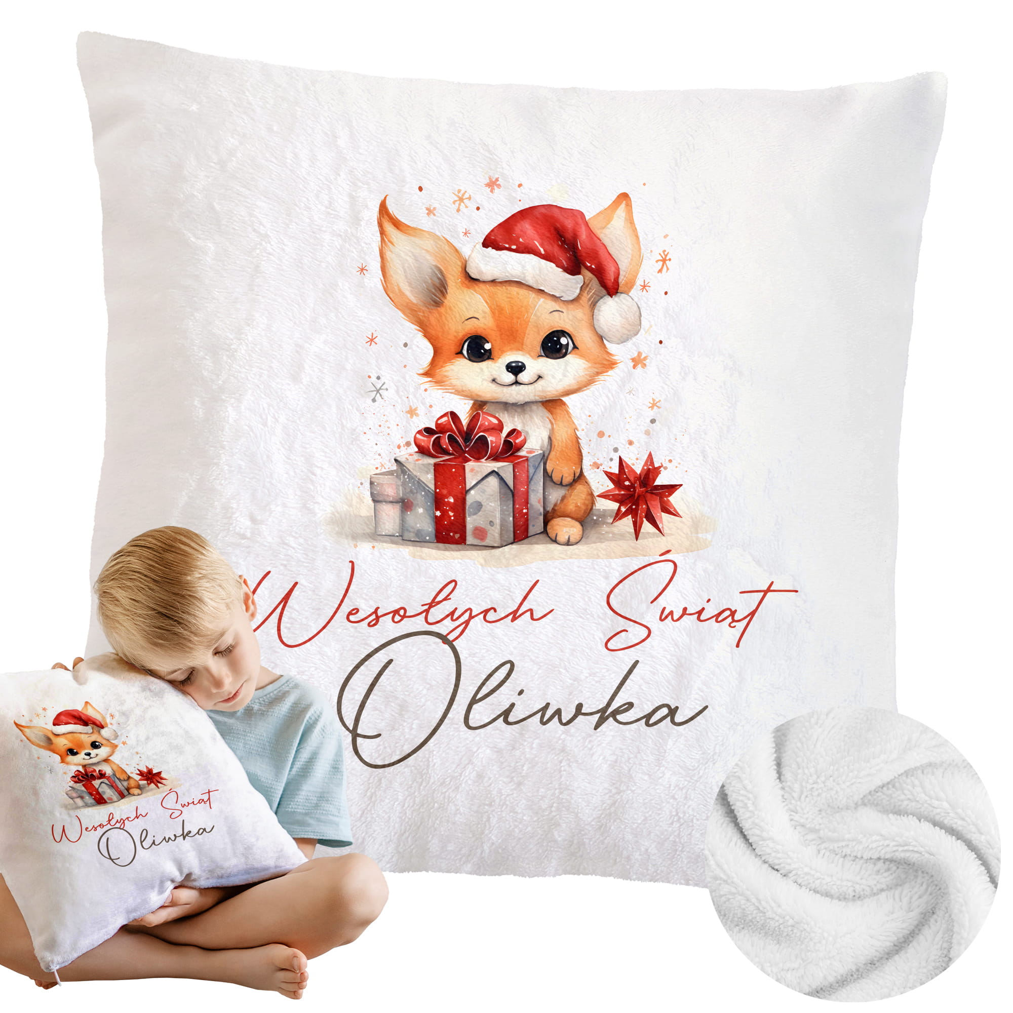 Prezent na Mikołajki Święta dla Dziecka - Mikołajkowa Poduszka Pluszowa Minky z Imieniem - Lisek Biała