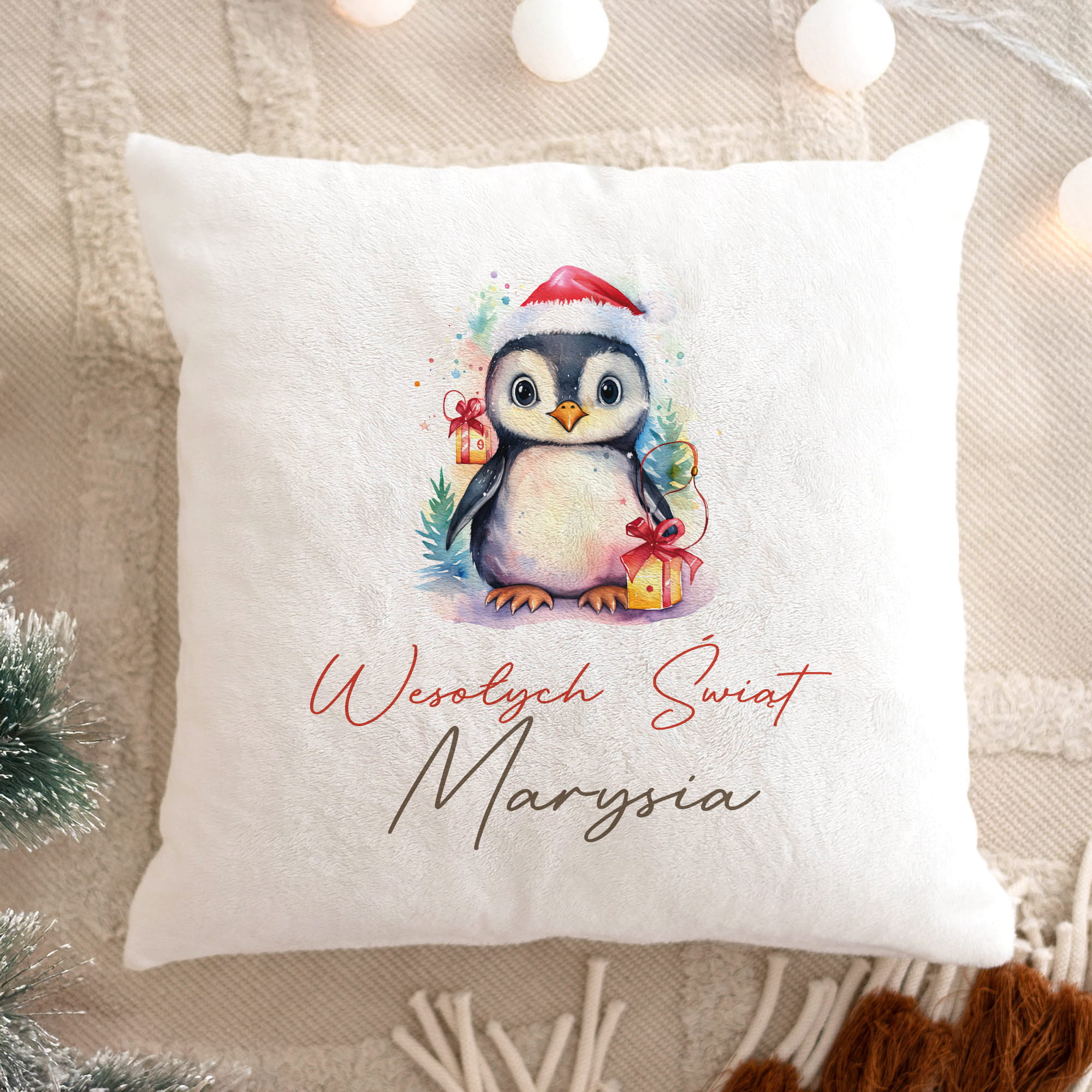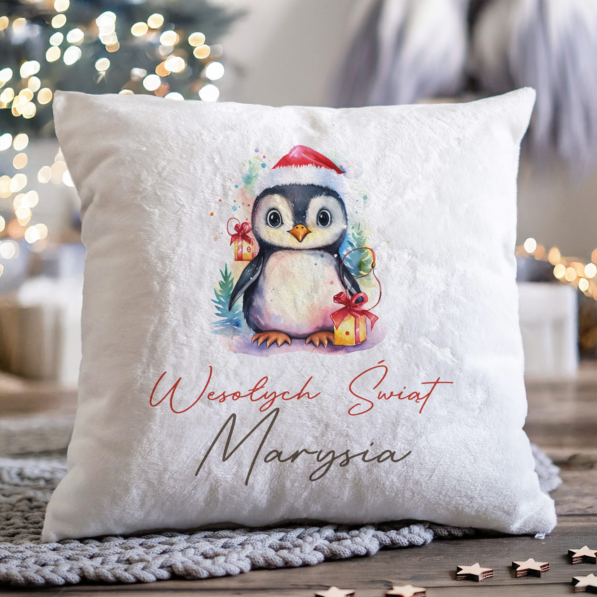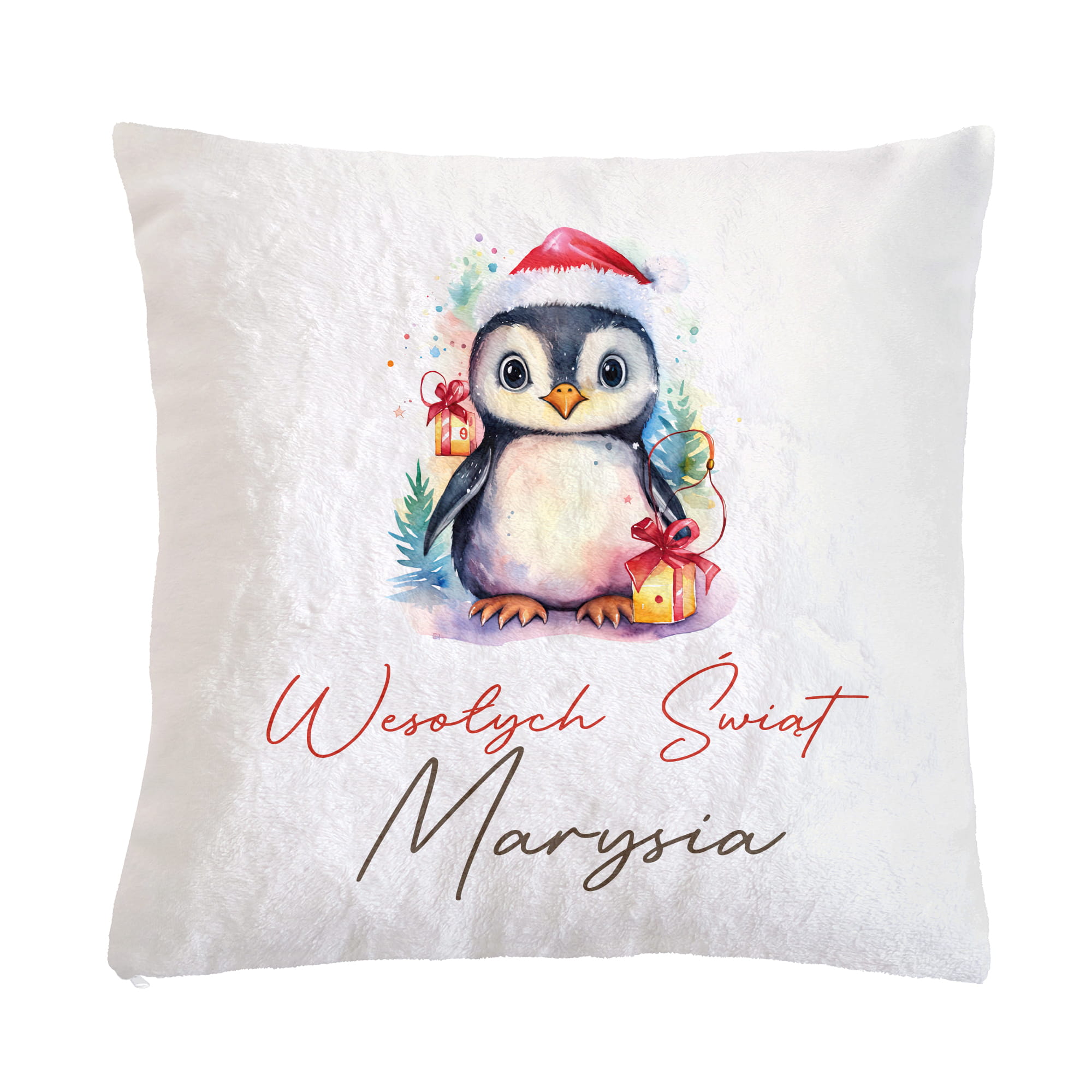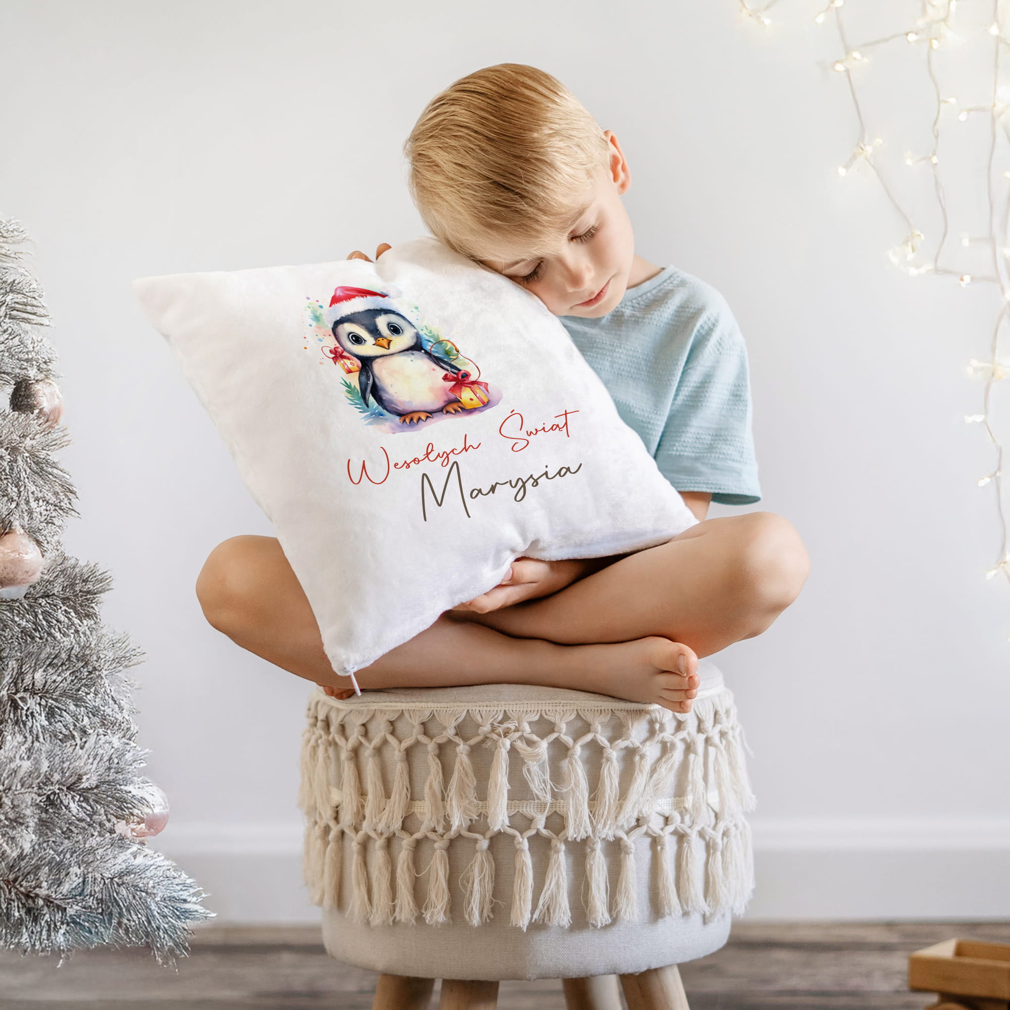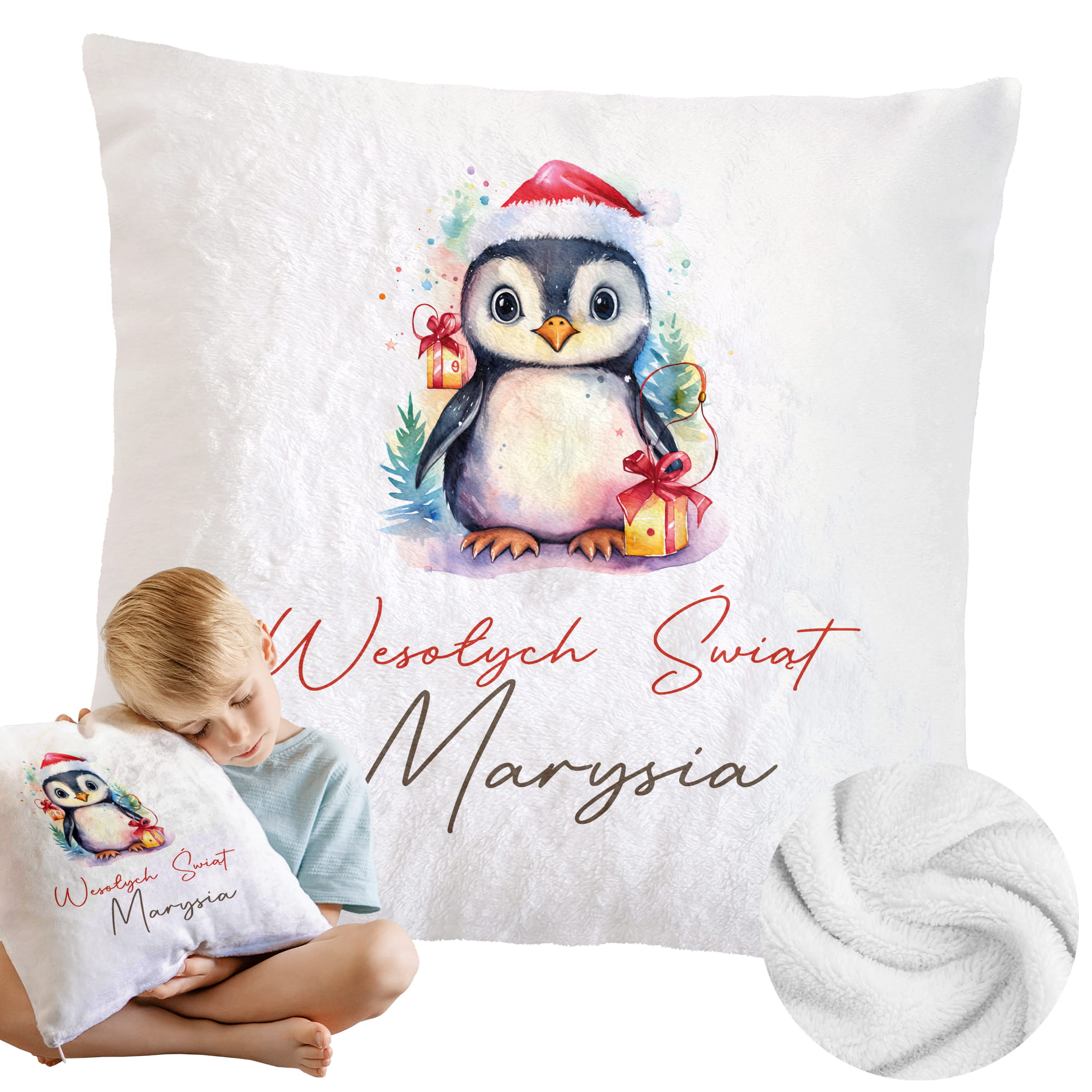 Prezent na Mikołajki Święta dla Dziecka - Mikołajkowa Poduszka Pluszowa Minky z Imieniem - Pingwinek Biała