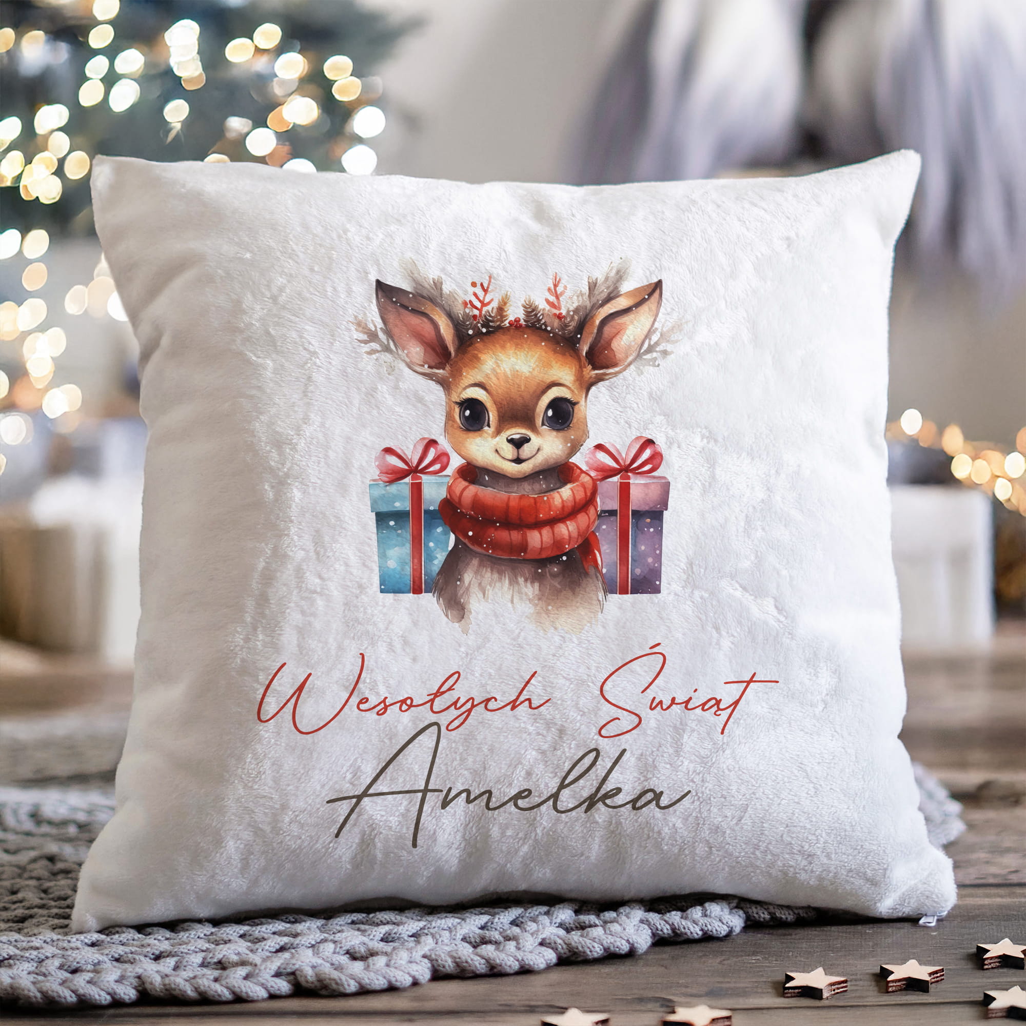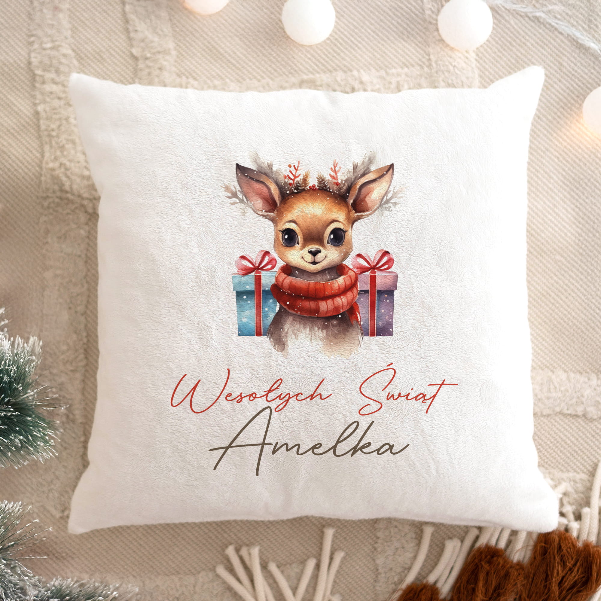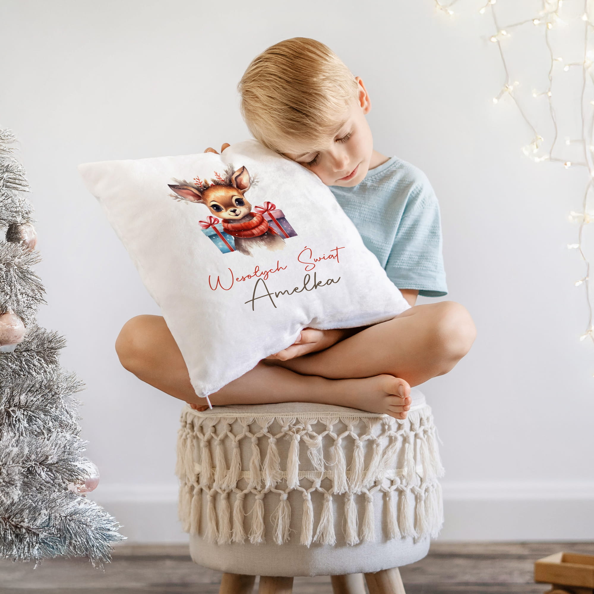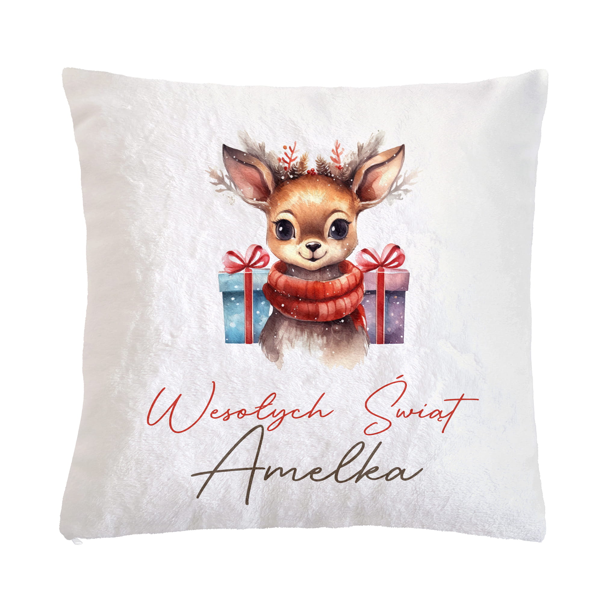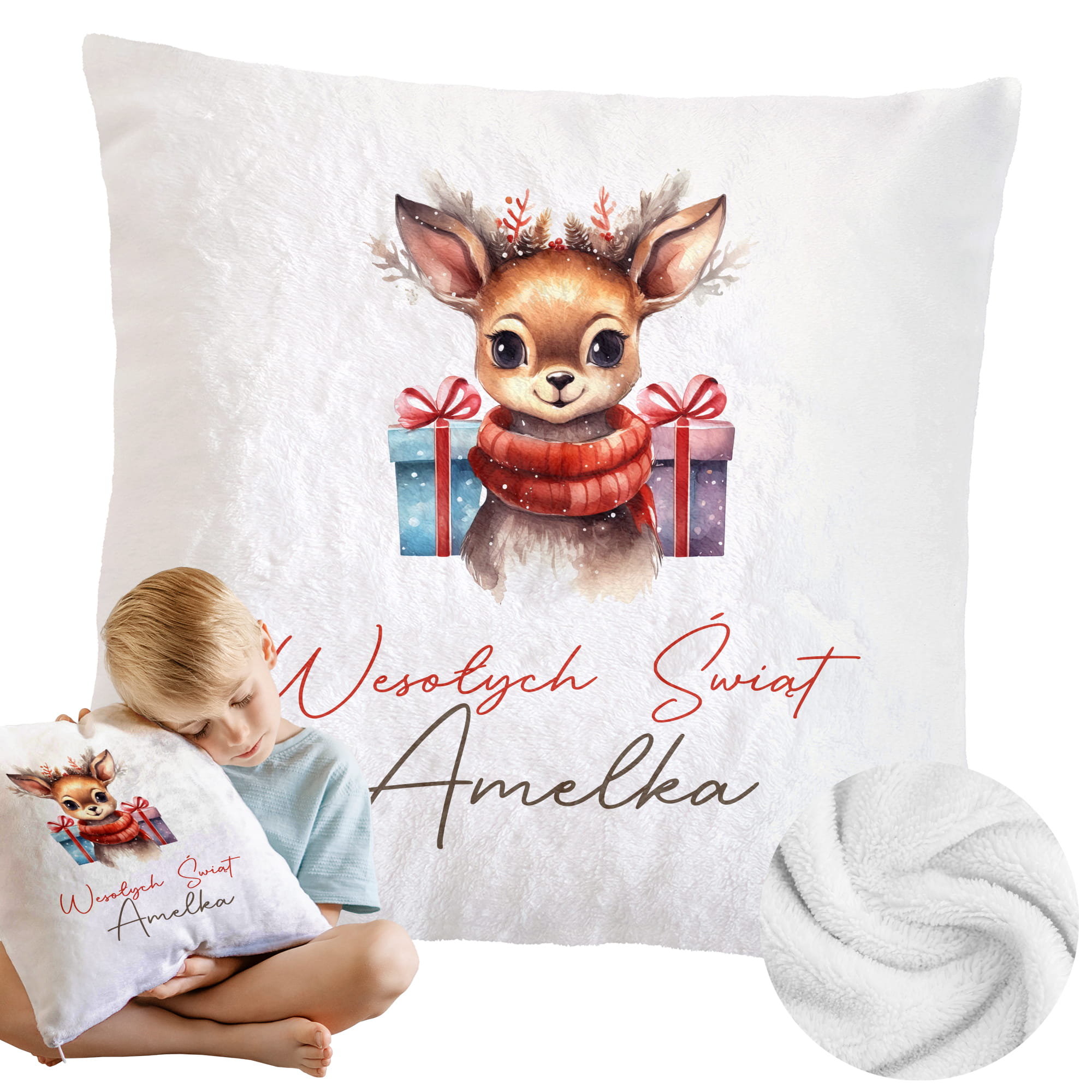 Prezent na Mikołajki Święta dla Dziecka - Mikołajkowa Poduszka Pluszowa Minky z Imieniem - Sarenka Biała