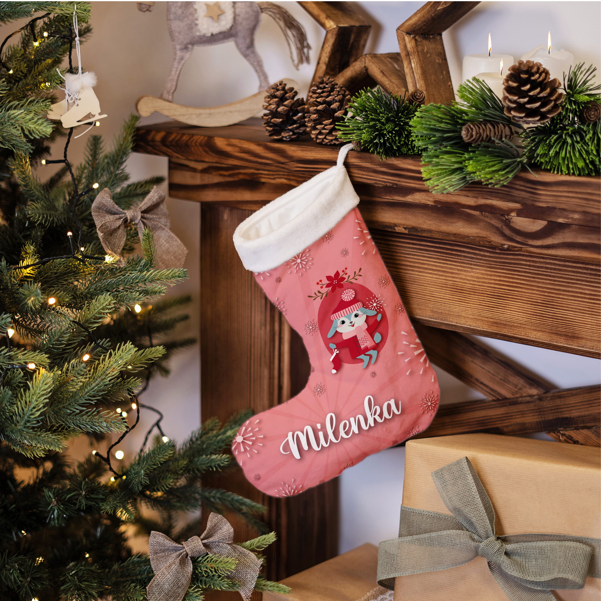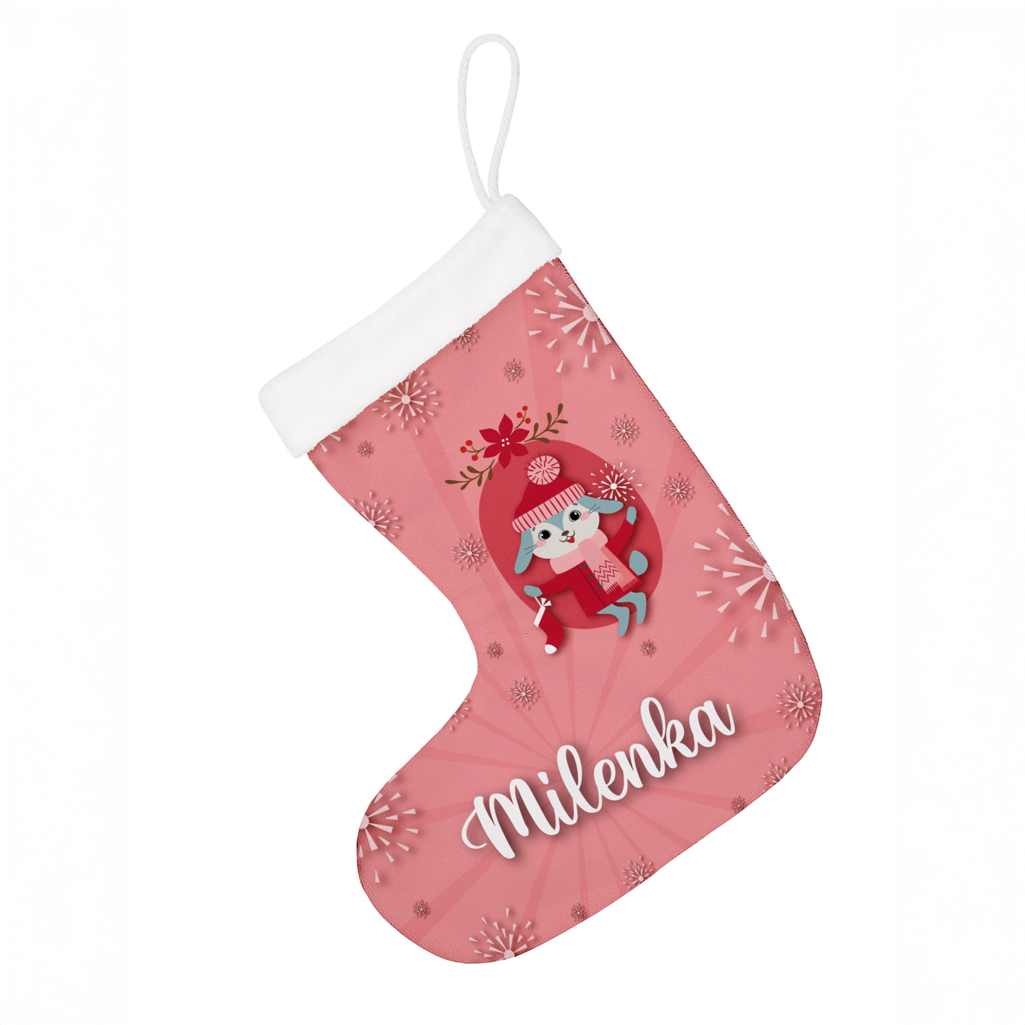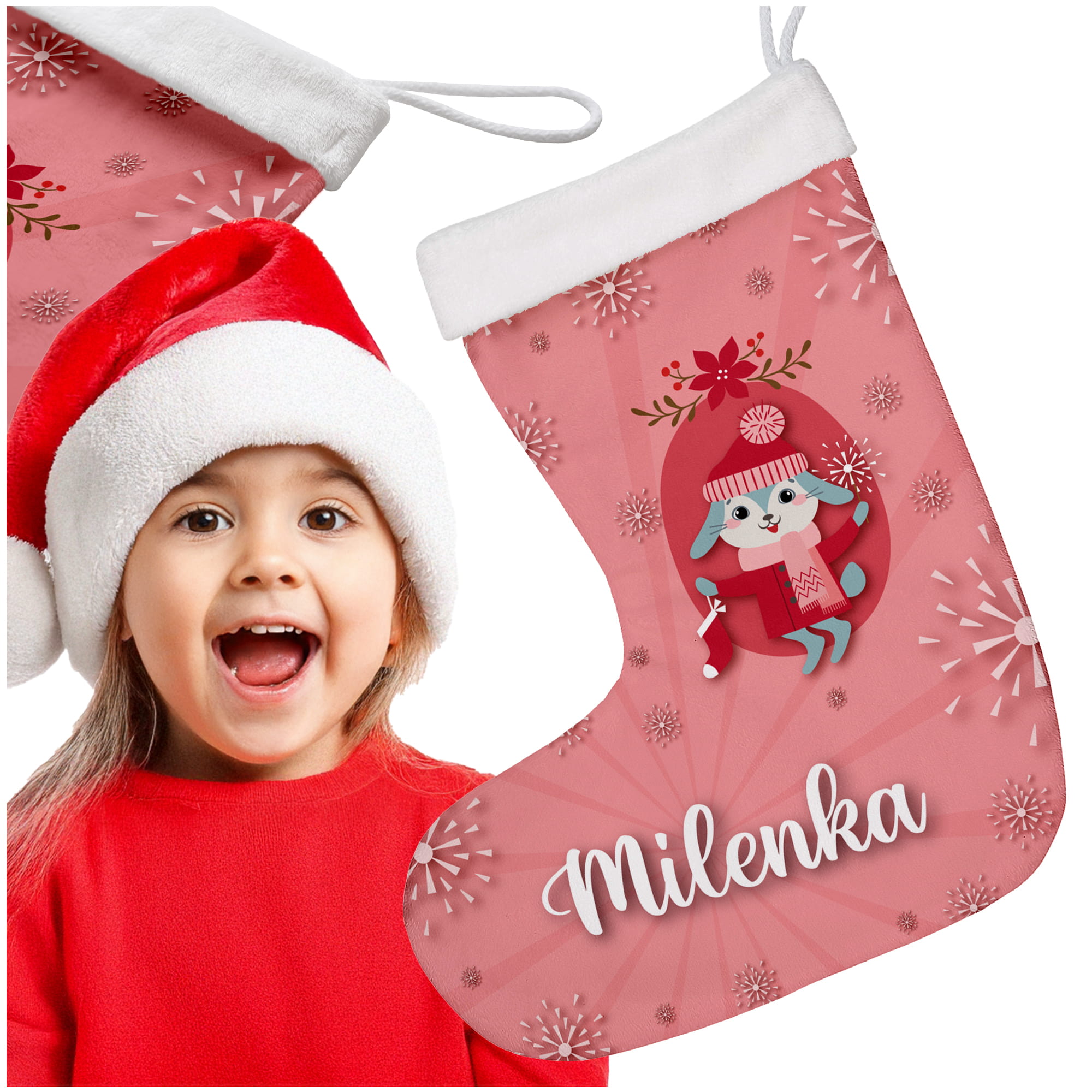 Prezent na Mikołajki Święta dla Dziecka - Świąteczna Skarpeta Minky z Imieniem - Czerwony Króliczek
