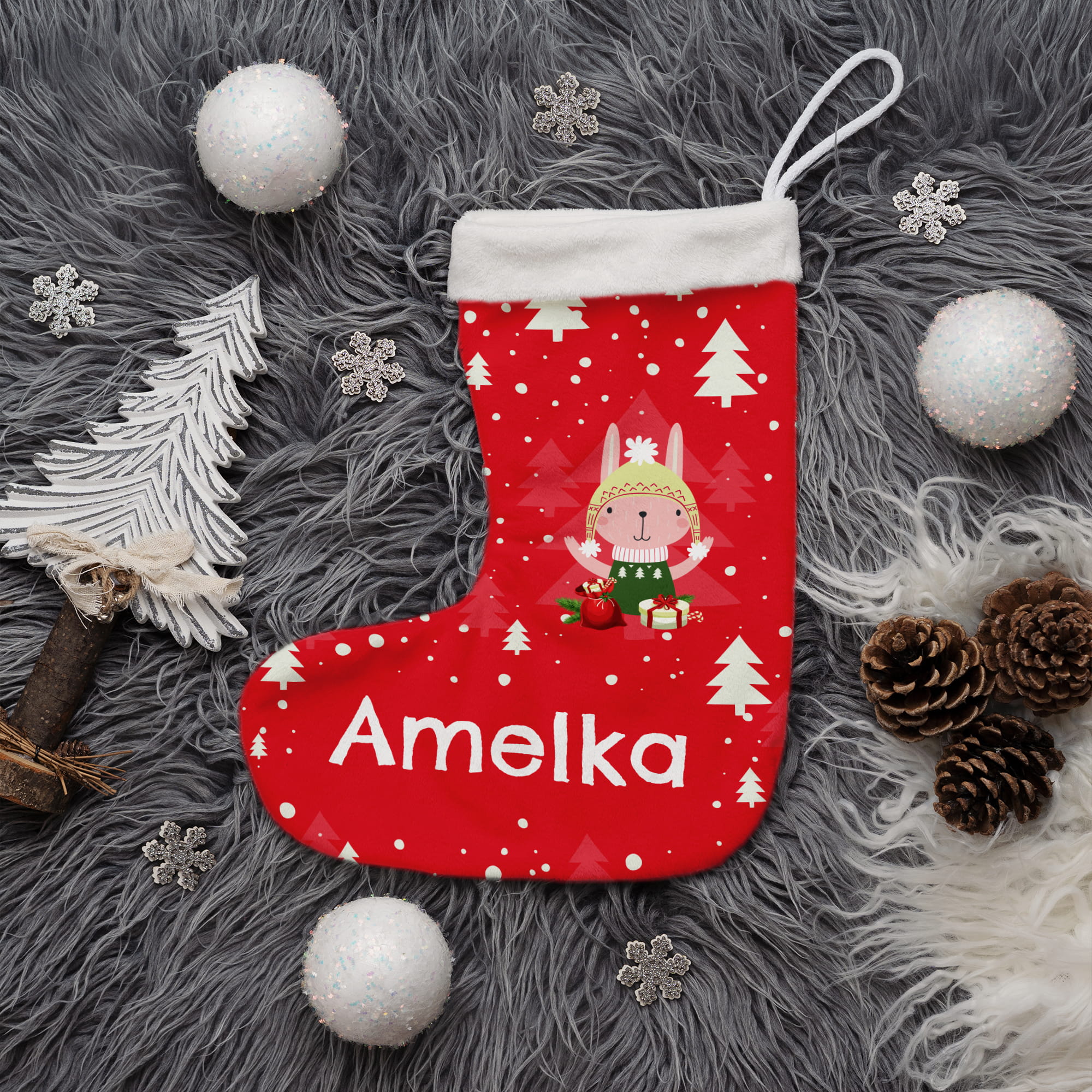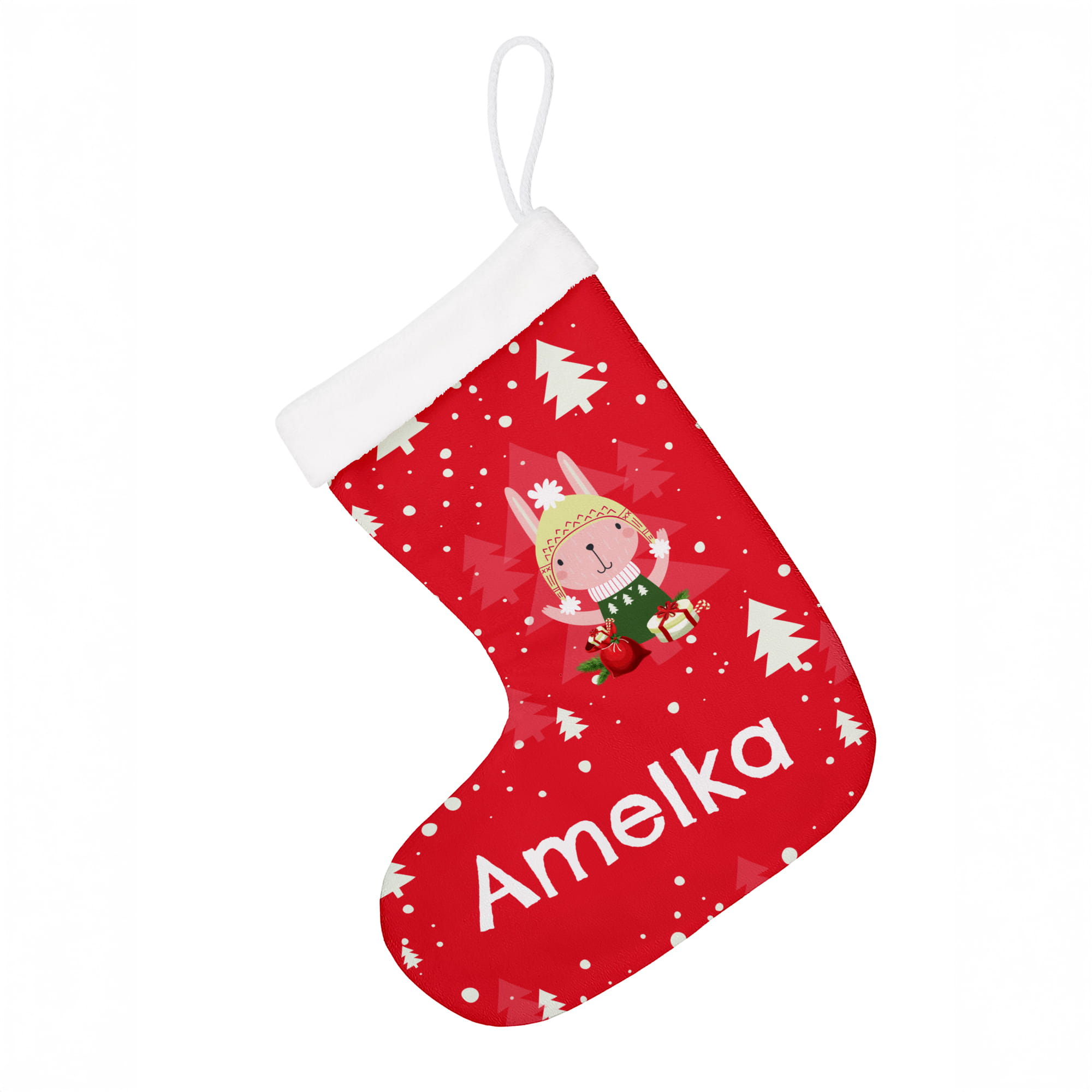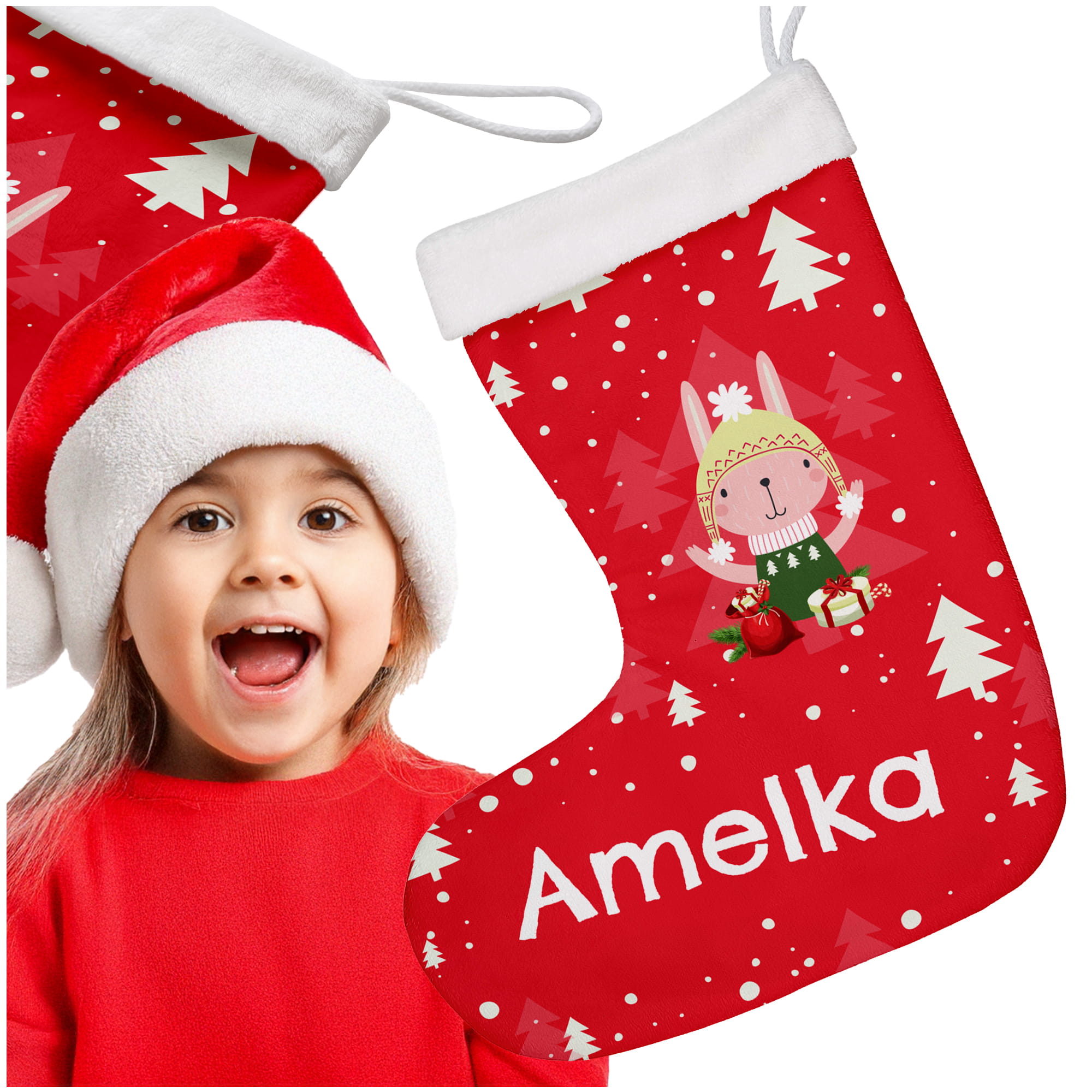 Prezent na Mikołajki Święta dla Dziecka - Świąteczna Skarpeta Minky z Imieniem - Króliczek