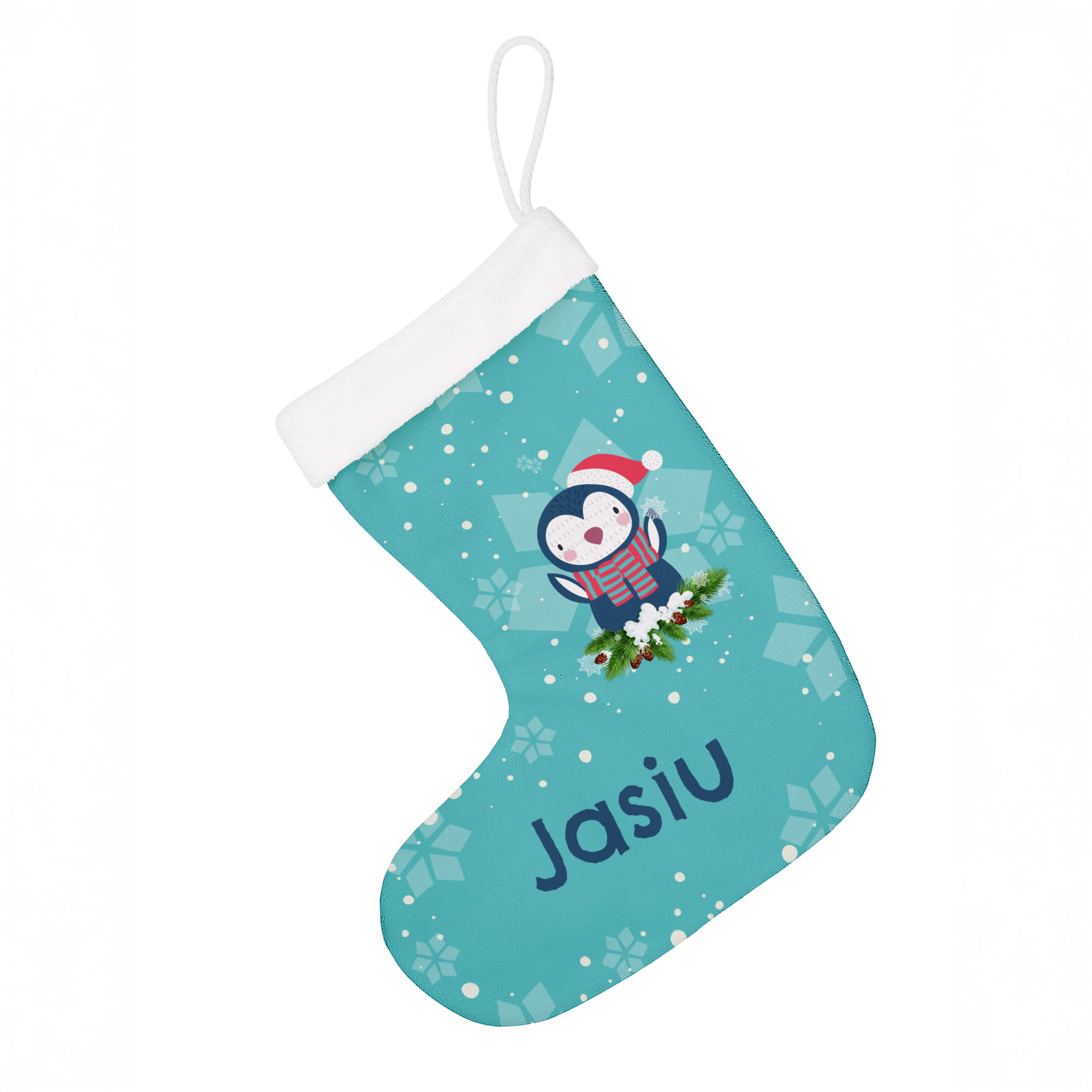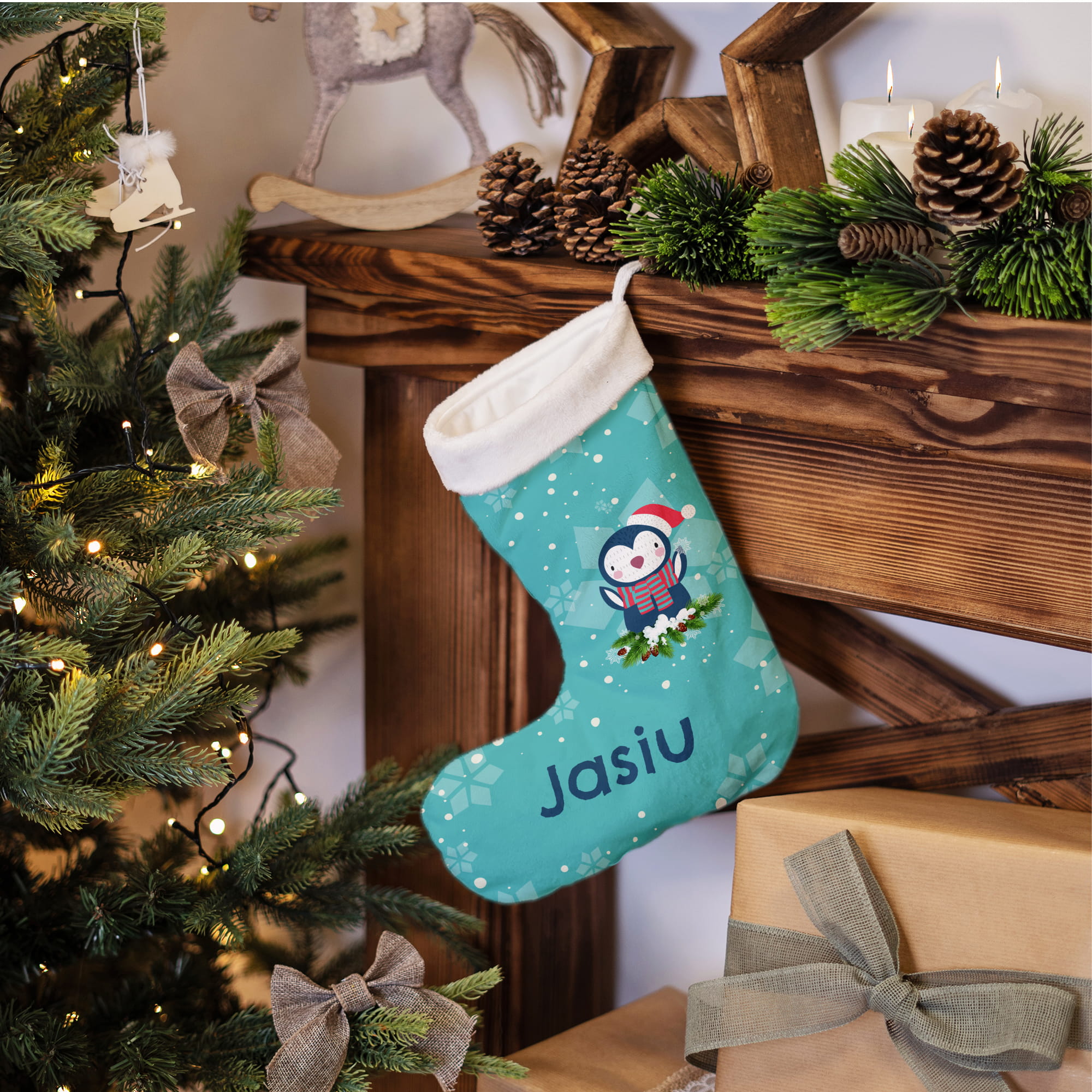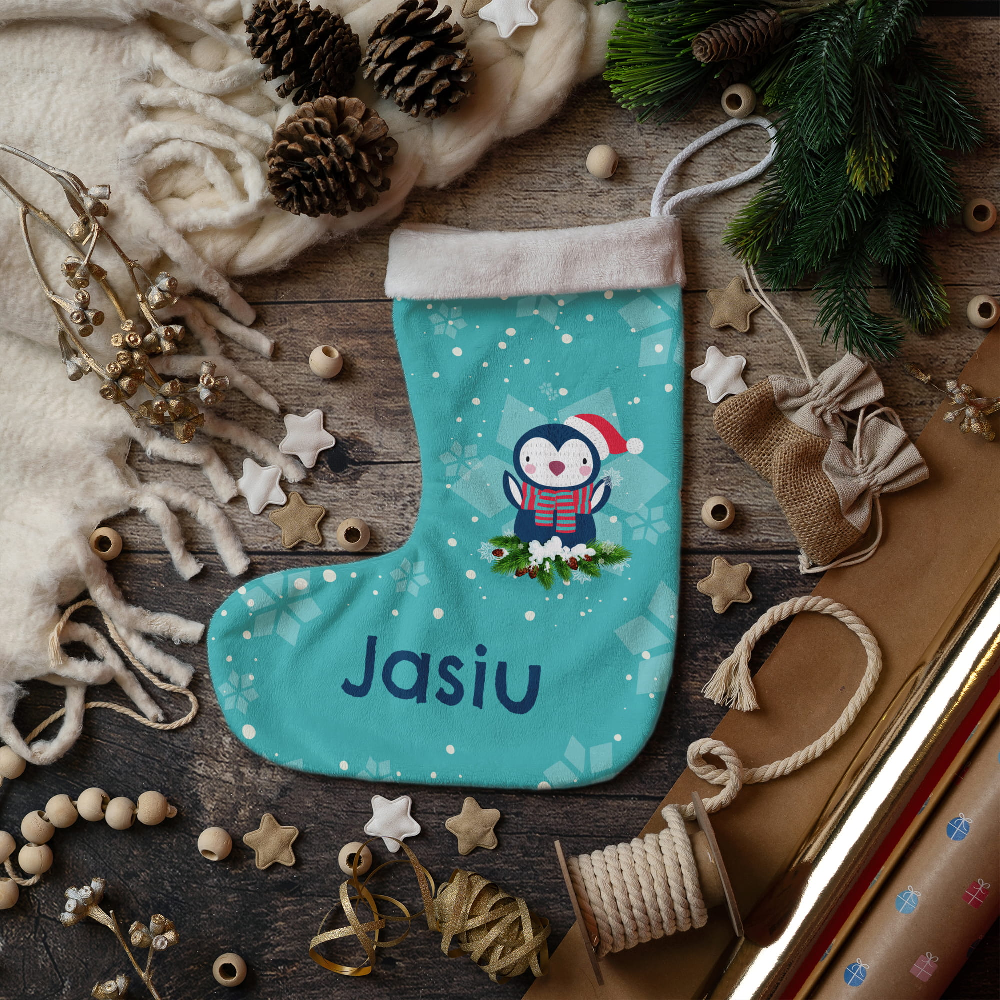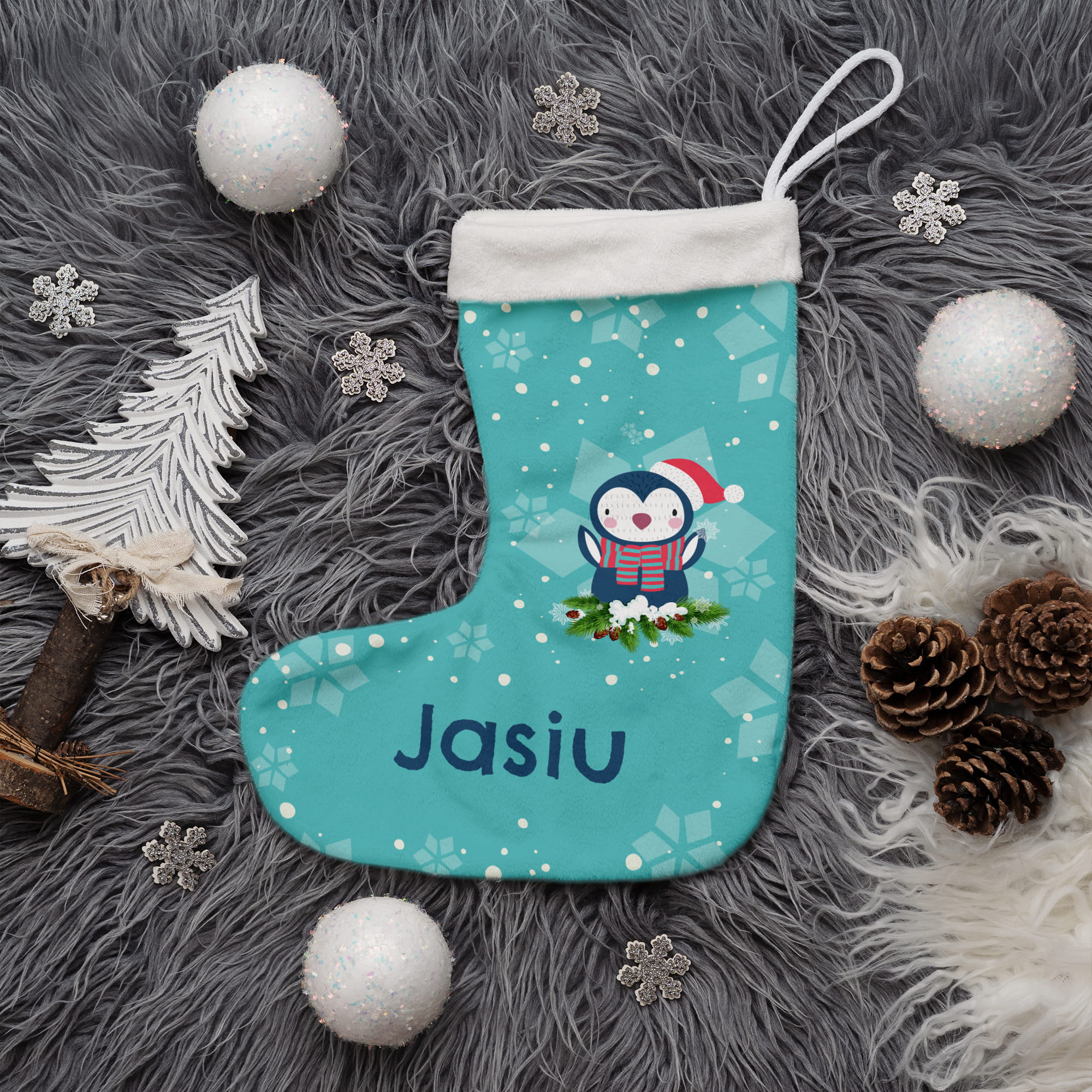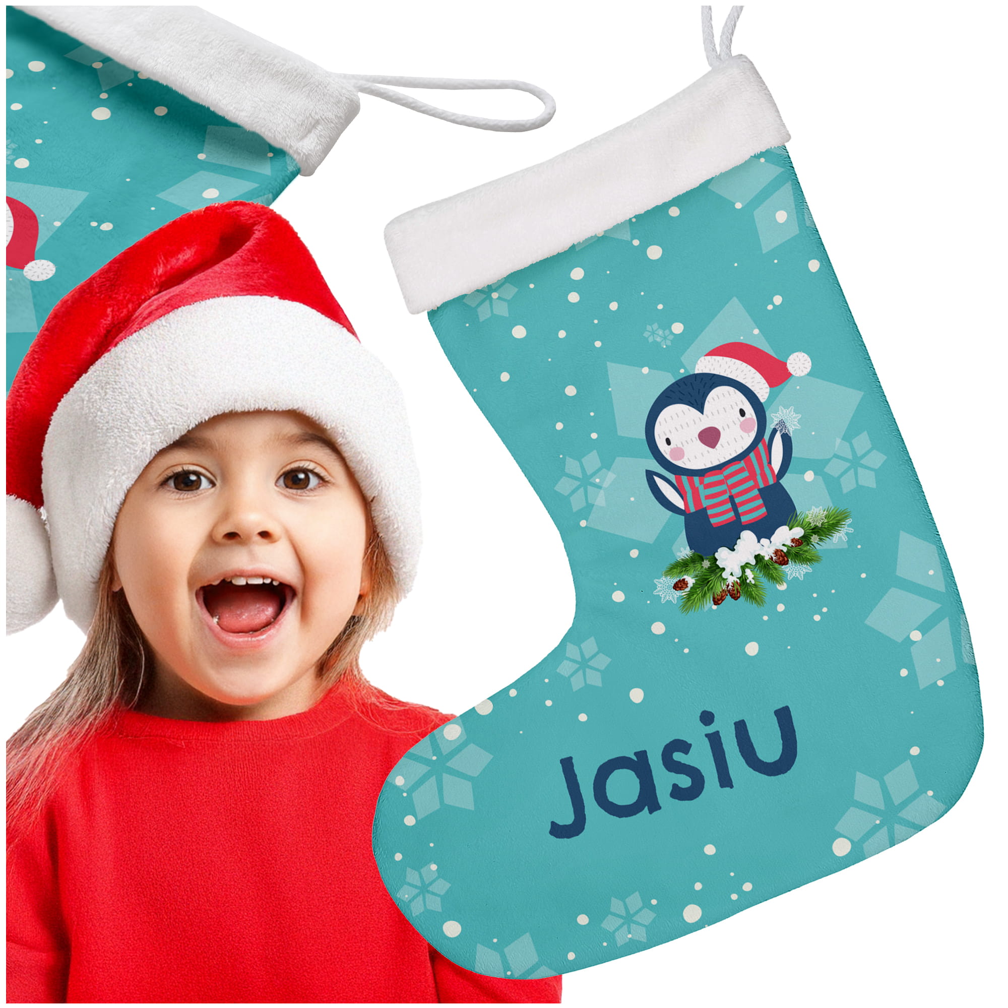 Prezent na Mikołajki Święta dla Dziecka - Świąteczna Skarpeta Minky z Imieniem - Pingwinek