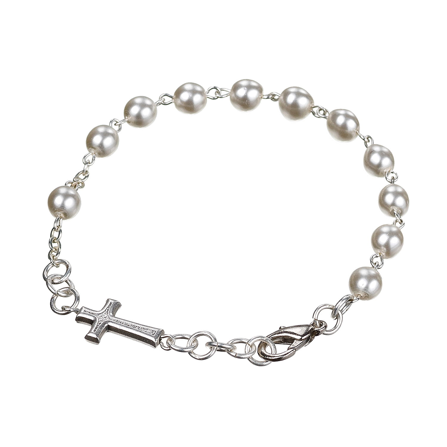 Głównym elementem zestawu jest uroczy dodatek w formie dziesiątka różańca w formie zapinanej bransoletki wykonanej z koralików w kolorze perłowym z krzyżykiem.