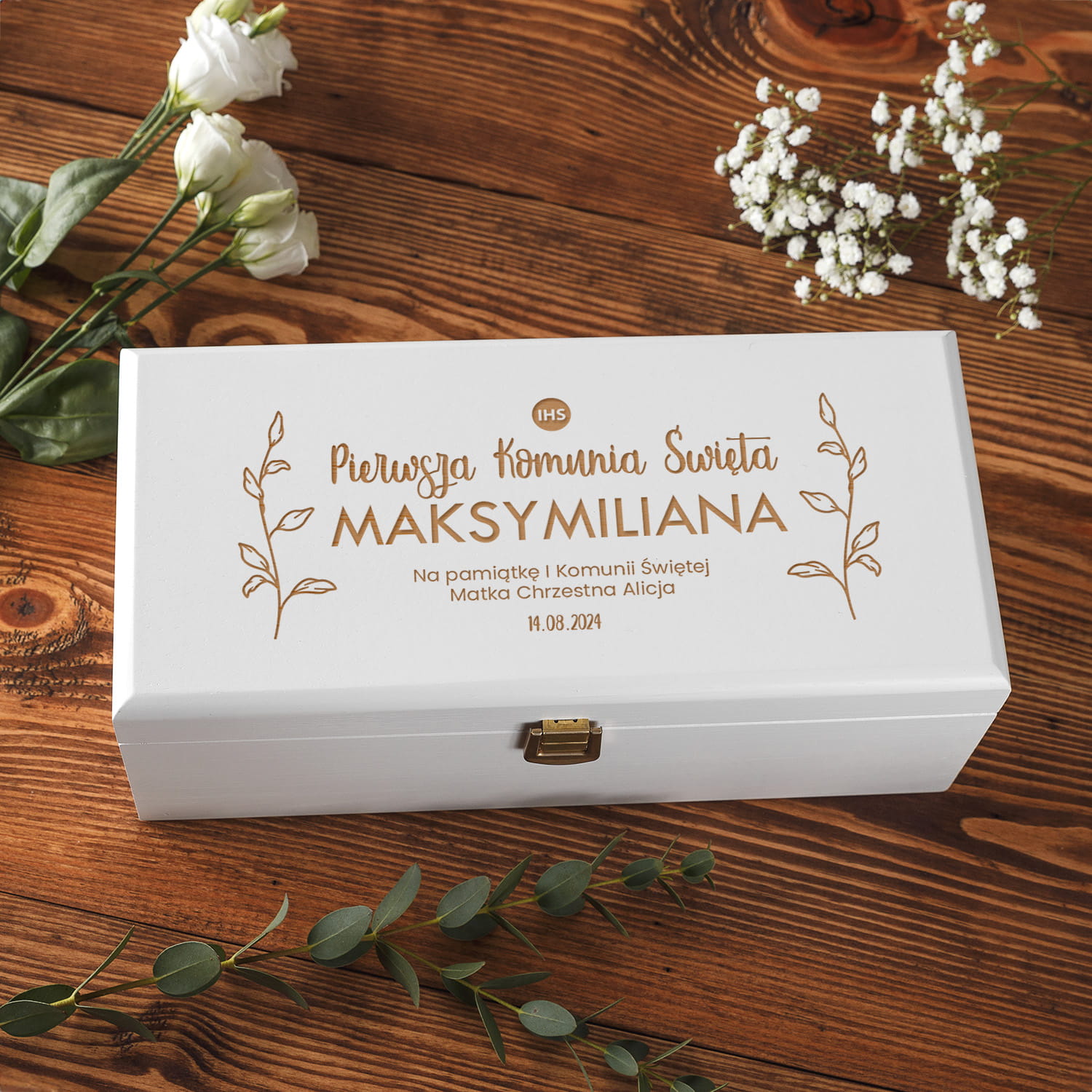 Pudełko Na Pieniądze i Pamiątki Komunia - Pamiątka Pierwszej Komunii w Pudełku z Grawerem - Gałązki Hostia