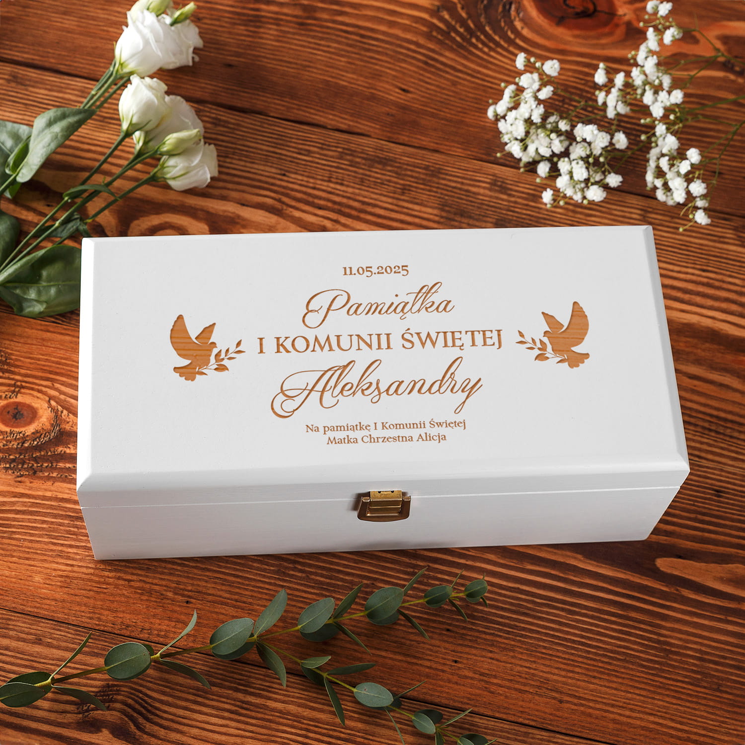 Pudełko Na Pieniądze i Pamiątki Komunia - Pamiątka Pierwszej Komunii w Pudełku z Grawerem - Gołąbki