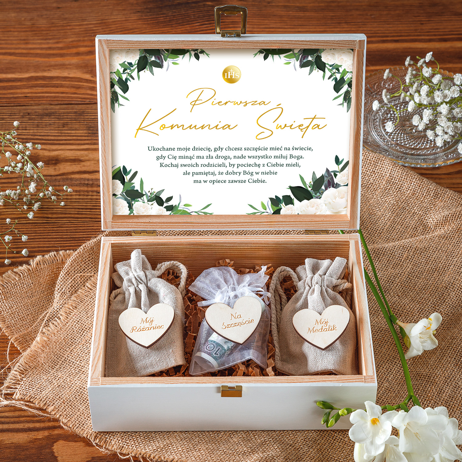 Jeżeli szukasz pięknego i praktycznego prezentu na Pierwszą Komunię Świętą, wybierz pamiątkę komunii w formie grawerowanego pudełka na pieniądze i pamiątki z komunii z podpisanymi woreczkami w zestawie.