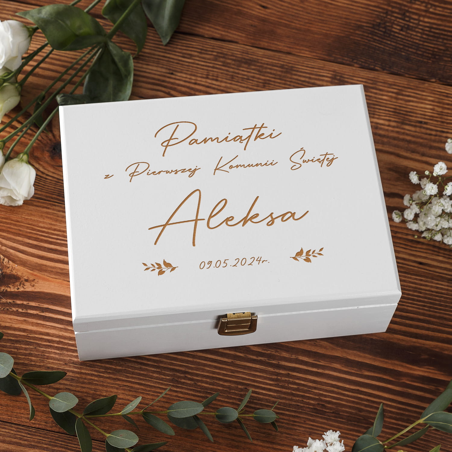 Pudełko Na Pieniądze i Pamiątki Z Komunii - Pamiątka Pierwszej Komunii w Pudełku z Grawerem - Listki