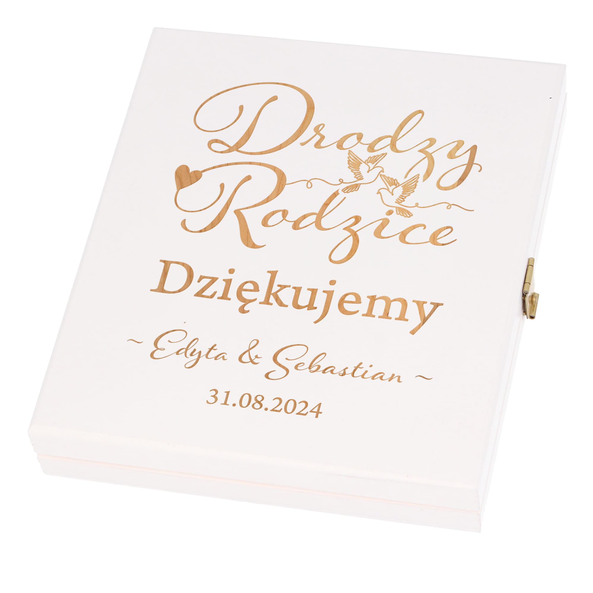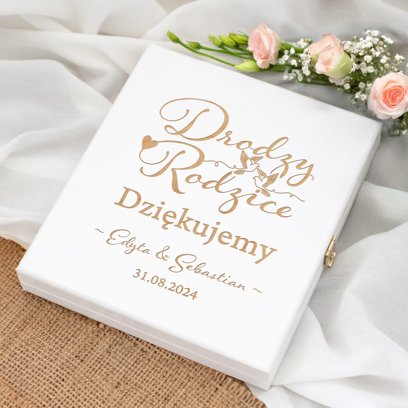 ⭐️ Podziękowanie dla Rodziców w pudełku z grawerowaną personalizacją sprawdzi się idealnie, jako wyjątkowa forma podziękowania w dniu ślubu.