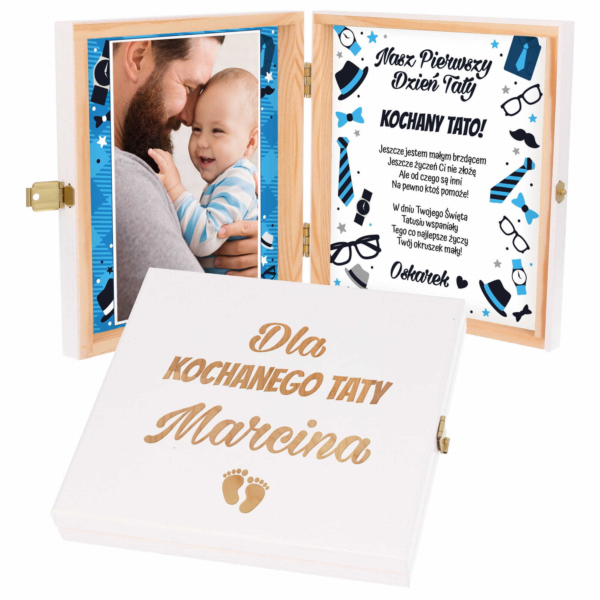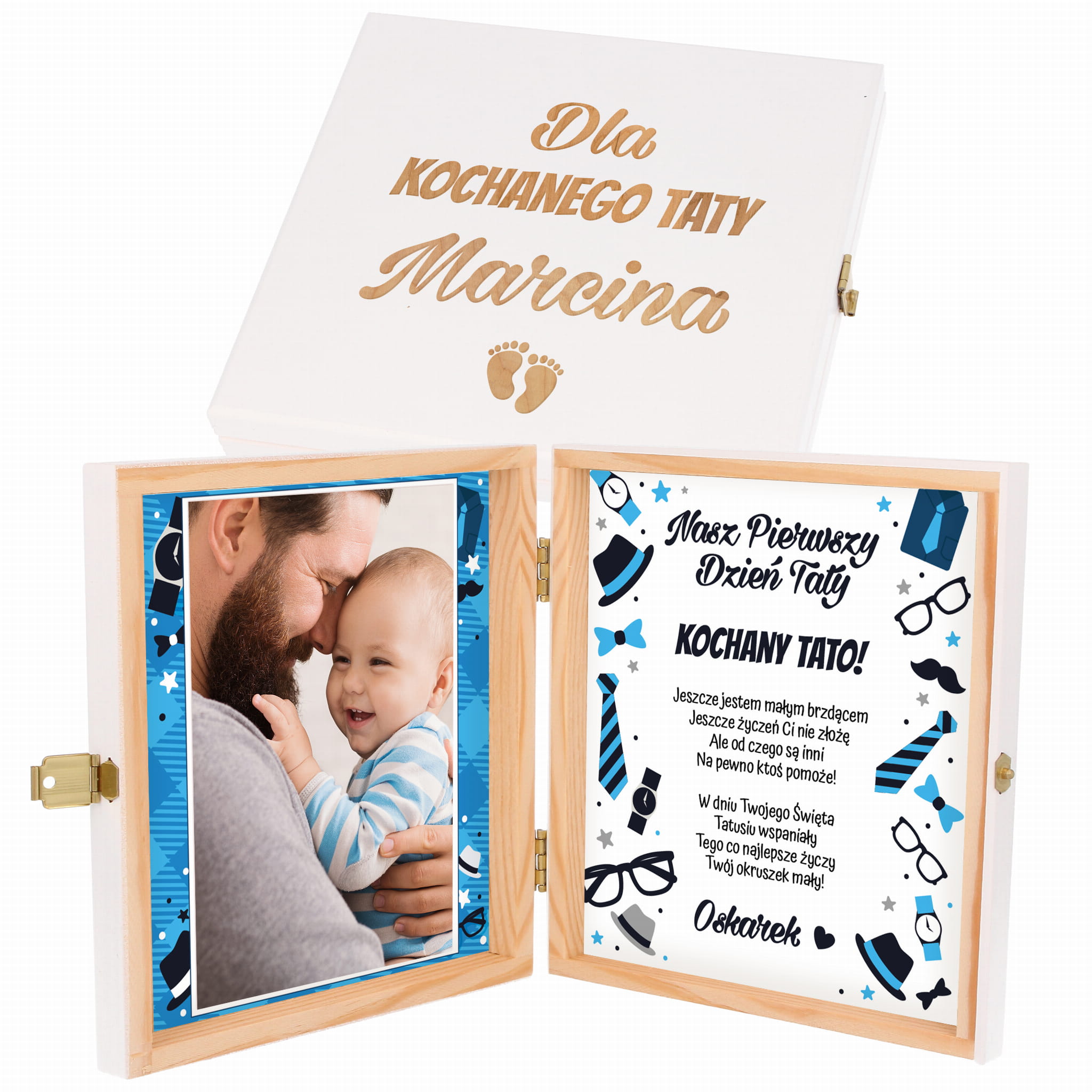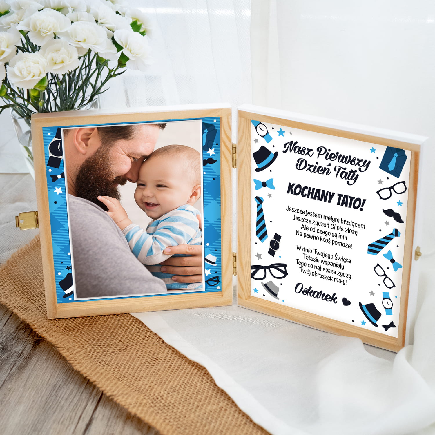 Pamiątka Pierwszego Dnia Ojca w pudełku z możliwością umieszczenia wewnątrz własnego zdjęcia sprawdzi się idealnie, jako prezent od dziecka dla świeżo upieczonego taty.