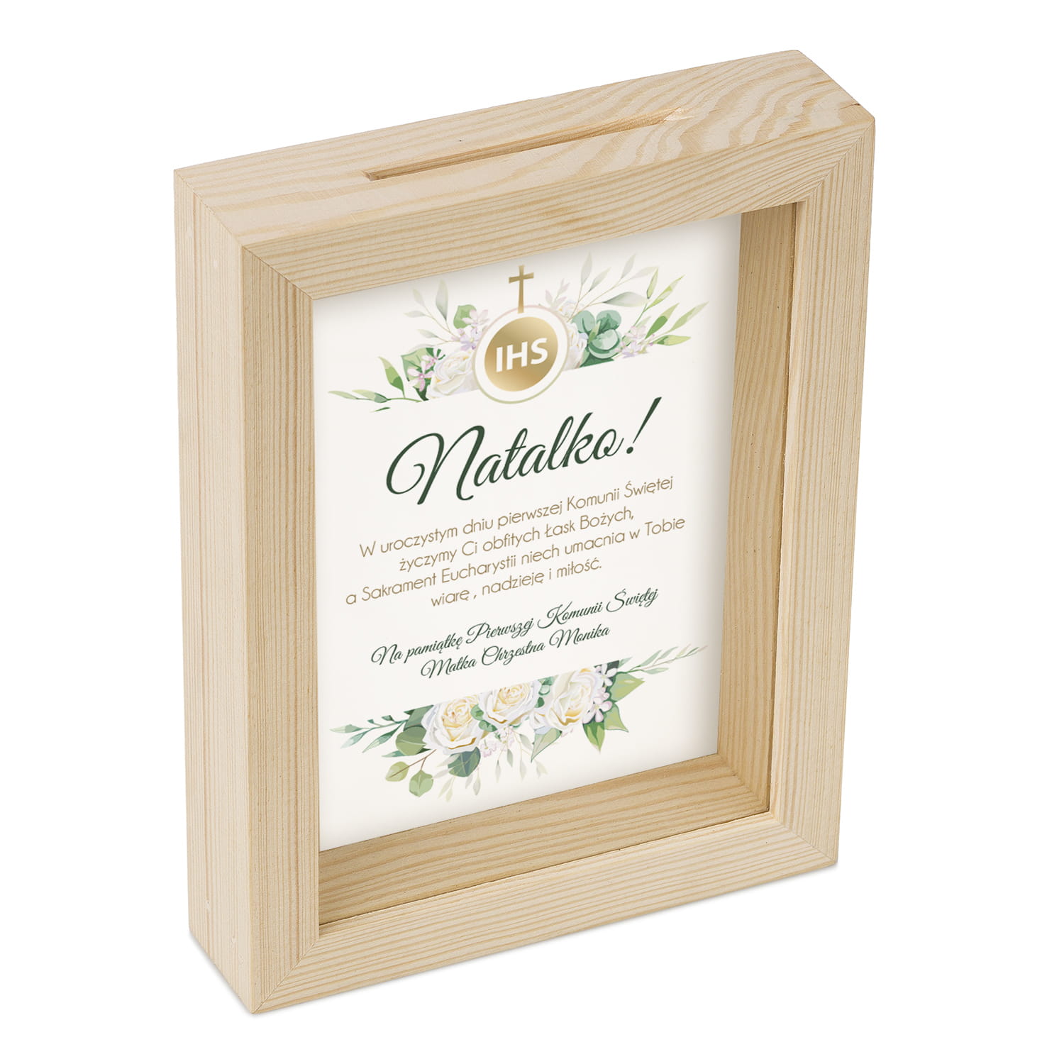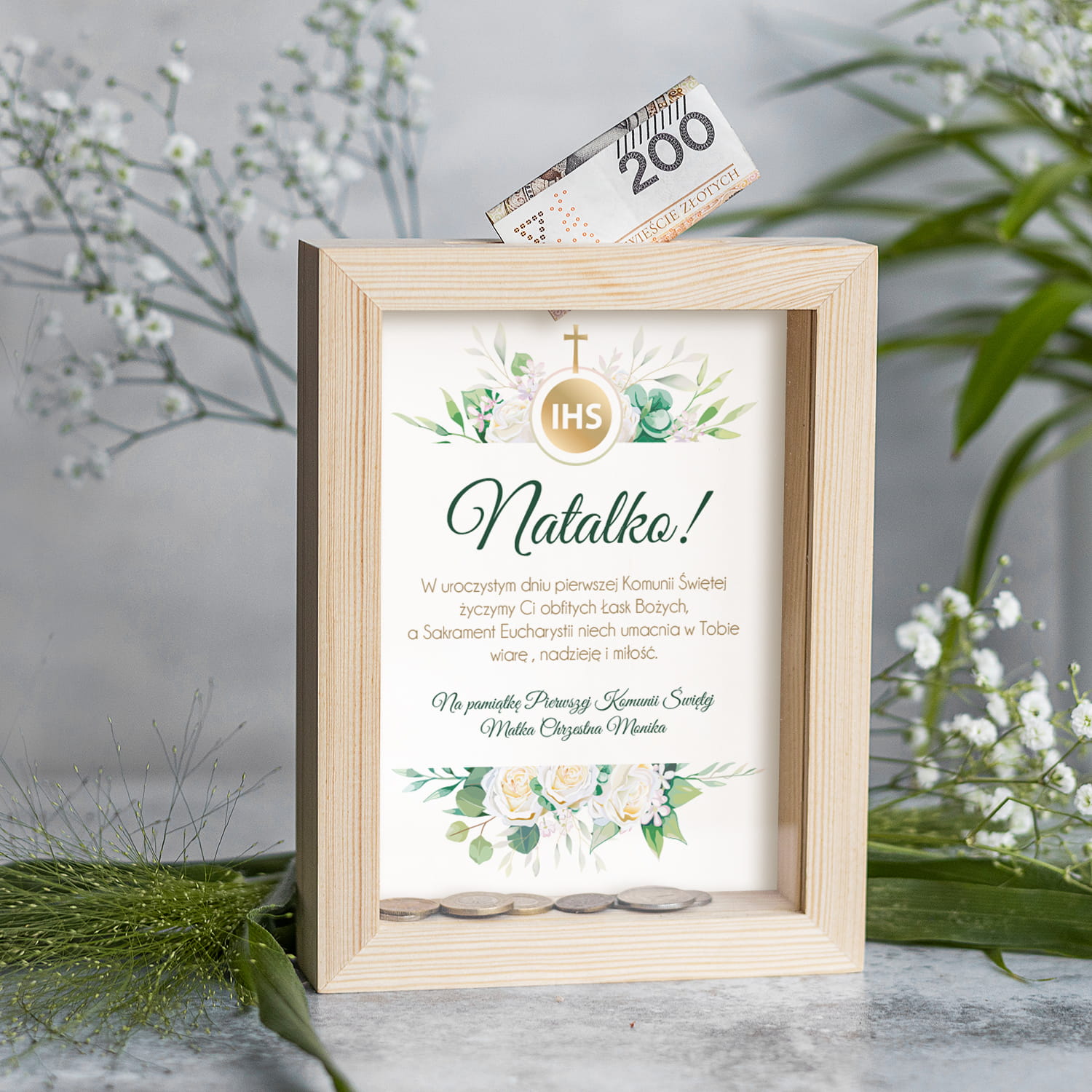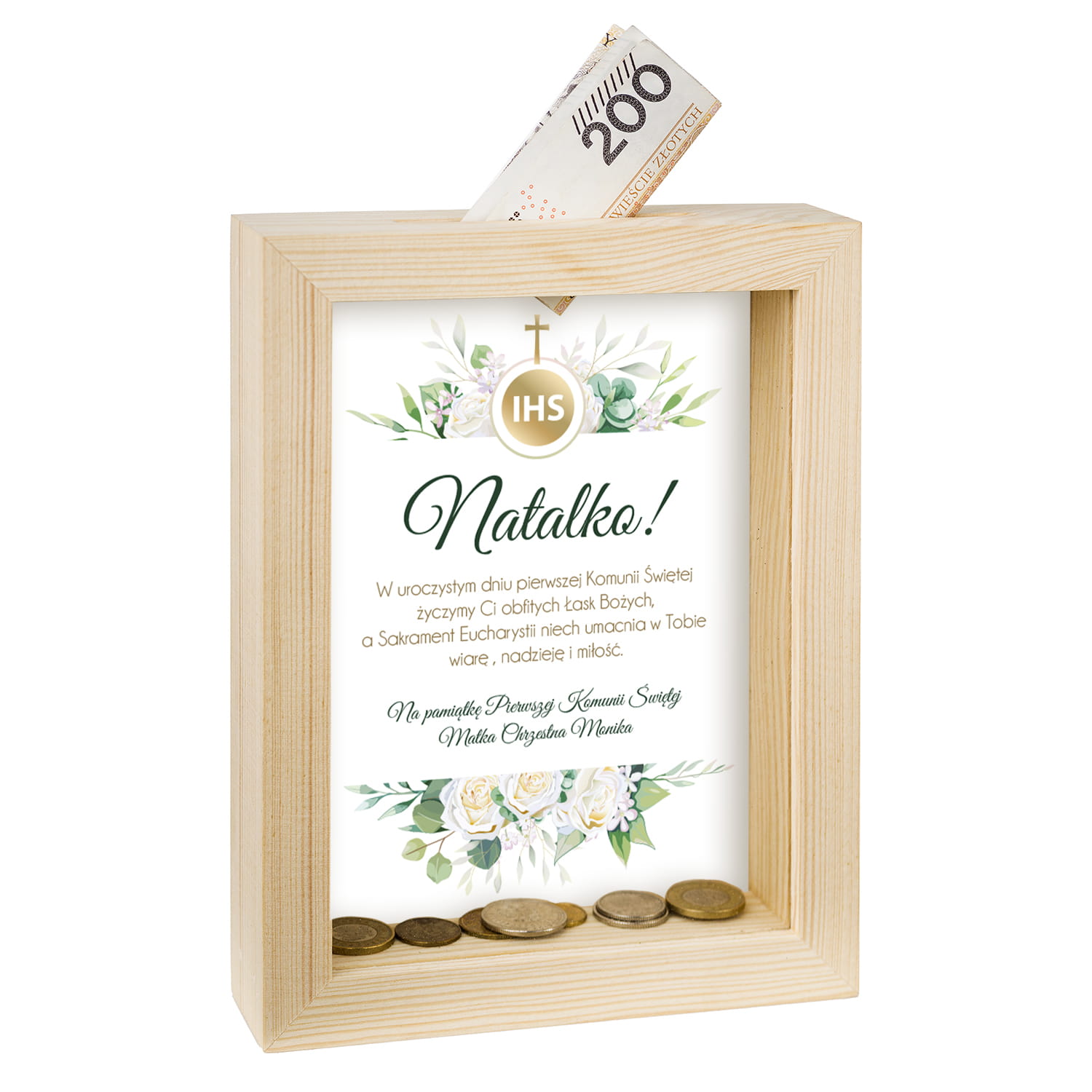 ORYGINALNY I PRAKTYCZNY POMYSŁ NA PAMIĄTKĘ PIERWSZEJ KOMUNII ŚWIĘTEJ. DREWNIANA SKARBONKA ZE SPERSONALIZOWANYM WNĘTRZEM