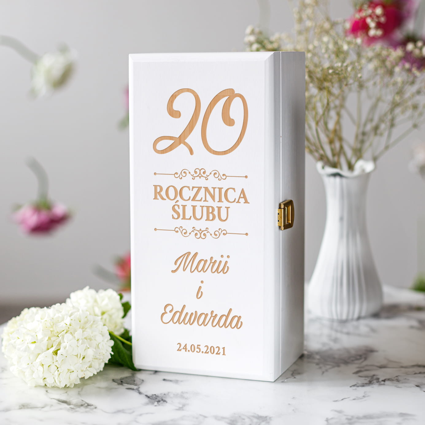 ORYGINALNA BIAŁA SKRZYNKA NA ALKOHOL Z GRAWEREM - PREZENT NA ROCZNICĘ ŚLUBU