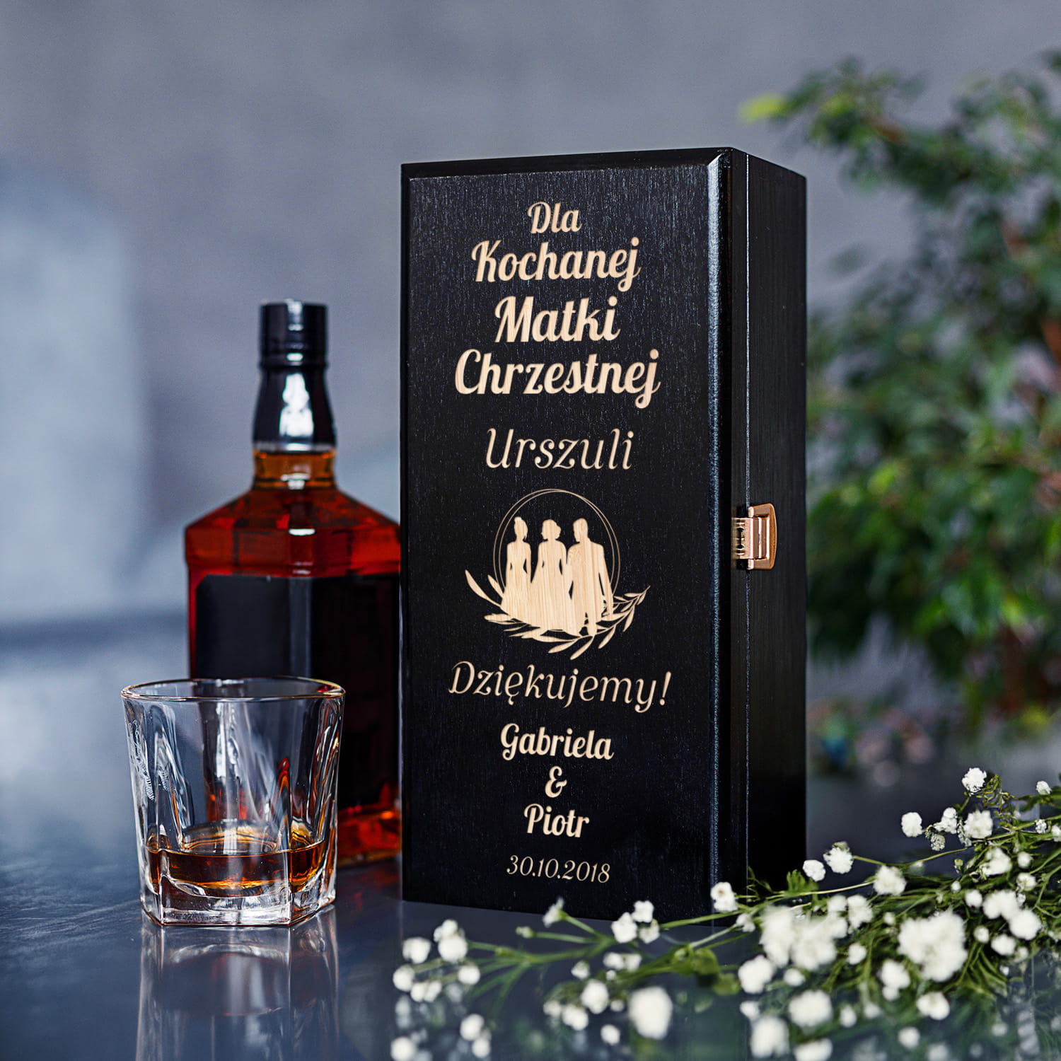 Pamiętaj, wizualizacja jest tylko poglądowym przedstawieniem projektu, kolor grawera może nieznacznie różnić się od tego widocznego na projekcie. Drewno jest materiałem naturalnym w związku z czym, może posiadać na swojej powierzchni naturalne przebarwienia, skazy itp. Nie ma dwóch identycznych kawałków drewna, więc każda skrzynka może nieznacznie różnić się od tej widocznej na wizualizacji. Alkohol widoczny na zdjęciu nie jest częścią oferty, służy jedynie prezentacji oferowanego produktu.