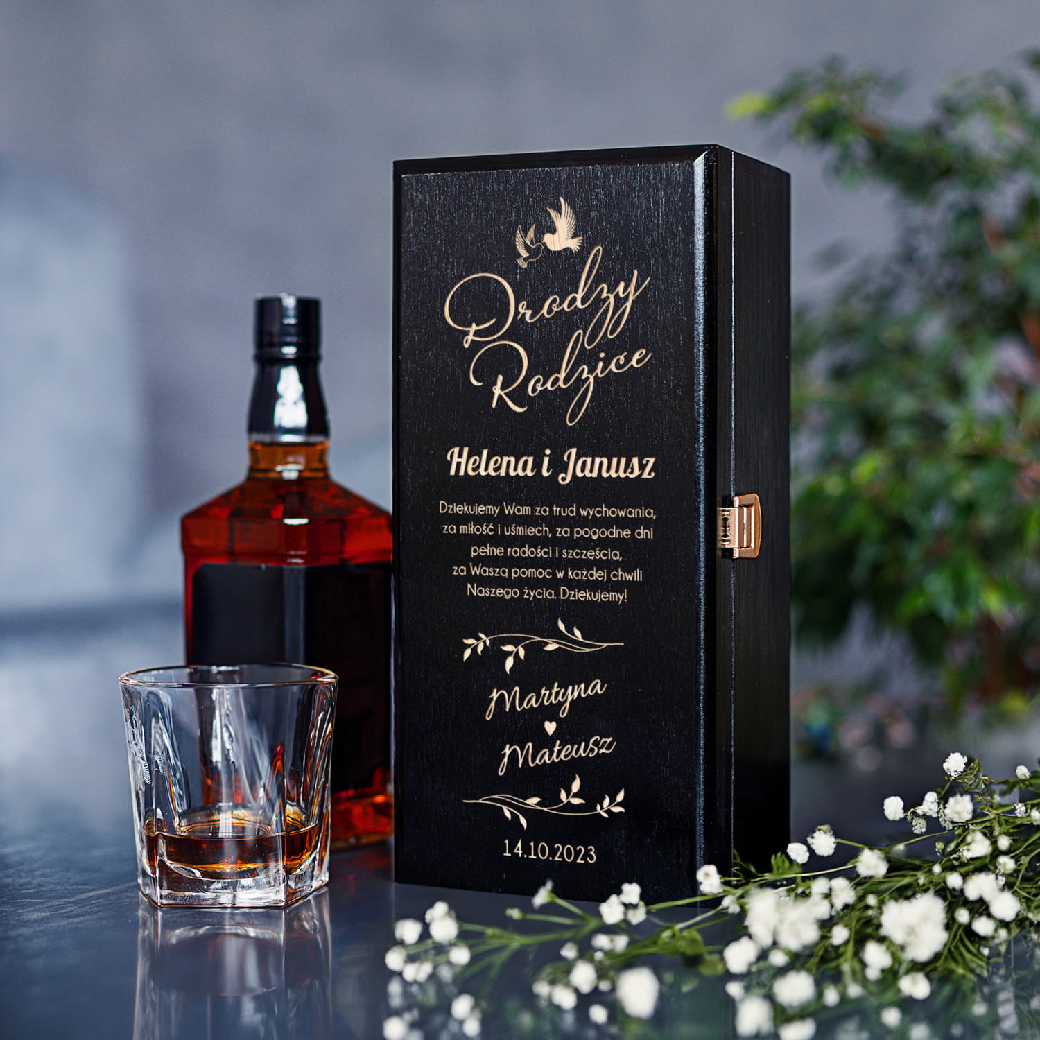 ELEGANCKA SKRZYNKA NA ALKOHOL Z GRAWEREM