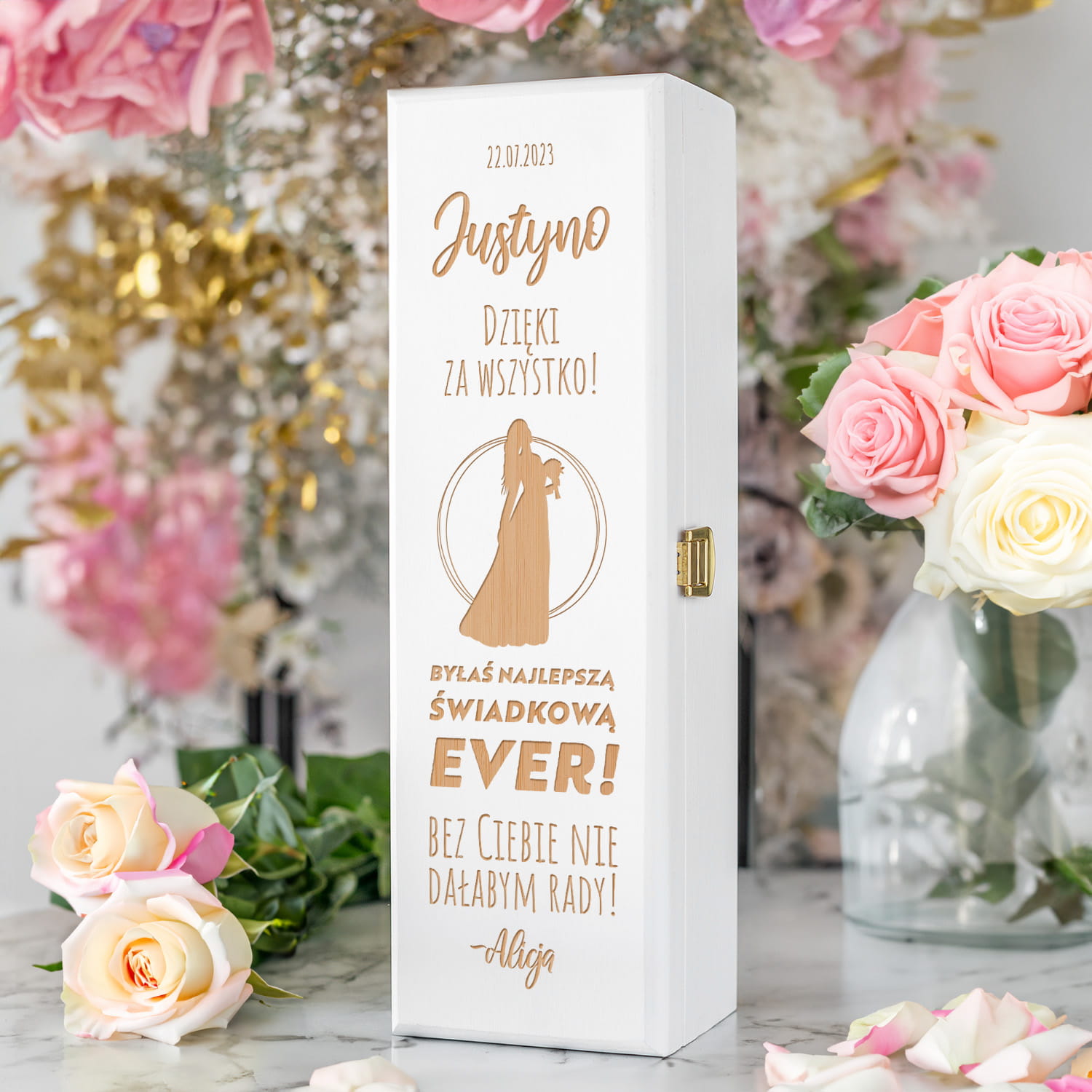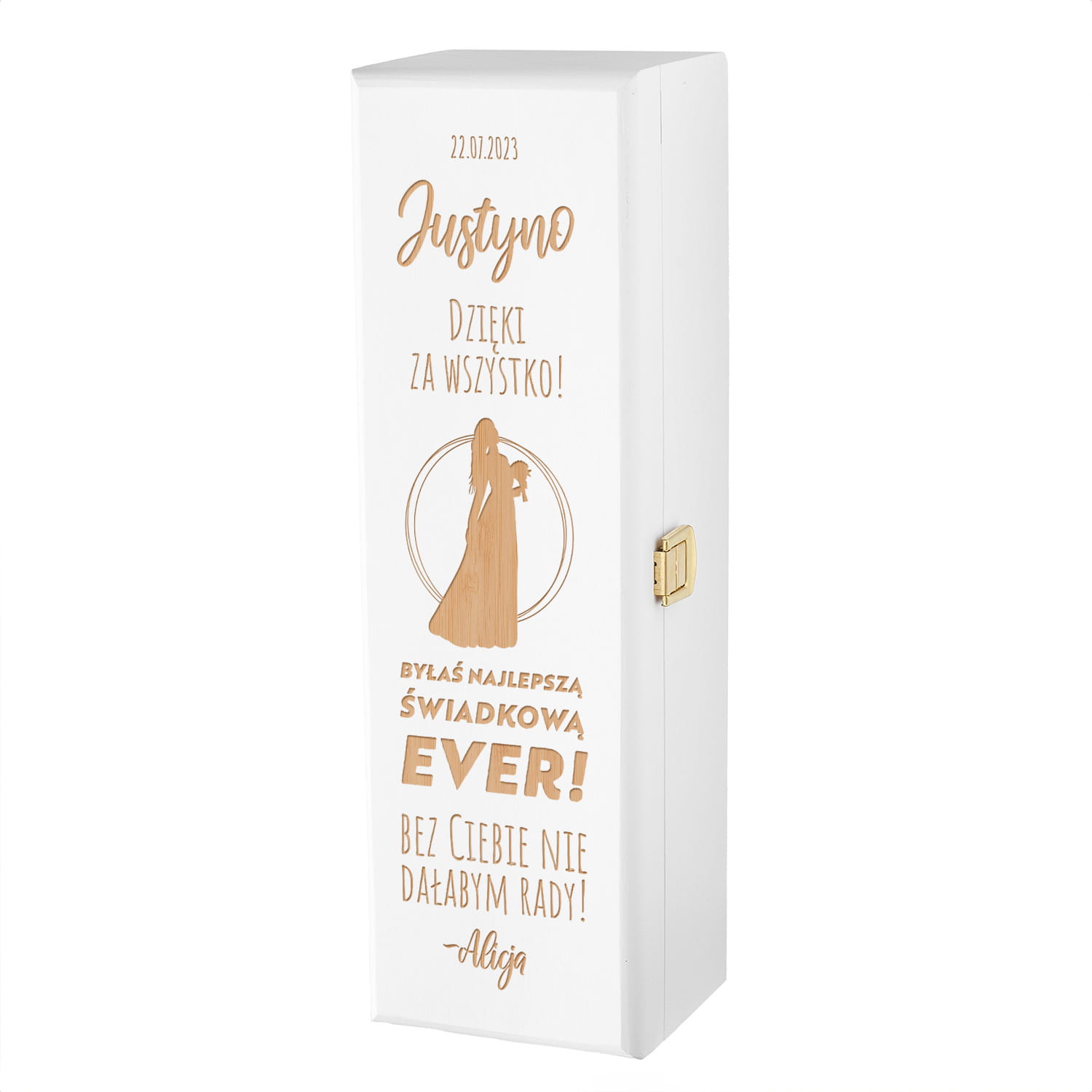 ORYGINALNA BIAŁA SKRZYNKA NA WINO Z GRAWEREM - PODZIĘKOWANIE DLA ŚWIADKOWEJ