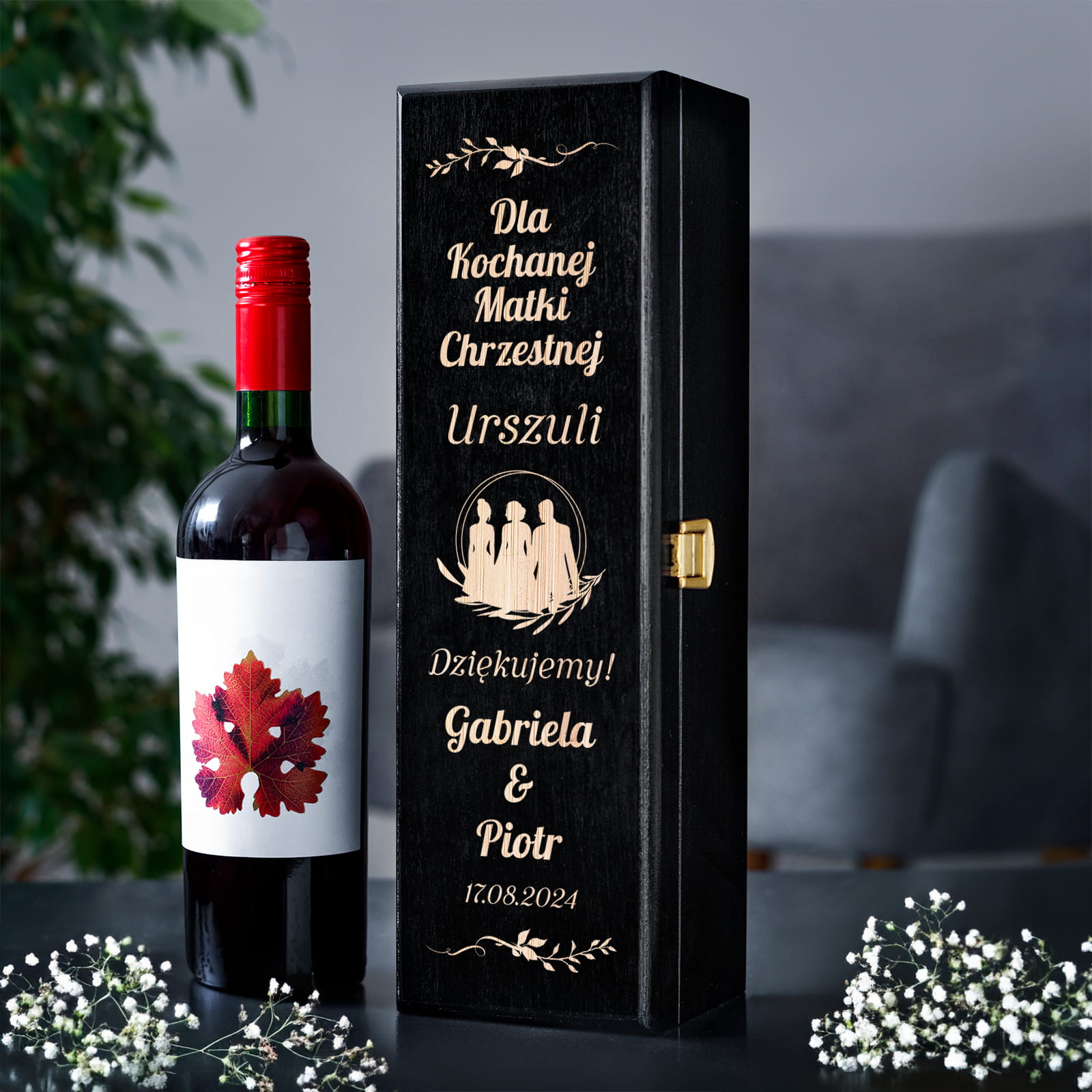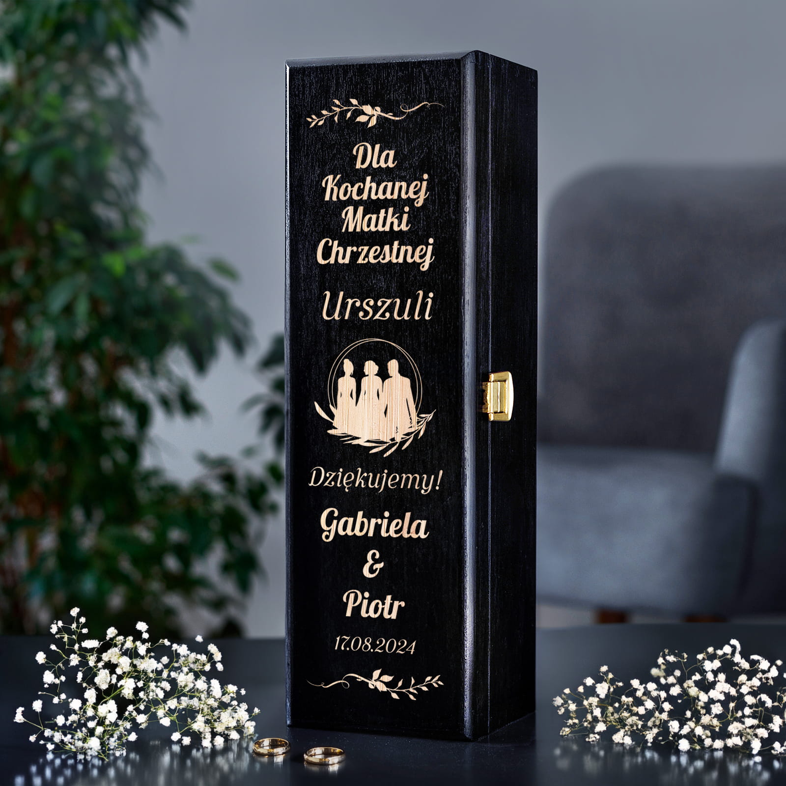 Skrzynka Na Wino z Grawerem Podziękowanie dla Matki Chrzestnej, Rodziców Chrzestnych na Ślub - Dla Kochanej Matki Chrzestnej - Czarna