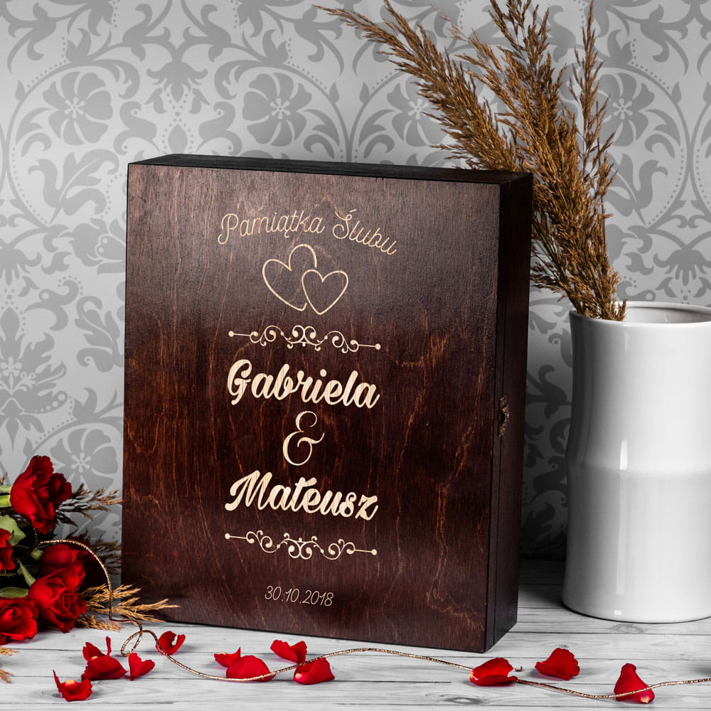 Na skrzynce wygrawerowane są imiona nowożeńców, data ślubu oraz dwa serca.