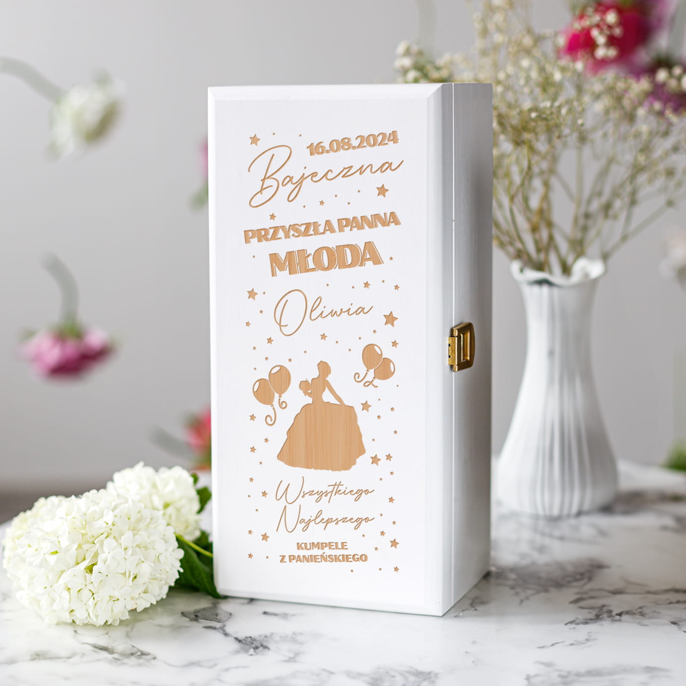 ORYGINALNA BIAŁA SKRZYNKA NA ALKOHOL Z GRAWEREM - PAMIĄTKA Z OKAZJI WIECZORU PANIEŃSKIEGO