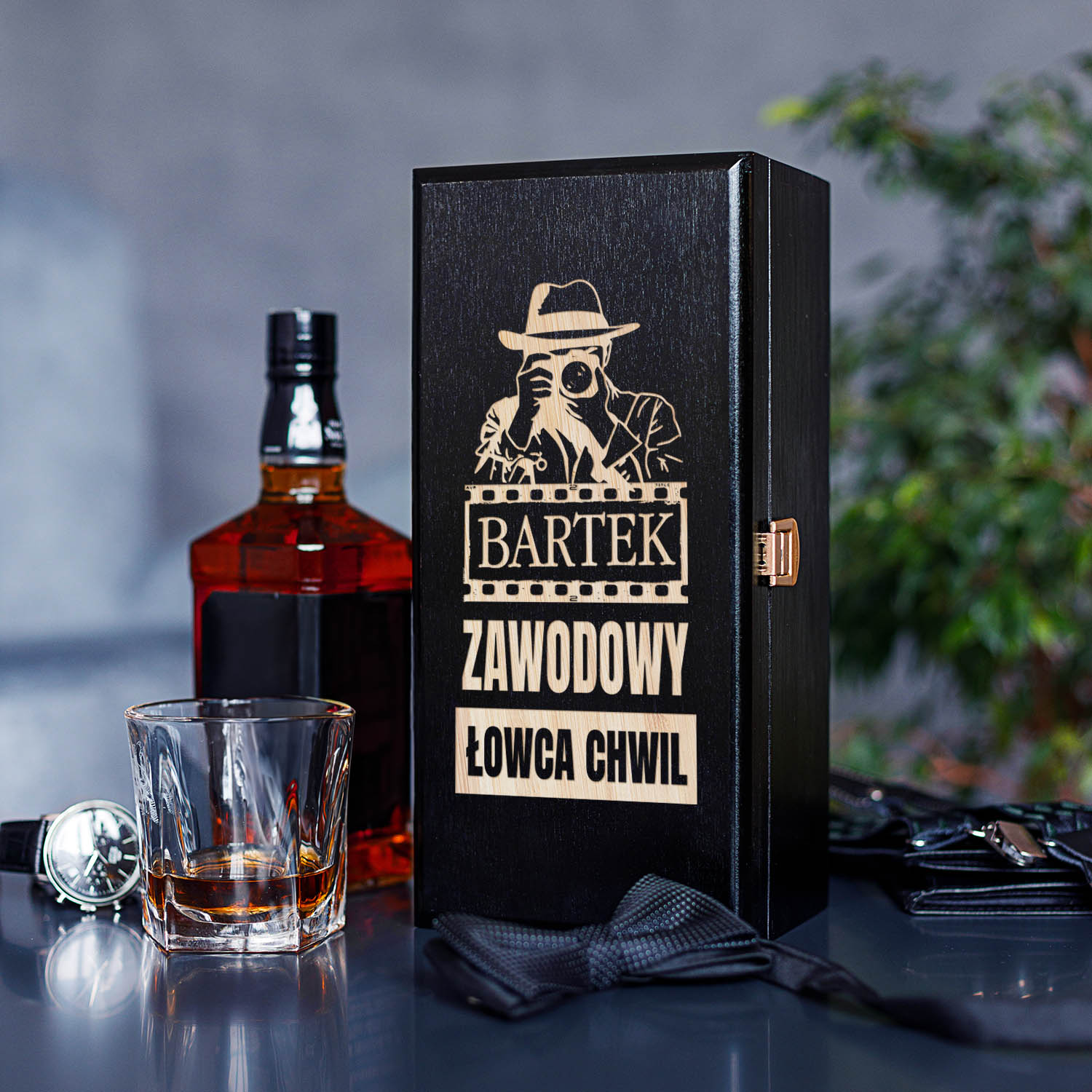 ORYGINALNA CZARNA SKRZYNKA NA ALKOHOL Z GRAWEREM - IDEALNY PREZENT DLA FOTOGRAFA