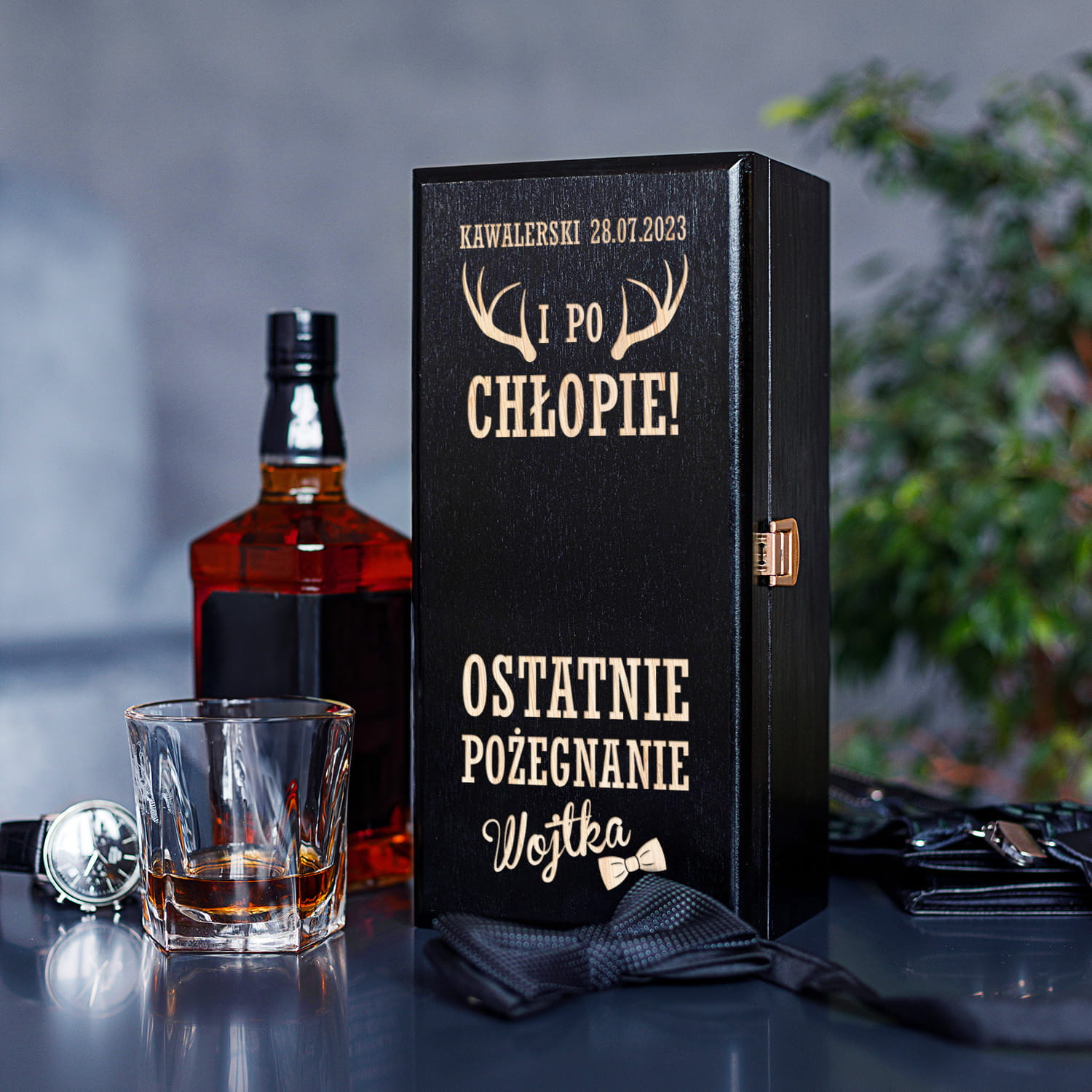 ORYGINALNA CZARNA SKRZYNKA NA ALKOHOL Z GRAWEREM - IDEALNY PREZENT NAWIECZÓR KAWALERSKI