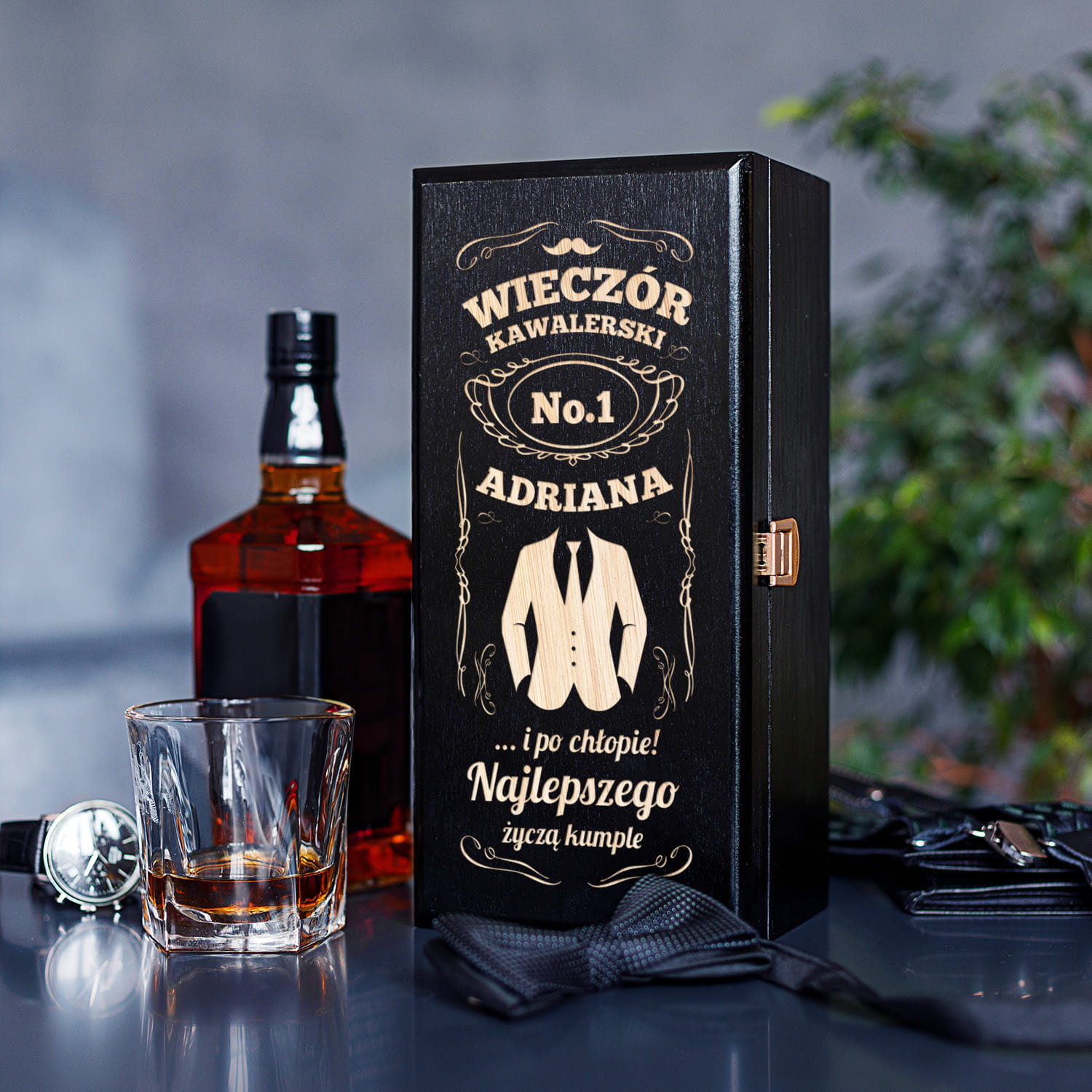 ORYGINALNA CZARNA SKRZYNKA NA ALKOHOL Z GRAWEREM - IDEALNY PREZENT NAWIECZÓR KAWALERSKI