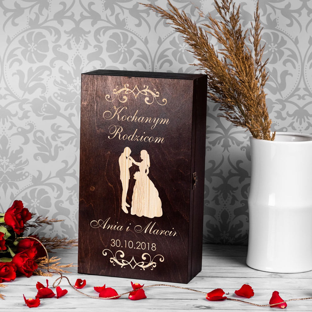 Na skrzynce wygrawerowane są imiona nowożeńców, data ślubu, oraz sylwetka Pary Młodej.