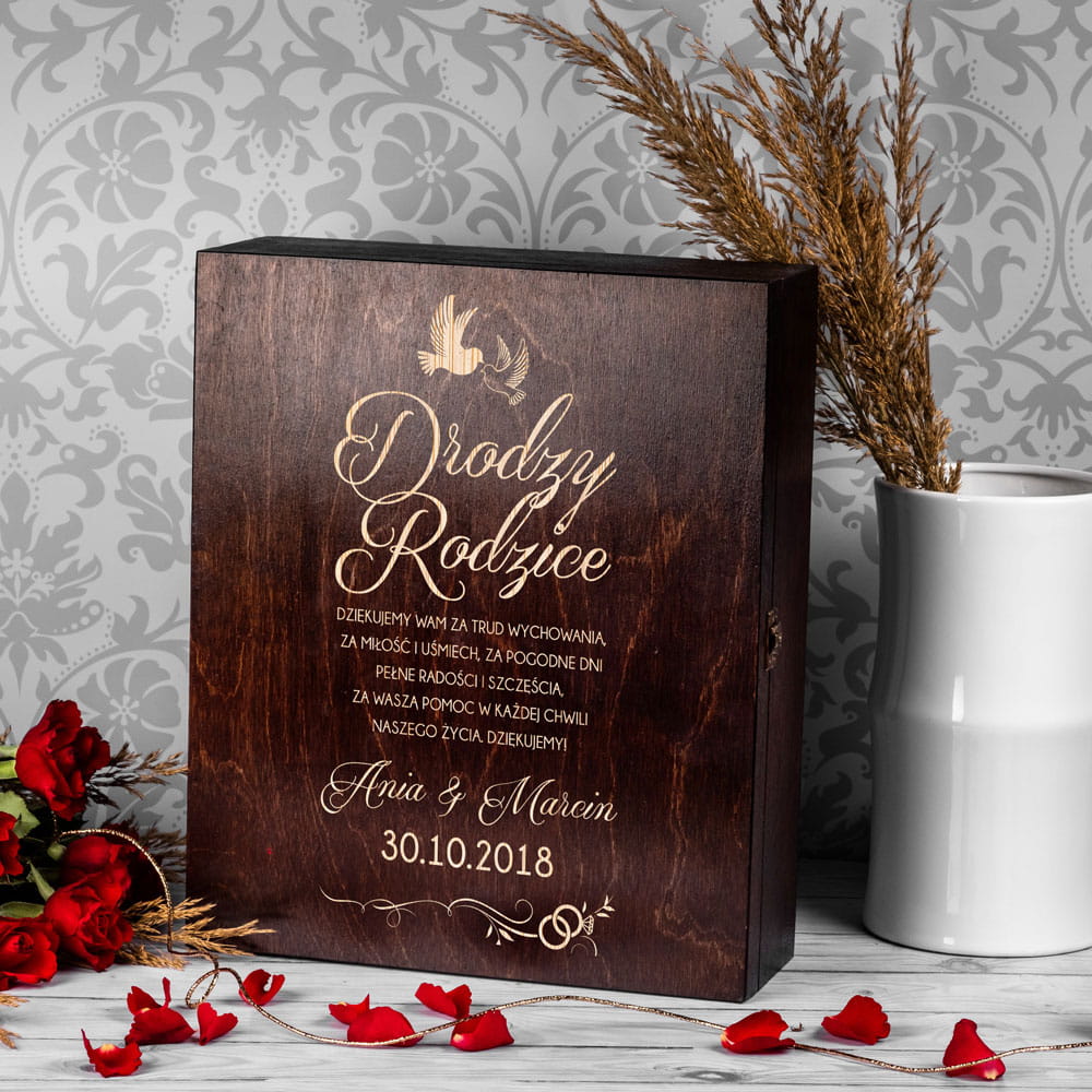 Skrzynka będzie pamiątką ślubu dla rodziców i stanie na honorowym miejscu w domu albo mieszkaniu. Elegancka skrzynka wykonana jest z drewna najwyższej jakości. Wyjątkowy grawer jest ozdobą skrzynki i pięknie odznacza się na bejcowanym drewnie.