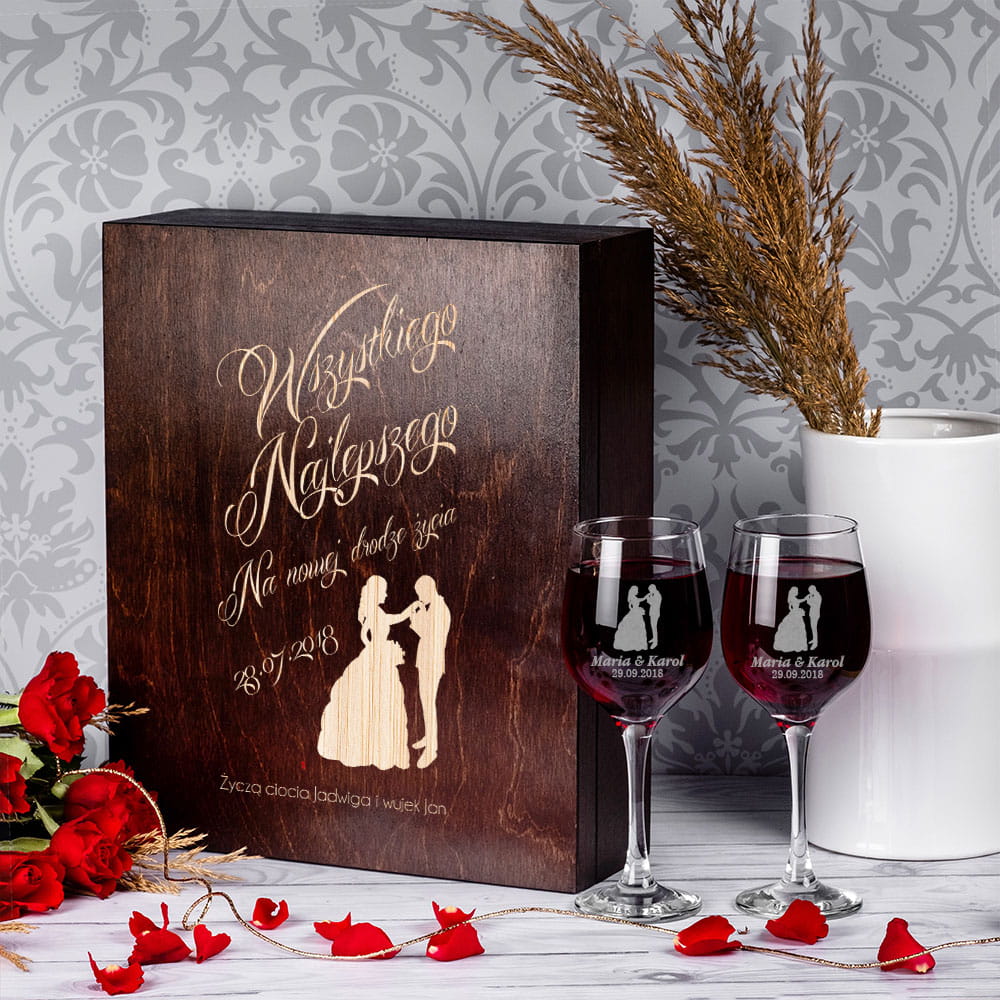 Na skrzynce wygrawerowana jest data ślubu oraz sylwetka Pary Młodej, a na kieliszkach dodatkowo imiona nowożeńców.