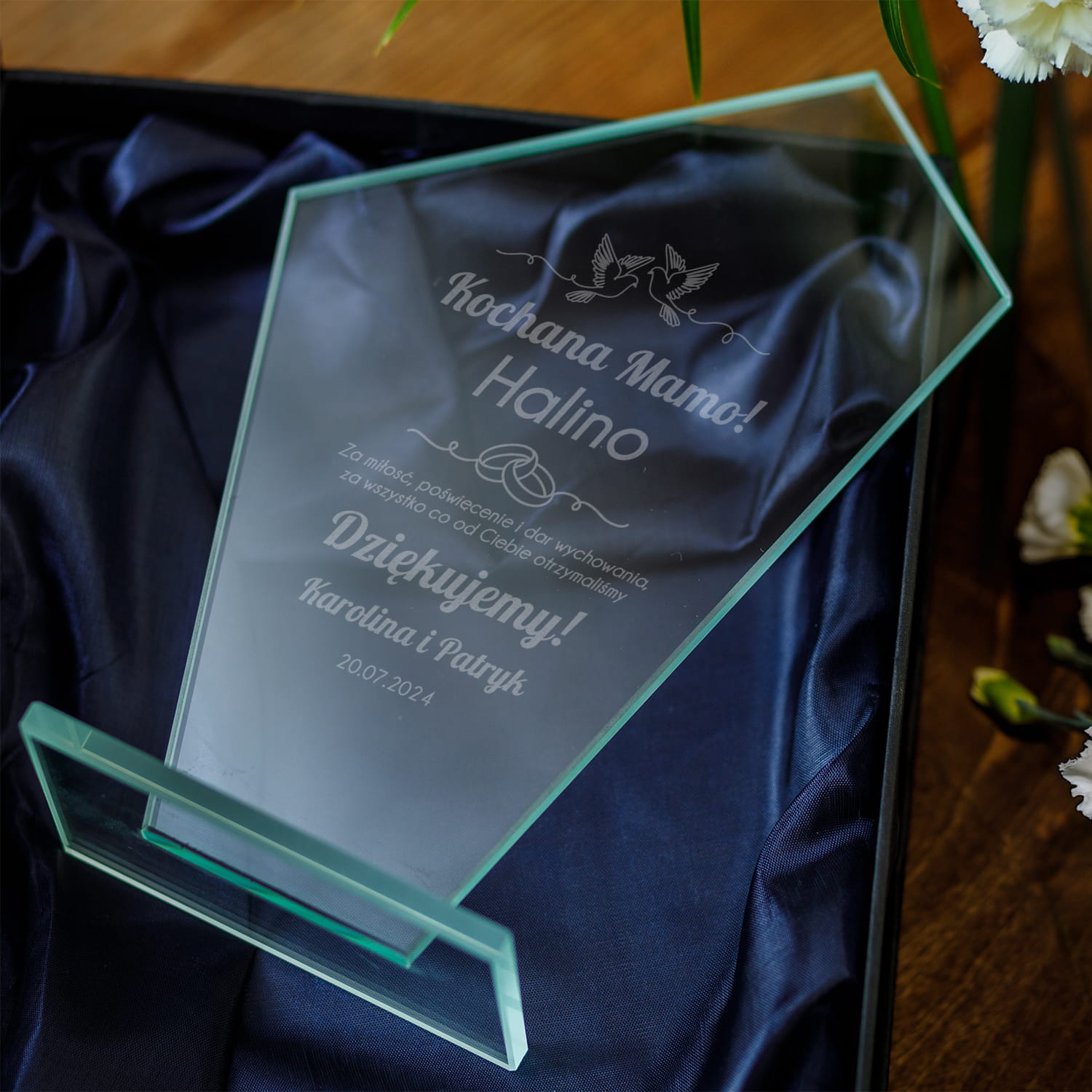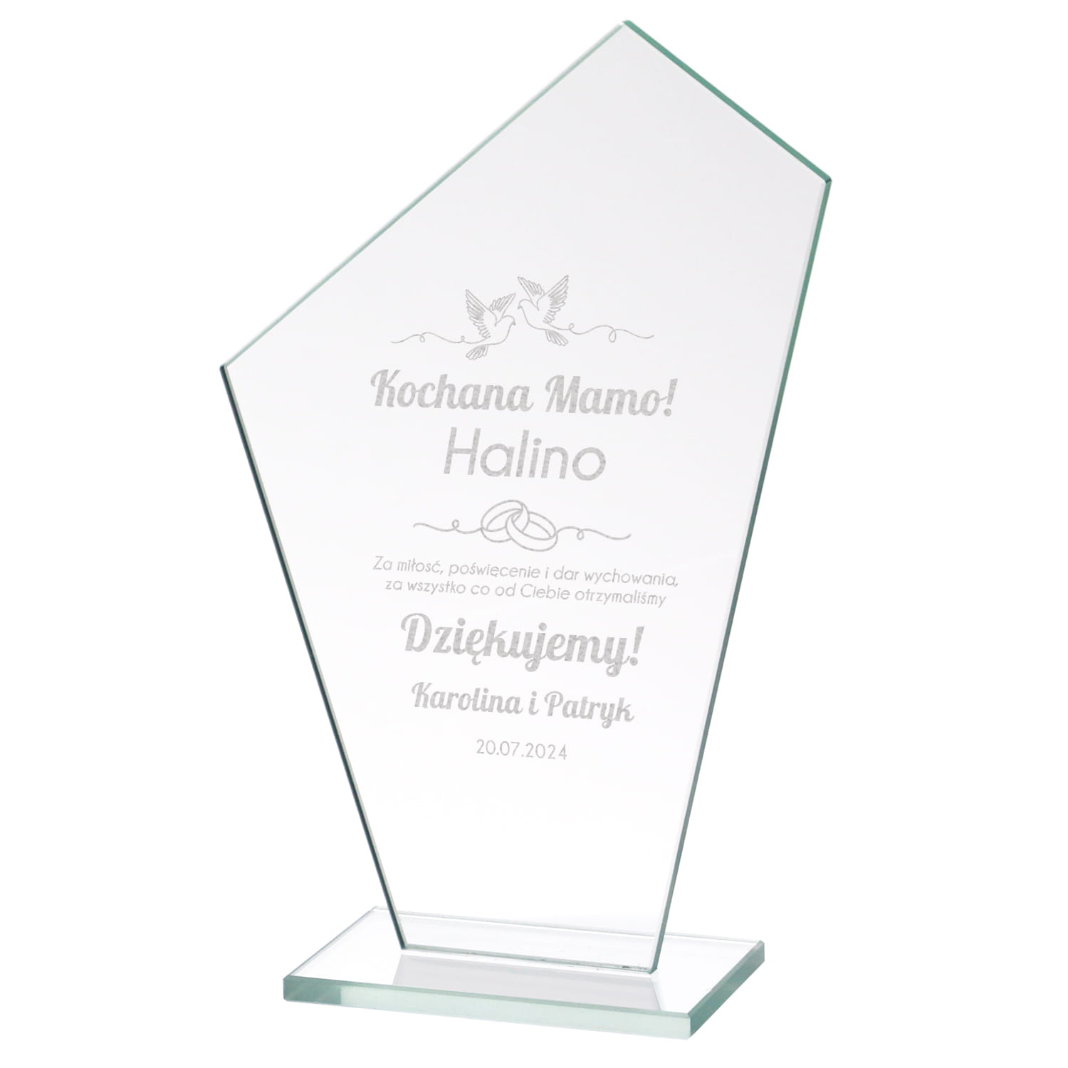 SZKLANA STATUETKA Z GRAWEREM - ELEGANCKI PREZENT PODZIĘKOWANIE DLA RODZICÓW, PODZIĘKOWANIE DLA MAMY - PODZIĘKOWANIE NA ŚLUB