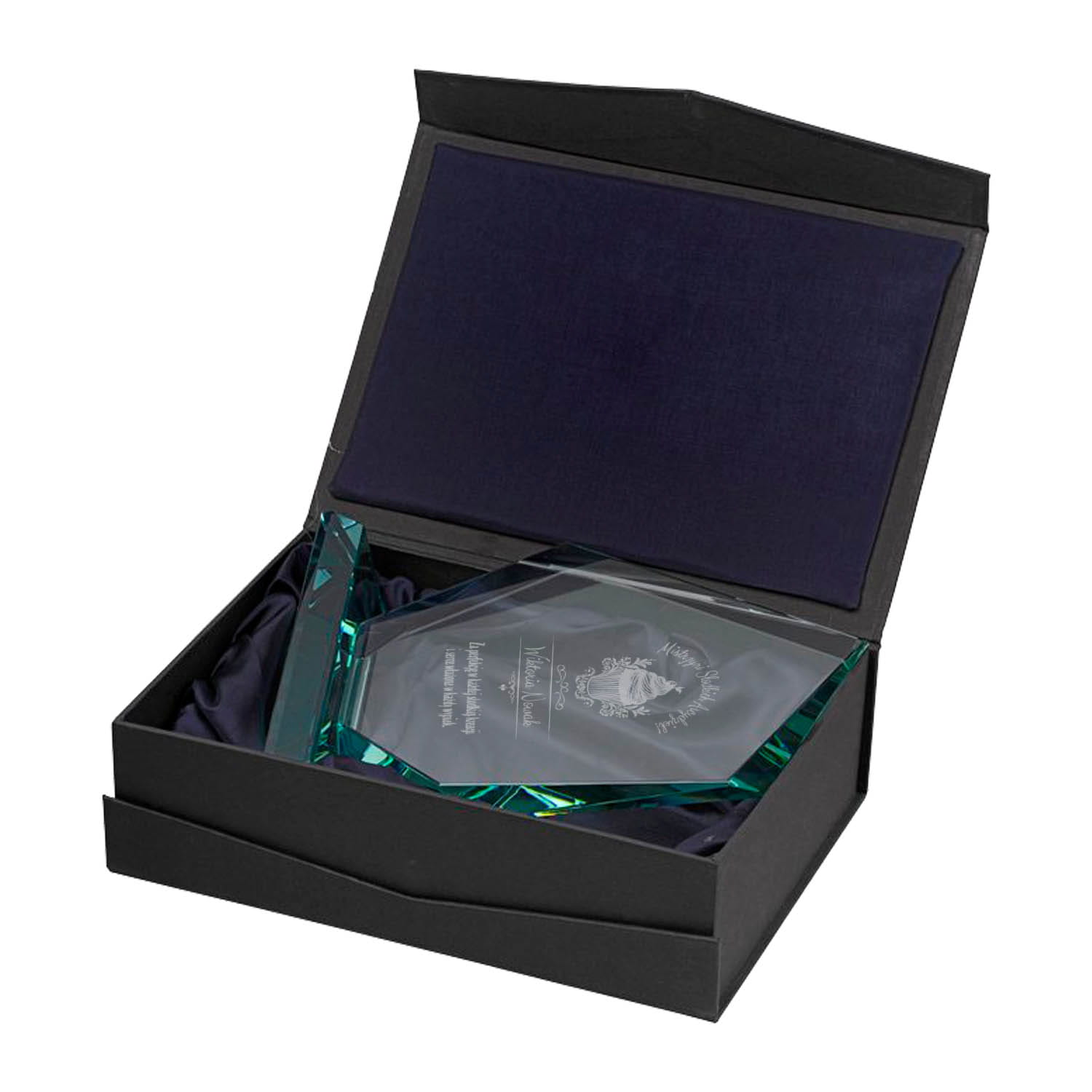 Teksty i grafiki na szklanych trofeach w naszym sklepie z prezentami nanosimy korzystając z grawerowania laserowego. Polega ono na usunięciu cienkiej warstwy z powierzchni szkła, przez co uwidoczniony zostaje surowy materiał znajdujący się pod spodem. Precyzyjna wiązka promieni laserowych wypala wybrany wzór na przedmiotach, pozostawiając eleganckie, wyraziste i trwałe dekoracje. Grawer zawsze przybierze kolor surowego materiału, a w przypadku szkła da efekt zmatowienia. Nie ma możliwości wykonania napisów i grafik w kolorze.