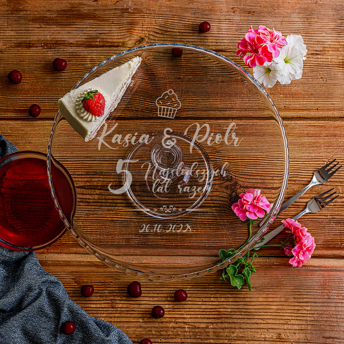 Szklana patera z grawerem na ciasto to idealny prezent dla fanów pieczenia lub gotowania z okazji rocznicy ślubu! Grawerowana patera na tort na rocznicę to oryginalny prezent który zrobi wrażenie na obdarowanych, a zarazem będzie praktyczny.