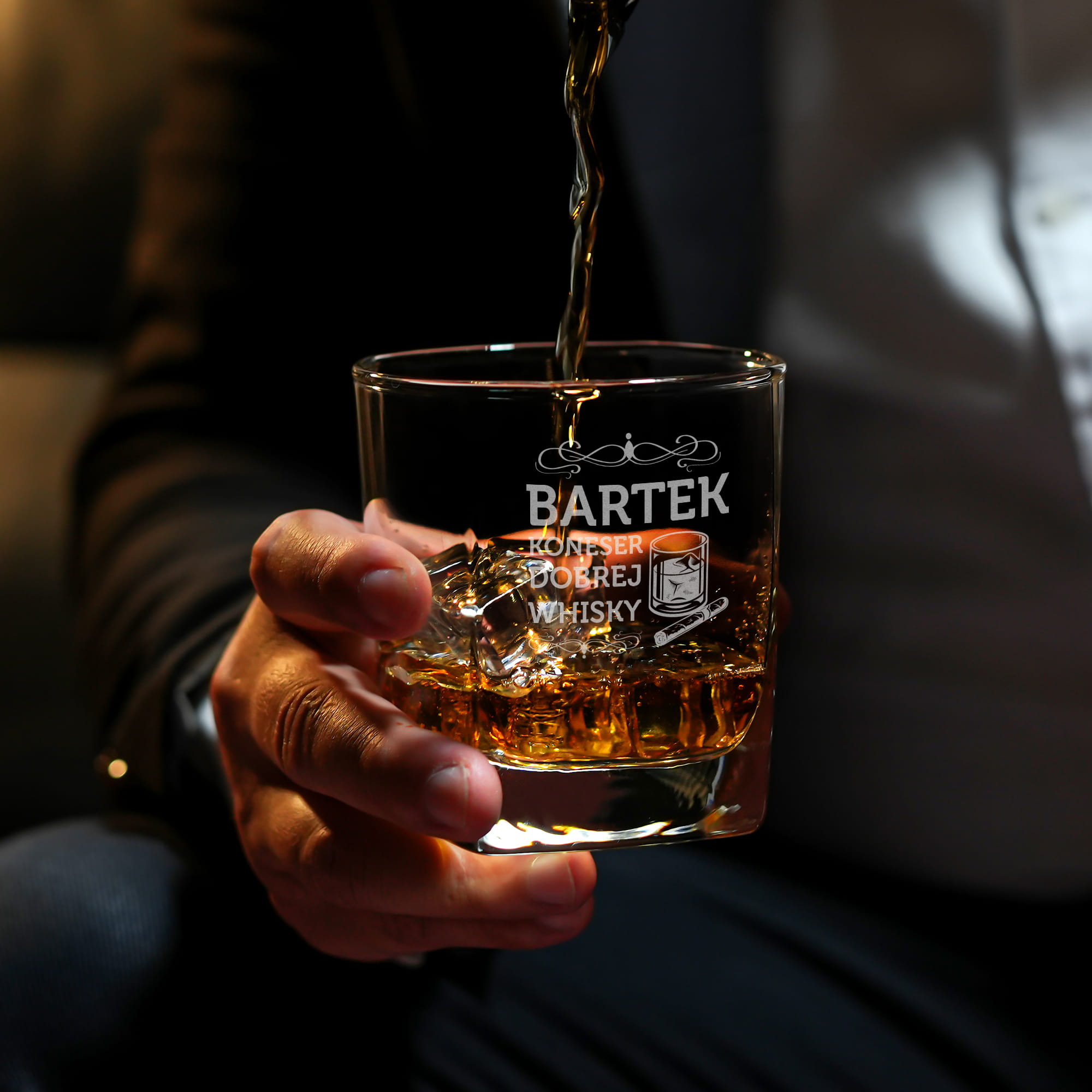 Szklanka do Whisky z Grawerem - Zestaw Prezentowy dla Faceta z Imieniem - Szklanka + Karty do Gry + Kostki Chłodzące - Koneser Dobrej Whisky