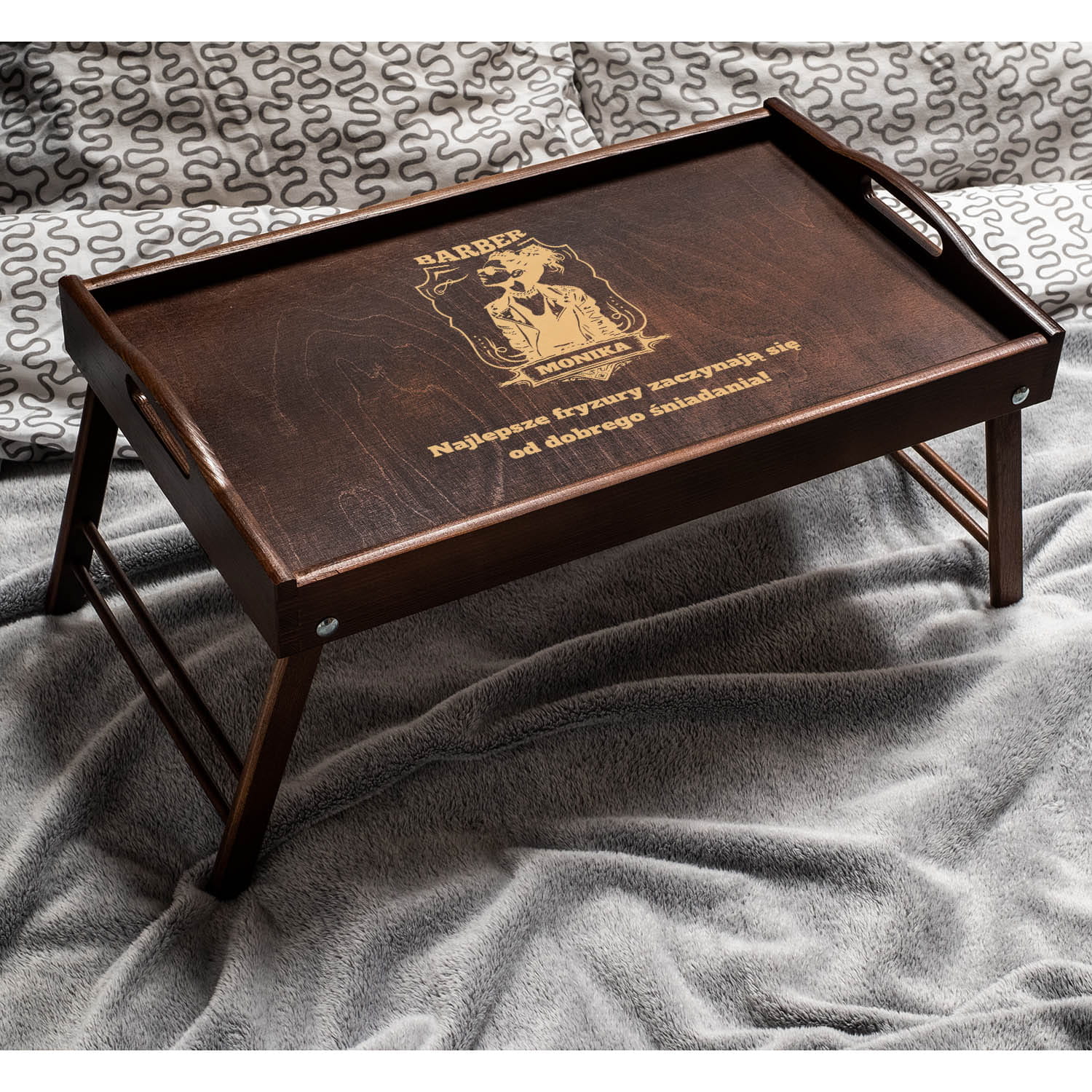 Składany stolik śniadaniowy jest łatwy do przechowywania i idealny do codziennego użytku lub na specjalne okazje. To praktyczny i stylowy upominek, który z pewnością przypadnie do gustu każdemu barberowi, będąc jednocześnie doskonałym narzędziem pracy i miejscem na relaks.