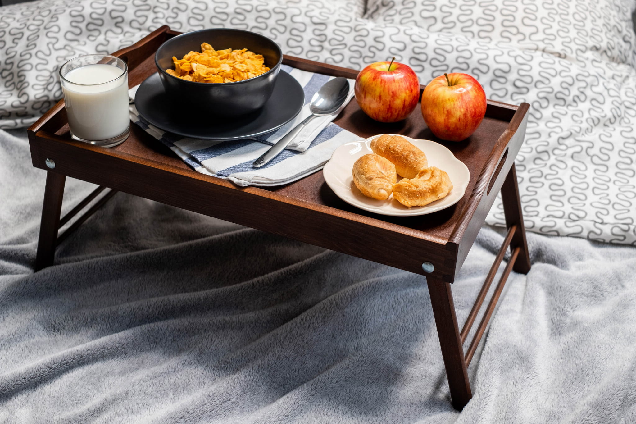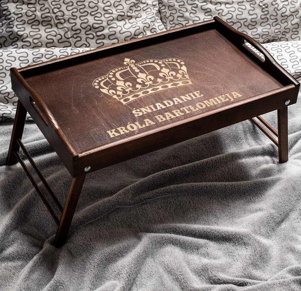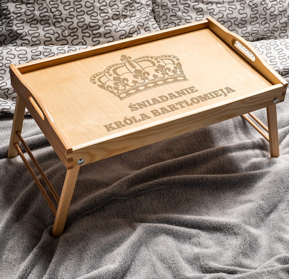 Taca śniadaniowa z grawerem posiada praktyczne uchwyty, dzięki czemu łatwo ją przenieść z kuchni do sypialni albo salonu. Doskonale sprawdzi się w roli podstawki pod laptopa i dzięki niej można wygodnie pracować lub oglądać filmy i seriale w łóżku albo na kanapie. Składany stolik śniadaniowy jest łatwy w przechowywaniu i może być używany na co dzień lub na specjalne okazje.