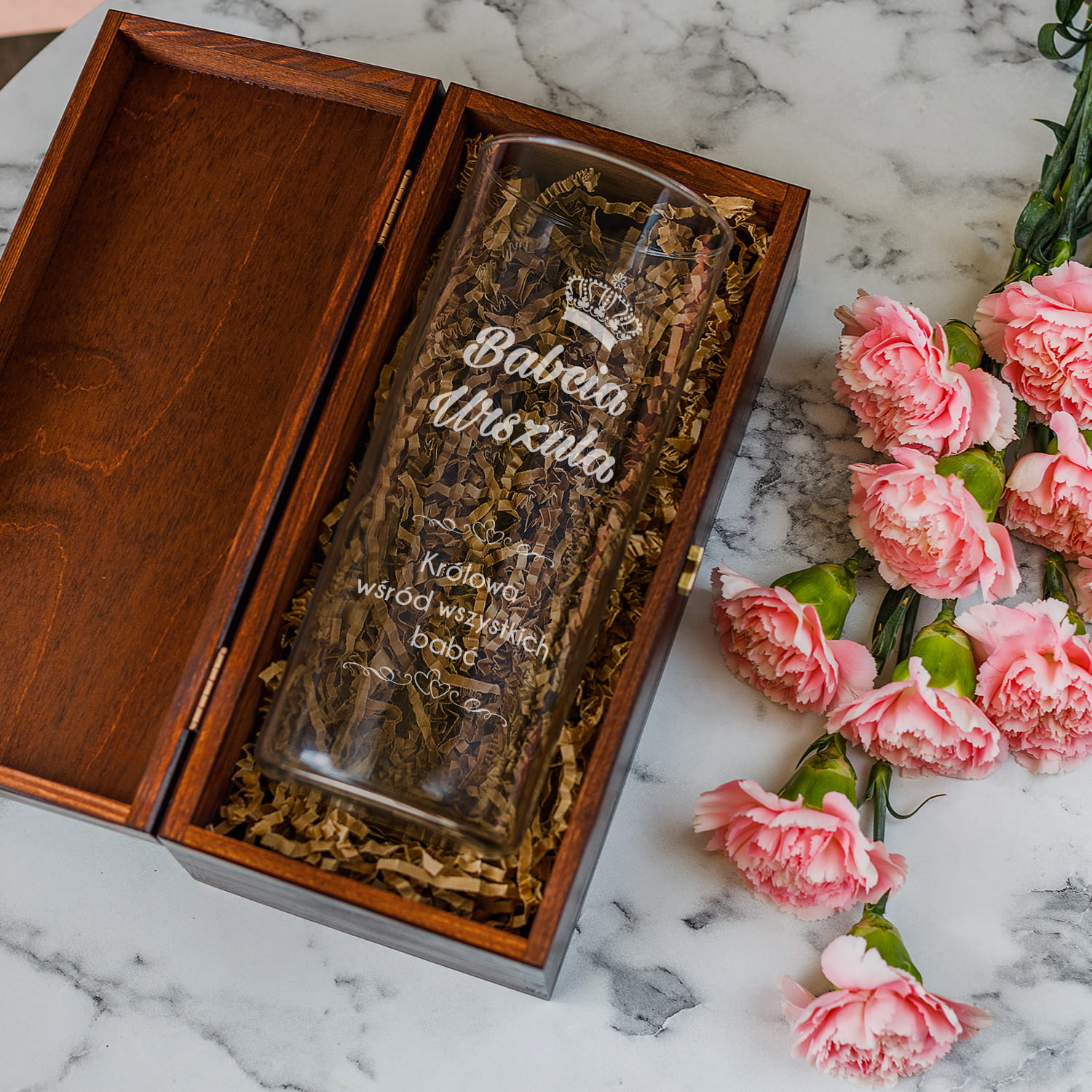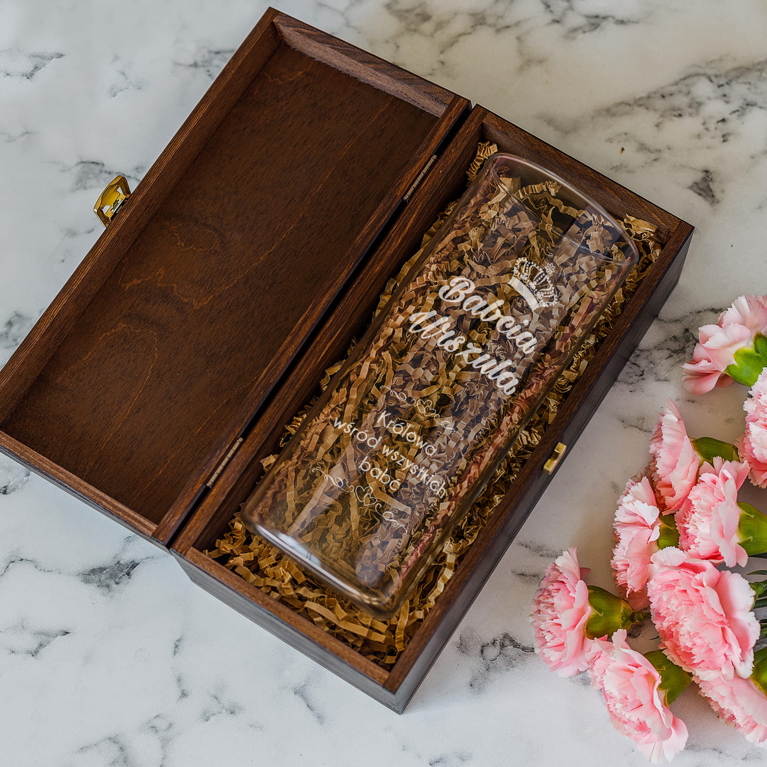 SZKLANY WAZON NA KWIATY W ELEGANCKIEJ SKRZYNCE Z GRAWEREM DLA BABCI - IDEALNY PREZENT NA DZIEŃ BABCI!