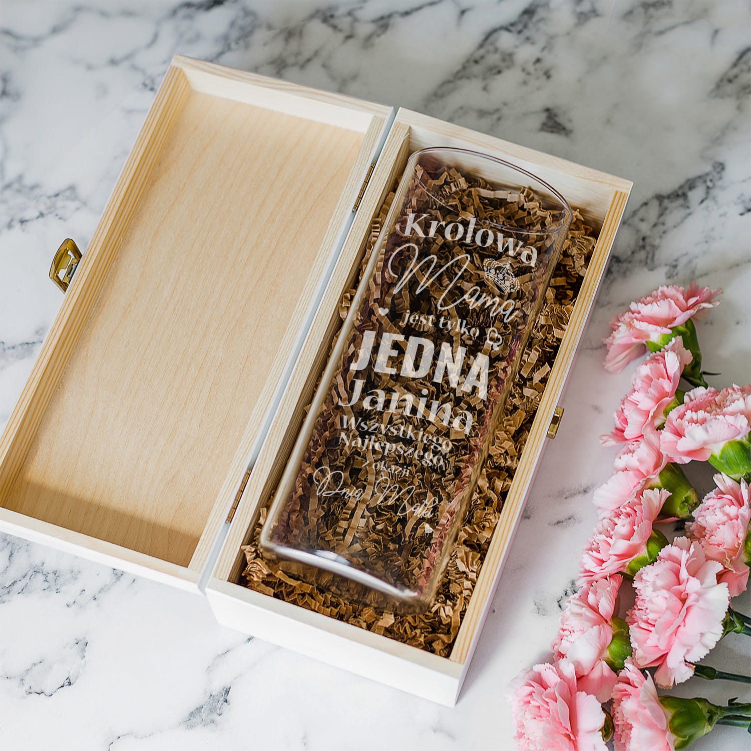 ⭐ Szklany wazon cylinder w drewnianej skrzynce z grawerem, pozwoli Ci wręczyć oryginalny upominek w taki sposób, że nie tylko on sam będzie prezentem, ale także jego opakowanie.