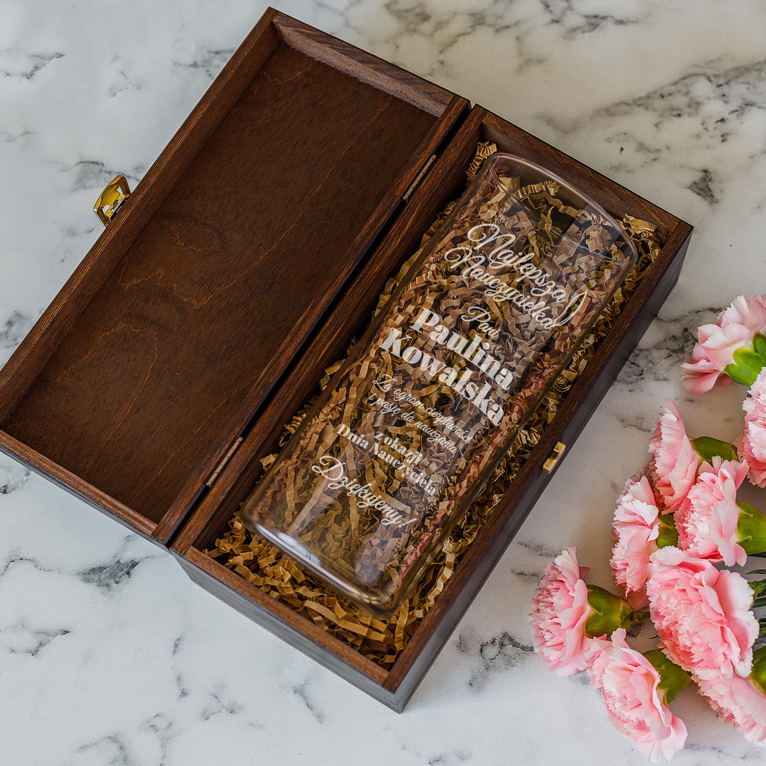 Szklany wazon cylinder w drewnianej skrzynce z grawerem, pozwoli Ci wręczyć oryginalny upominek w taki sposób, że nie tylko on sam będzie prezentem, ale także jego opakowanie.